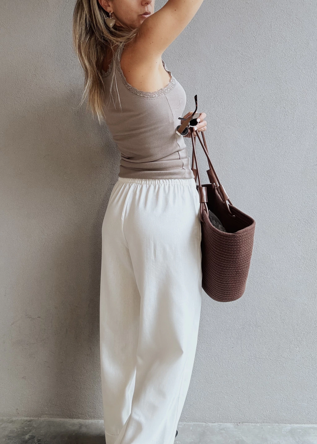 Pantalón recto con cintura elástica y falzo lazo. Posee bolsillos laterales, vainillas al frente y atrás es liso.