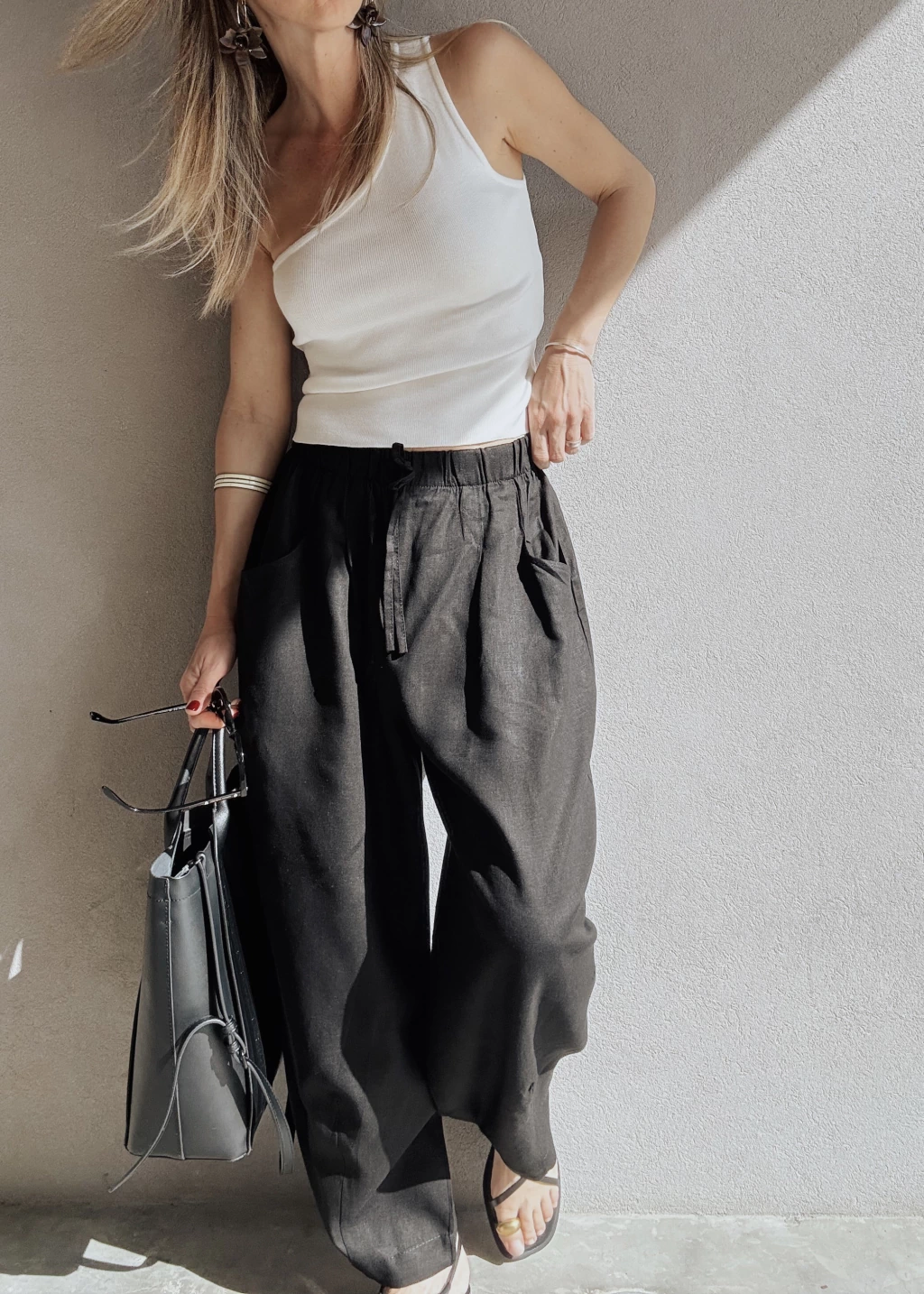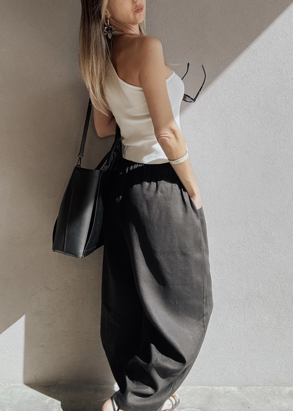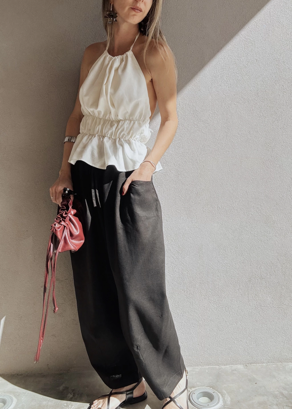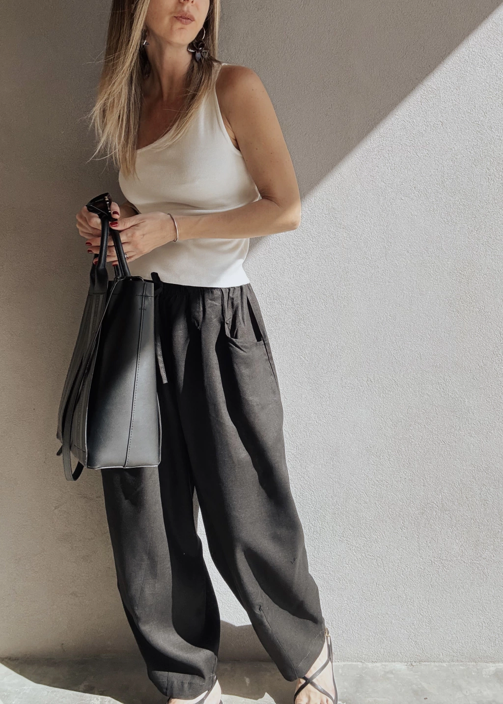 Pantalón de corte barril, tipo baggy, con ancha cintura elástica y falzo lazo al tono al frente. Posee pinzas que dan mucha amplitud, bolsillos delanteros y una pinza en el tobillo que lo afina.