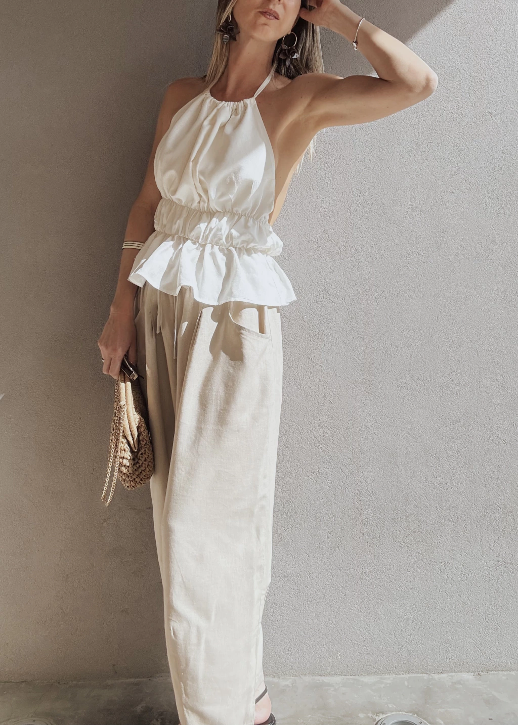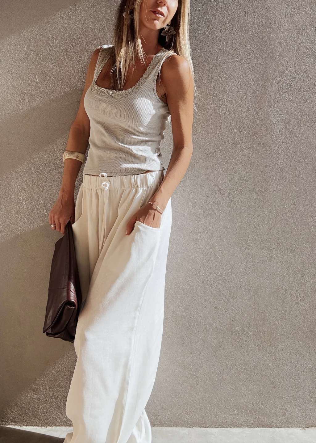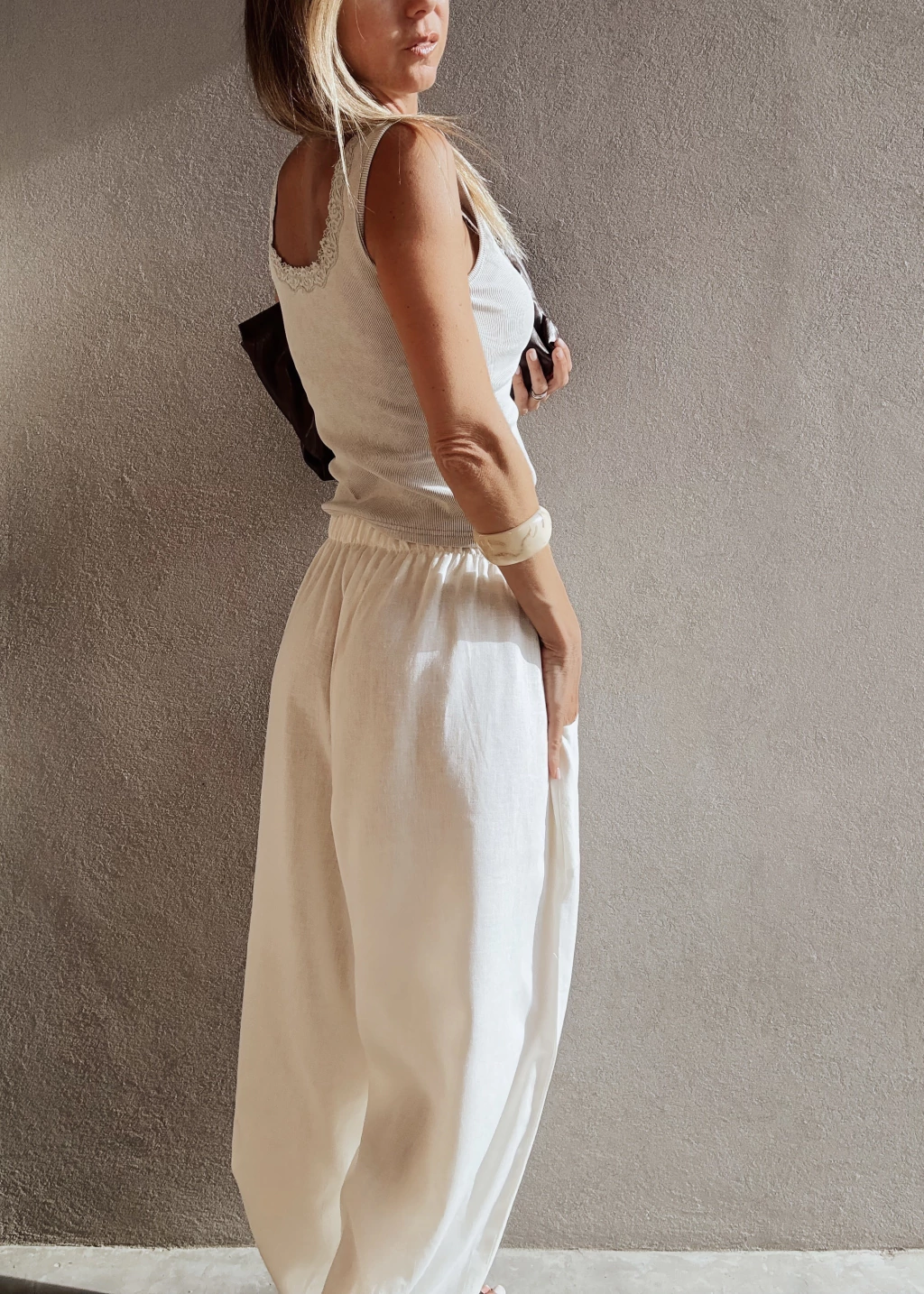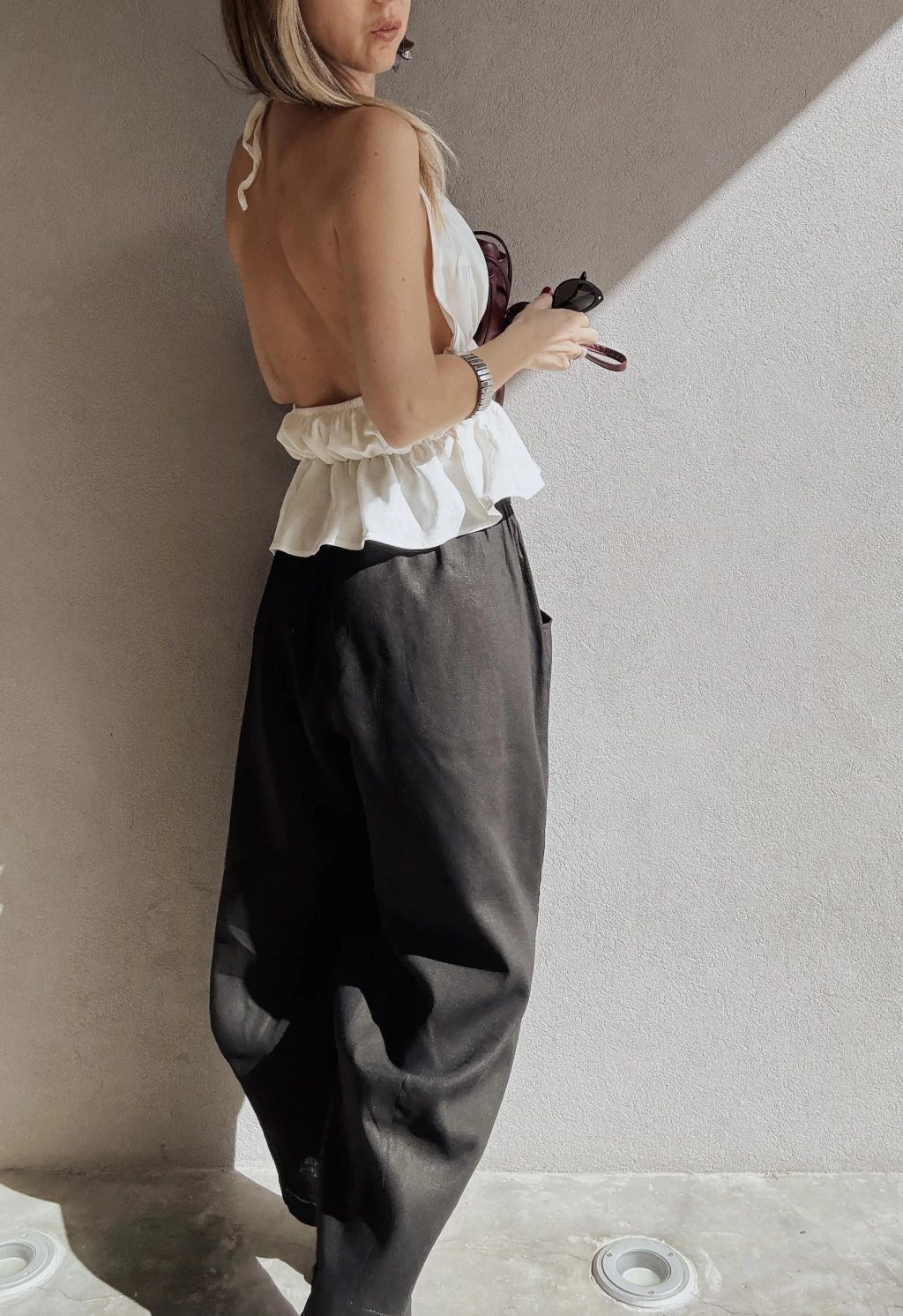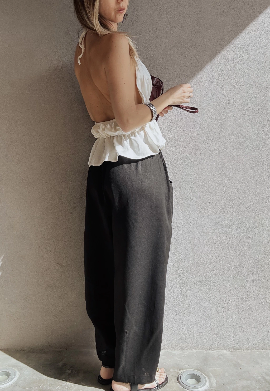 Pantalón de corte barril, tipo baggy, con ancha cintura elástica y falzo lazo al tono al frente. Posee pinzas que dan mucha amplitud, bolsillos delanteros y una pinza en el tobillo que lo afina.