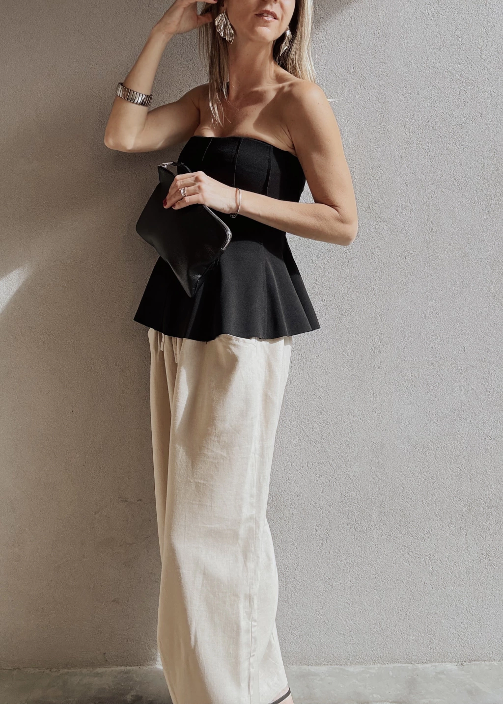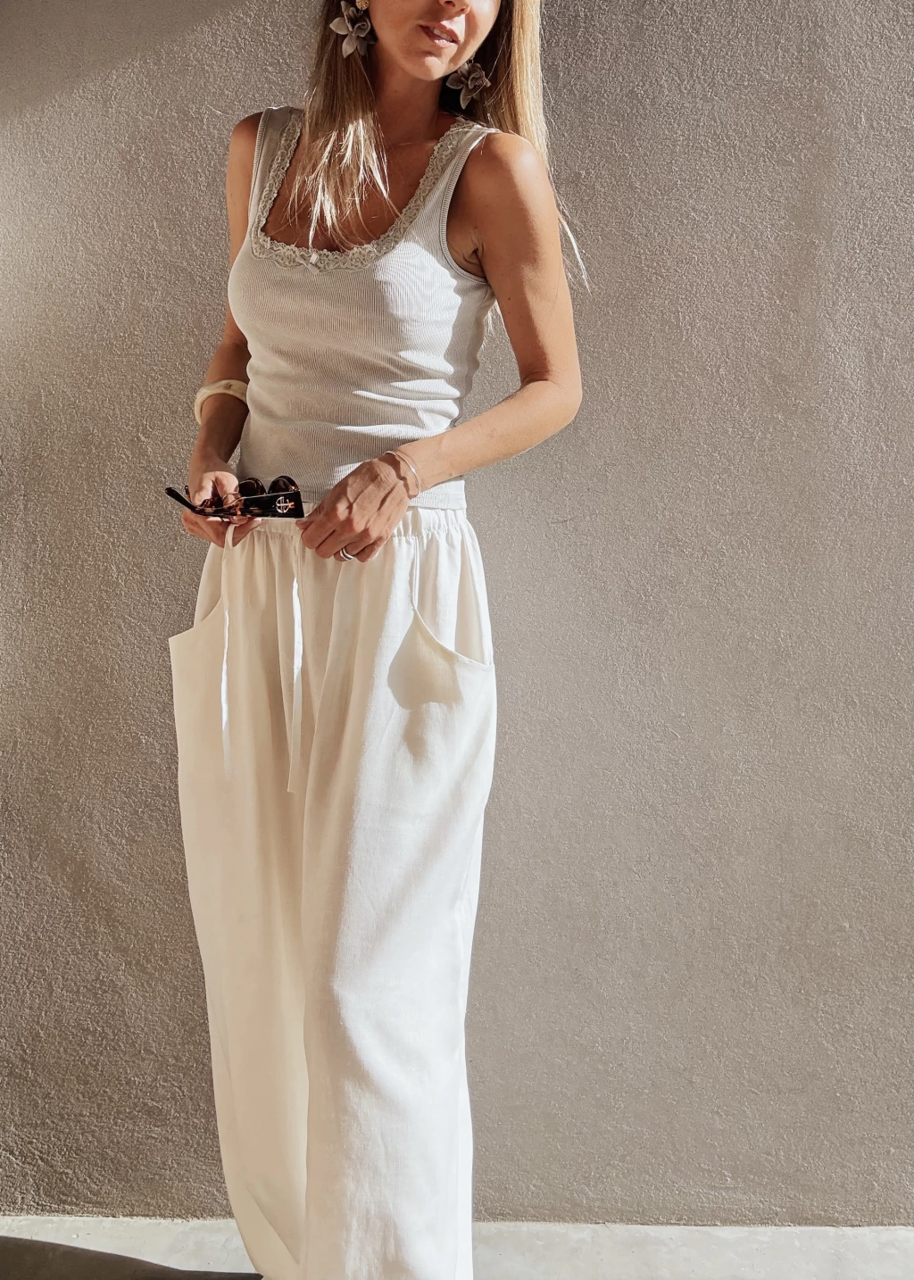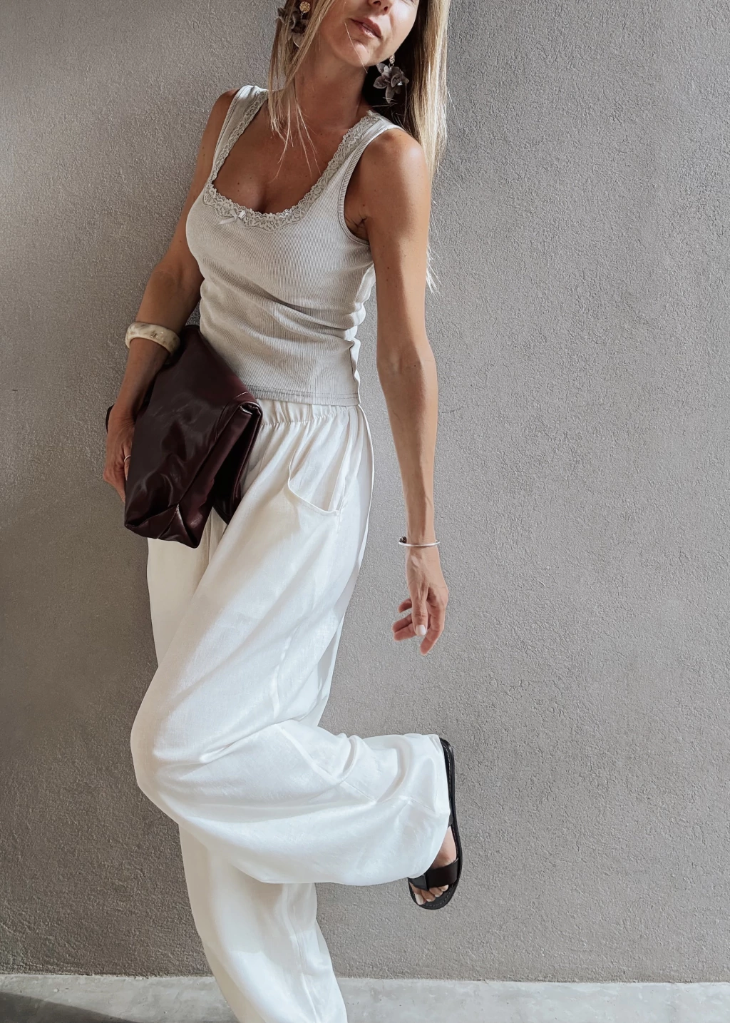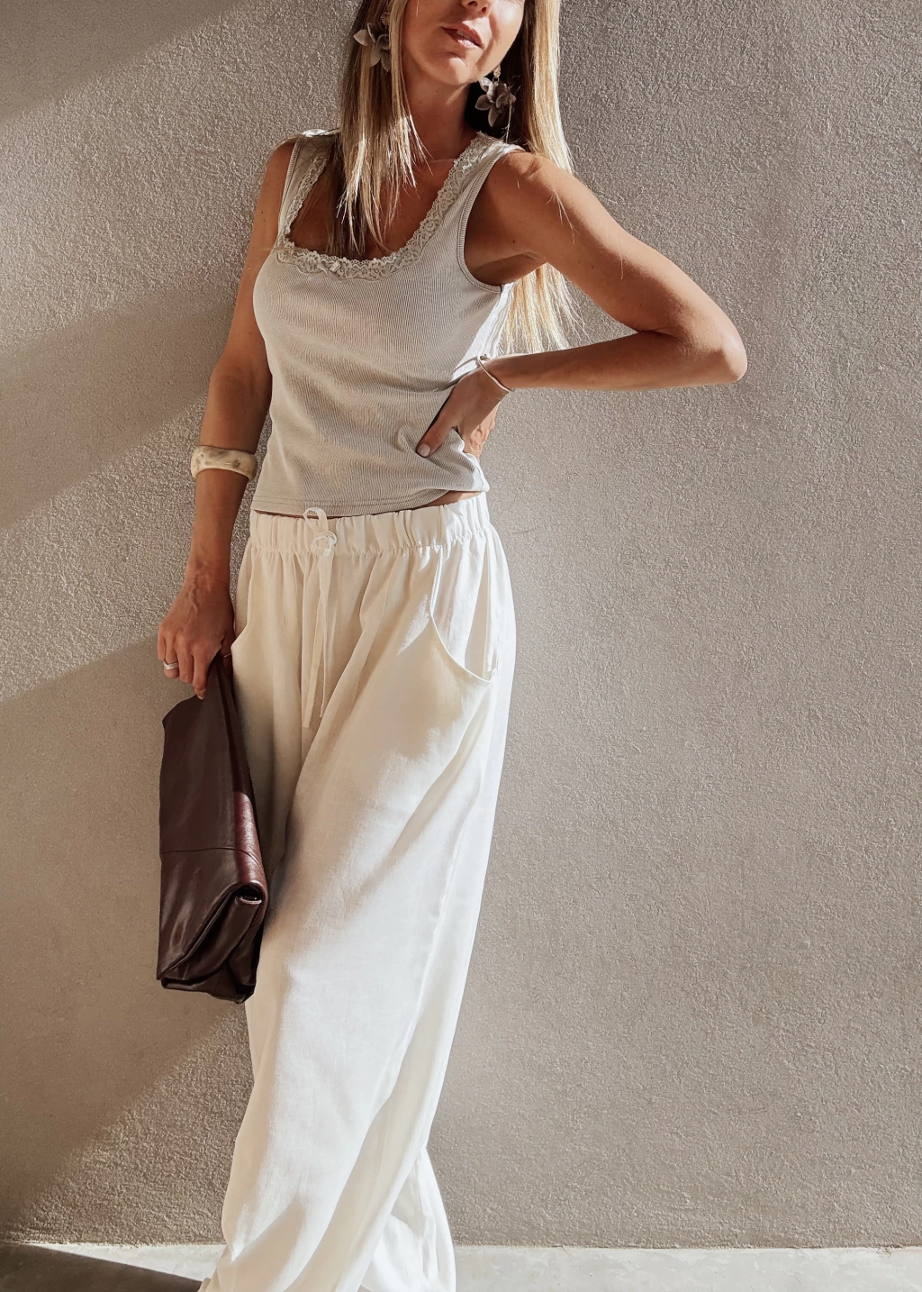 Pantalón de corte barril, tipo baggy, con ancha cintura elástica y falzo lazo al tono al frente. Posee pinzas que dan mucha amplitud, bolsillos delanteros y una pinza en el tobillo que lo afina.