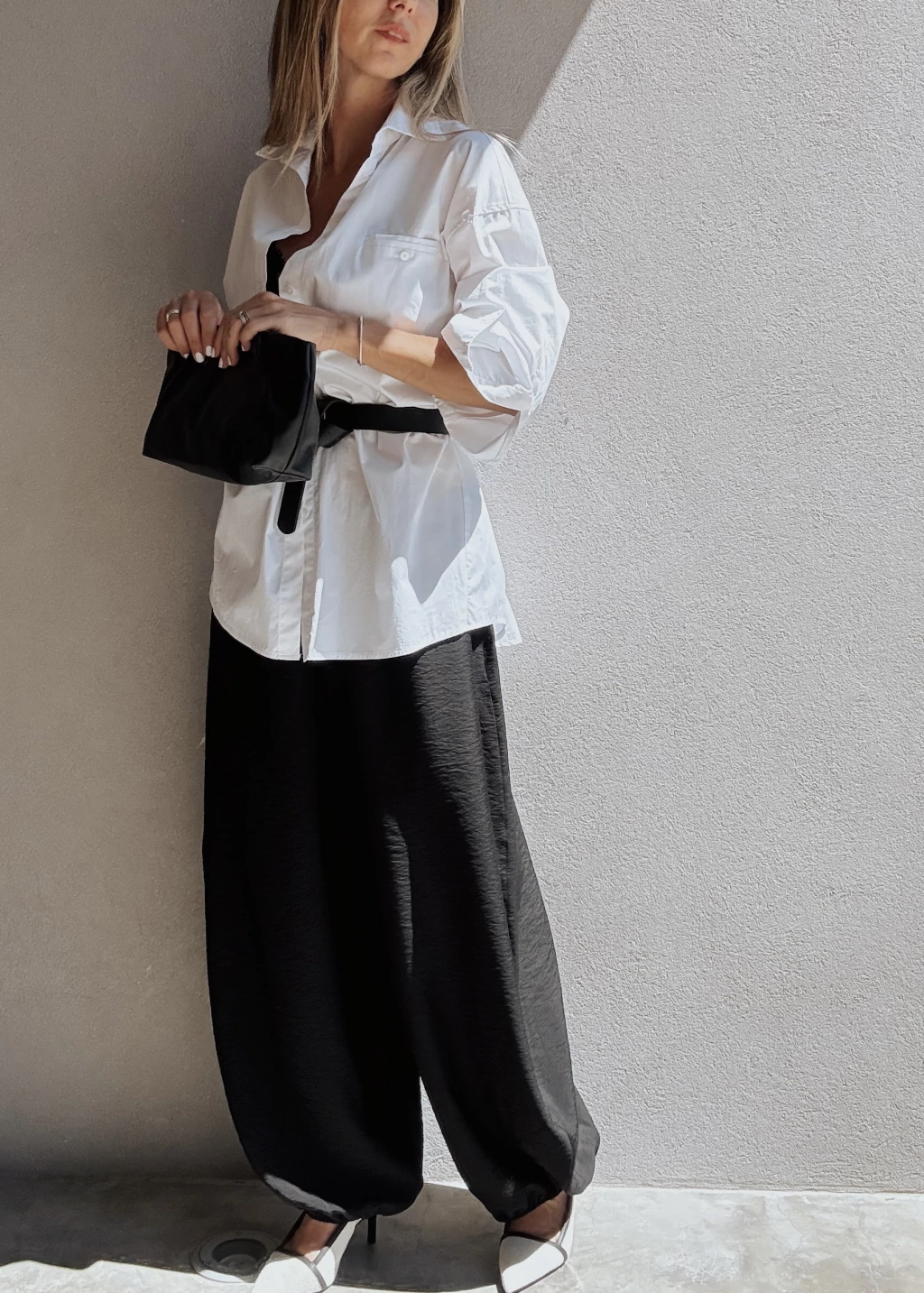 Pantalón tipo aladín con cintura elastizada. Piernas amplias con volumen y terminación fruncida en los puños. Calce relajado y liviano, ideal para looks frescos y cómodos. Posee bolsillos frontales invisibles.