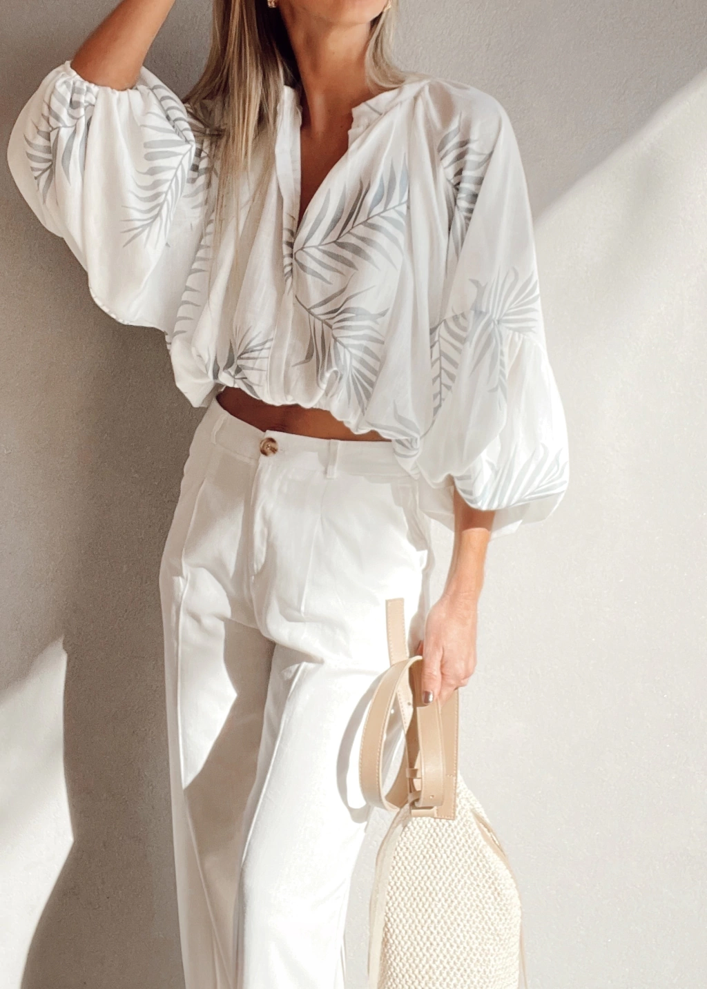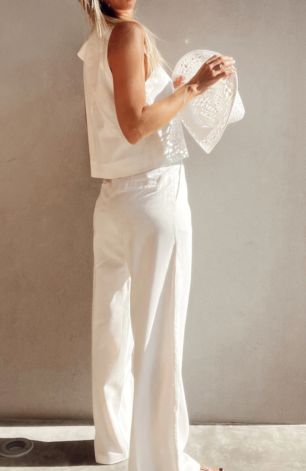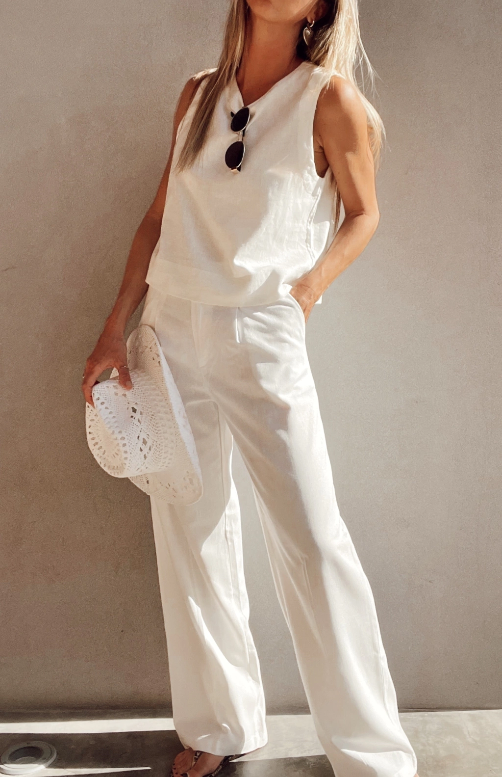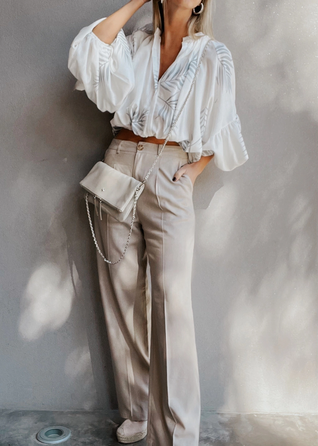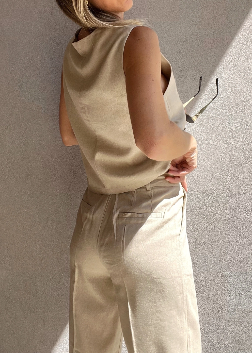 Pantalón recto tipo sastre con 1 pinza al frente y bolsillos laterales. Posee presillas en la cintura y botón. Falsos bolsillos traseros.