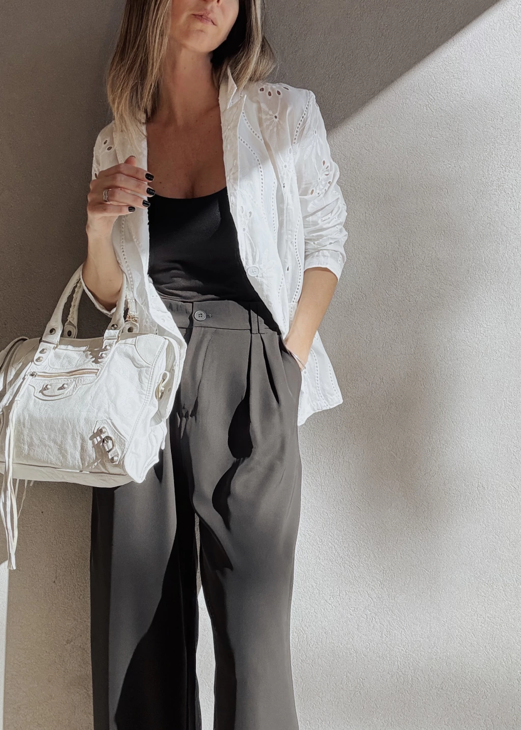 Pantalón tipo sastre con pinzas, wide leg tipo palazzo. Posee presillas en la cintura y botón al tono, parte trasera de la cintura elástica.