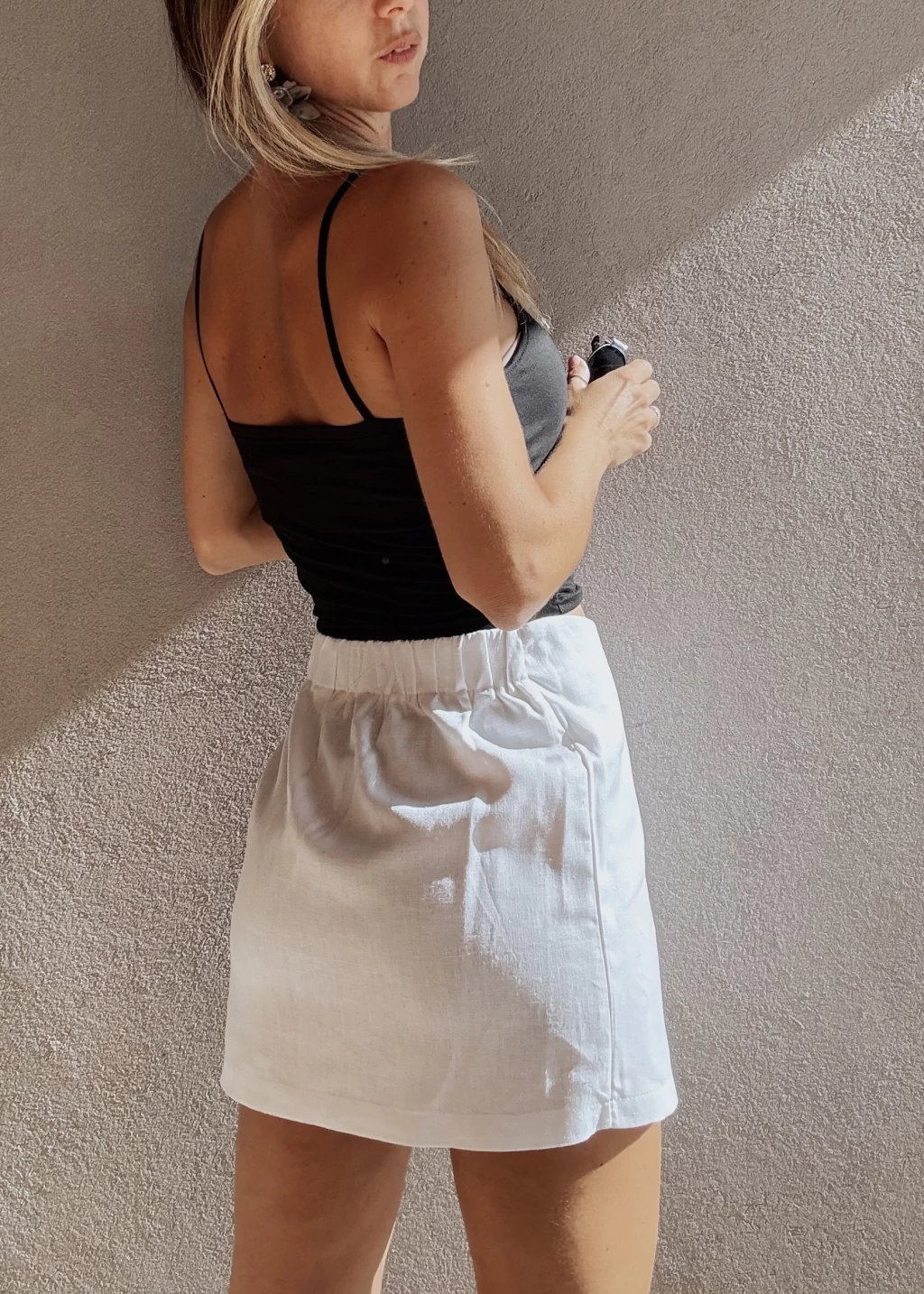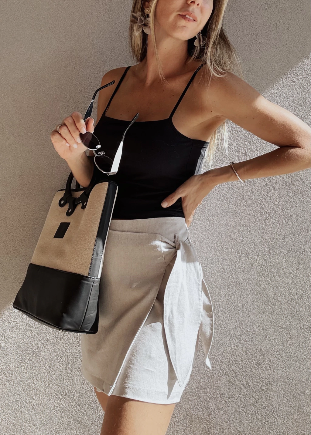 Pollera tipo falda envolvente portafolio con lazo frontal de corte recto. Posee elástico atrás.