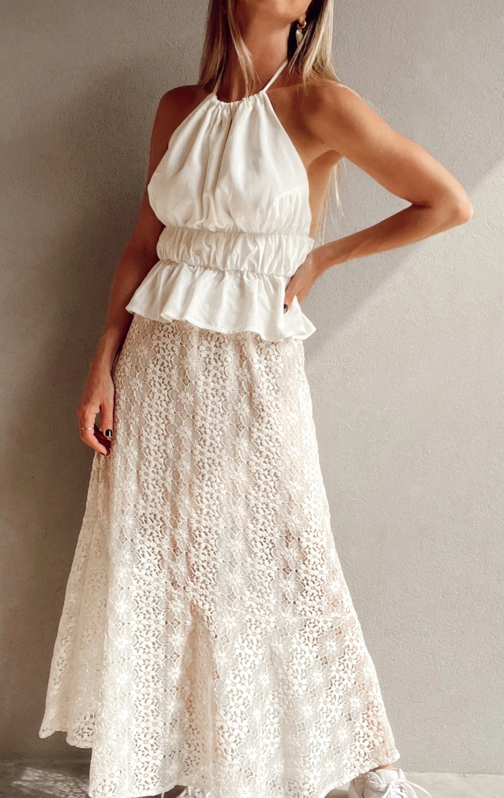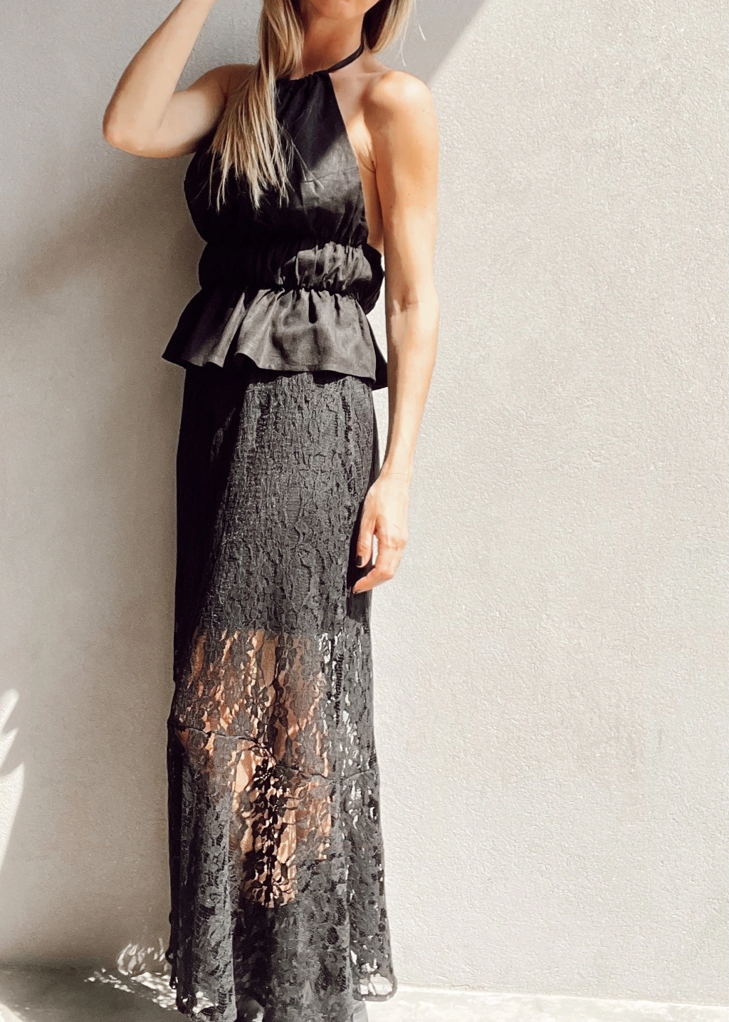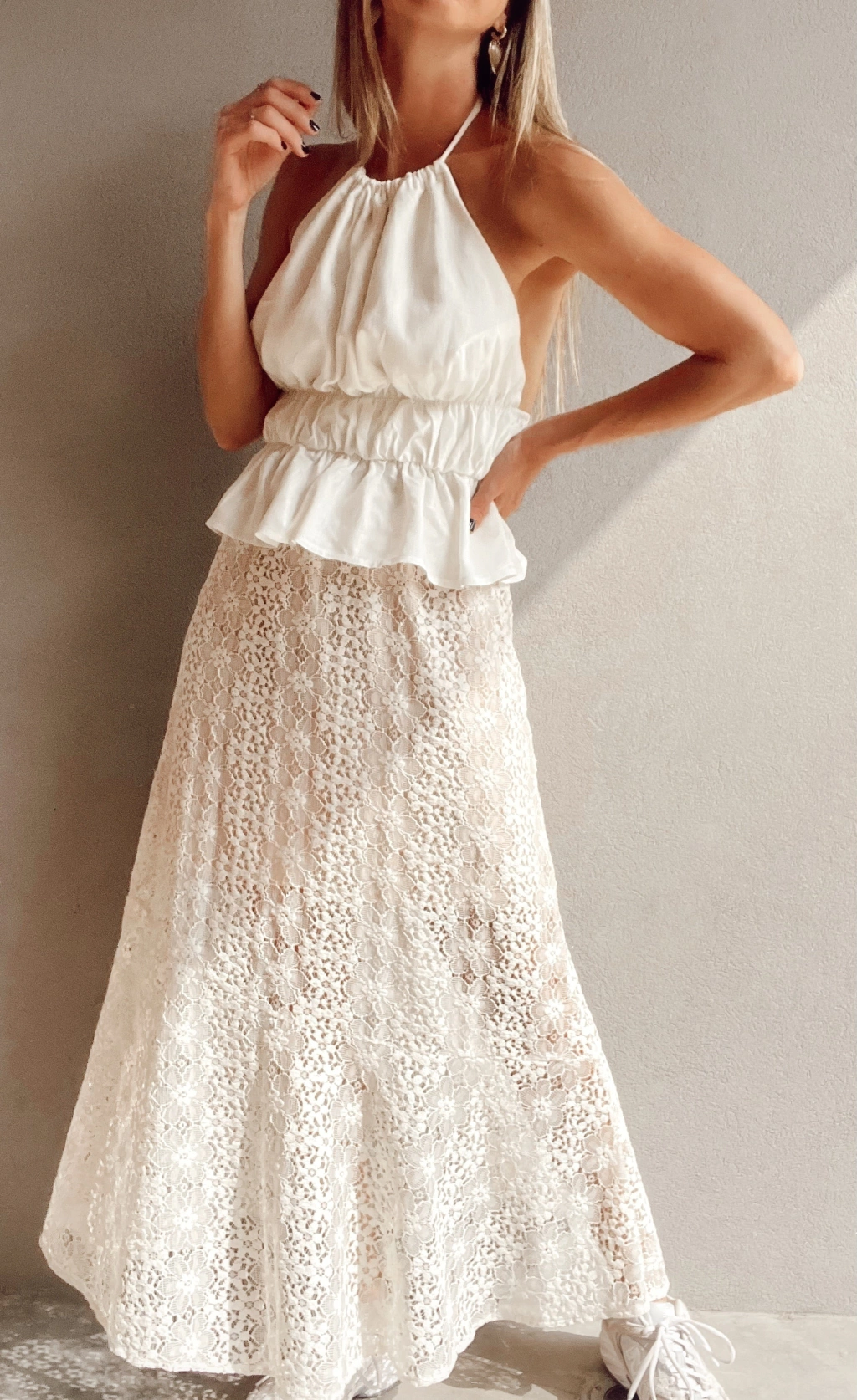 Pollera larga de encaje con cintura elástica. Posee una costura irregular a la altura de la rodilla generando gran volado abajo. Posee un forro corto, siendo la parte inferior traslucida.