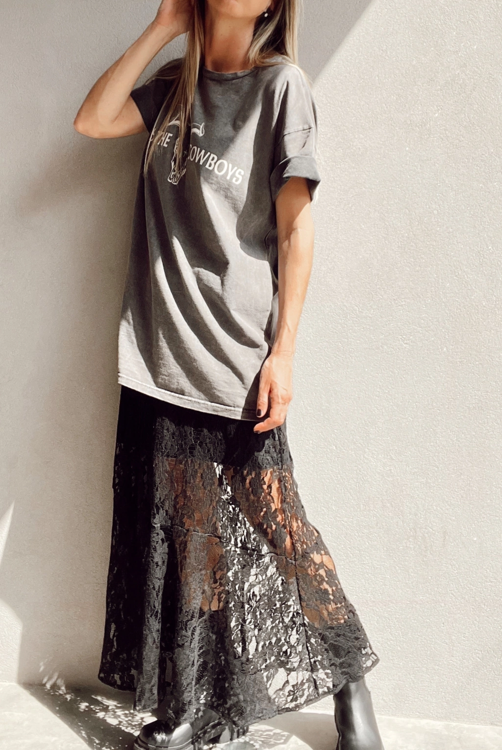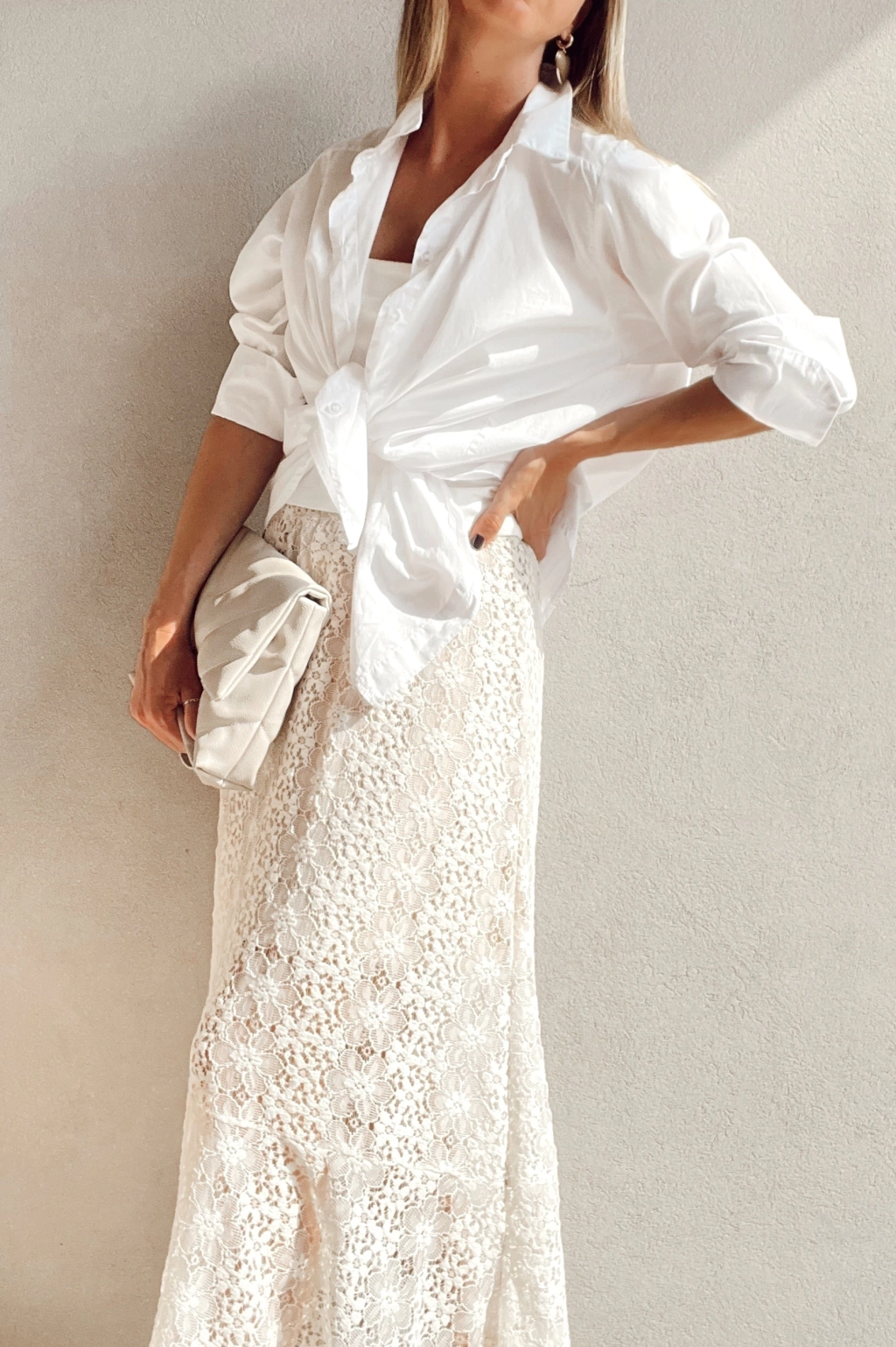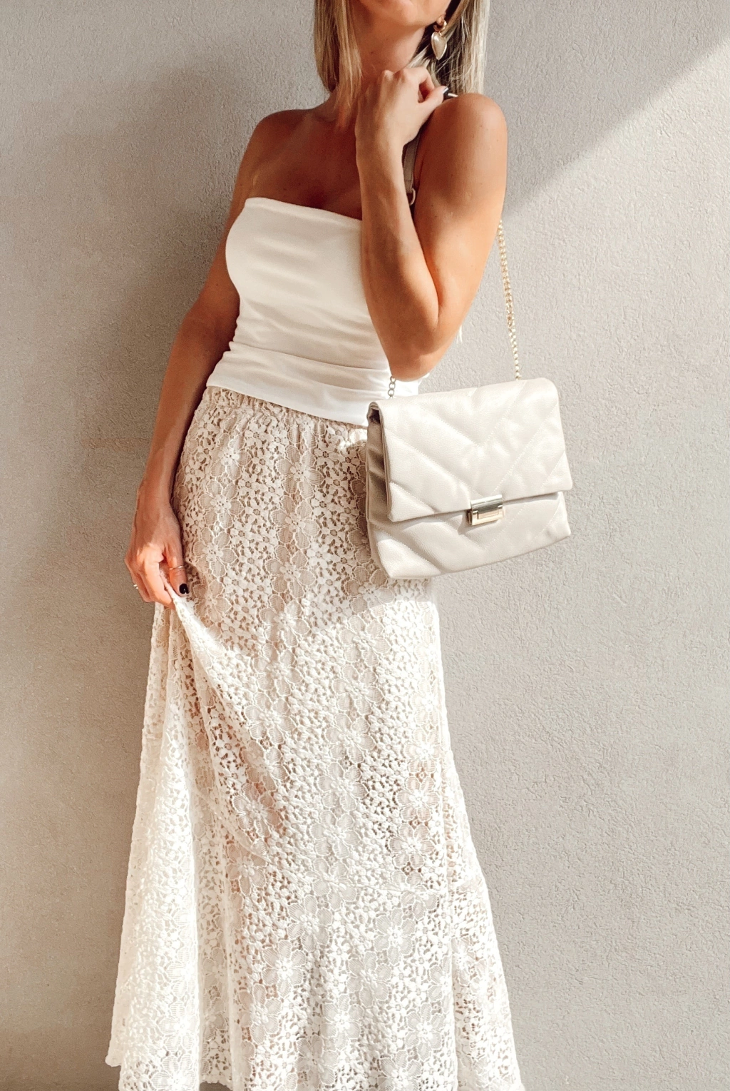 Pollera larga de encaje con cintura elástica. Posee una costura irregular a la altura de la rodilla generando gran volado abajo. Posee un forro corto, siendo la parte inferior traslucida.