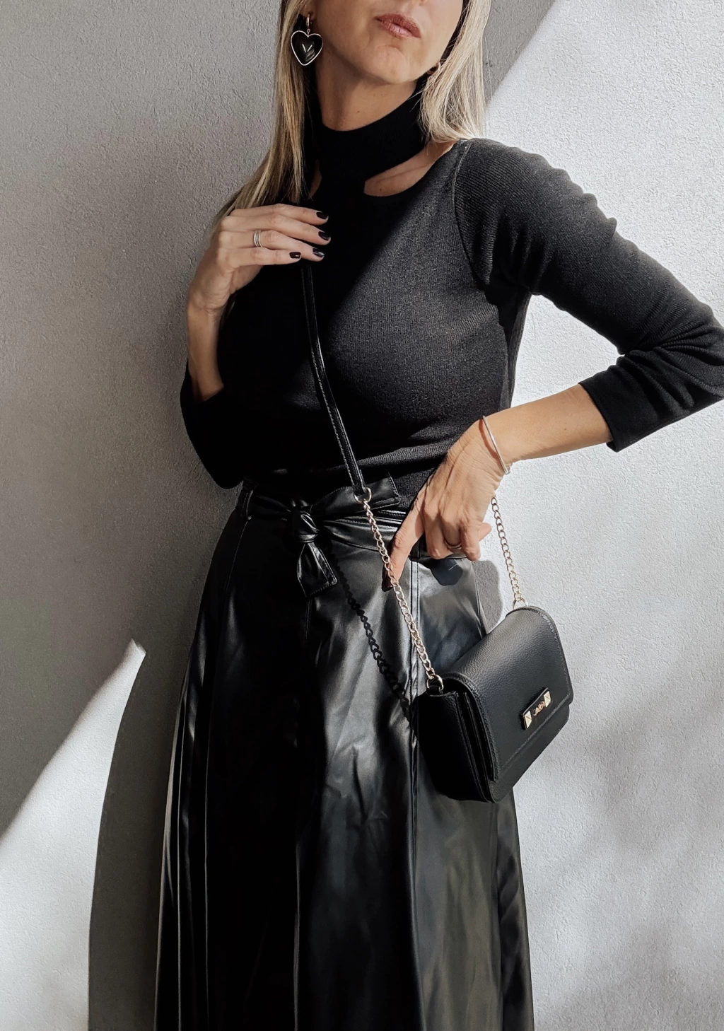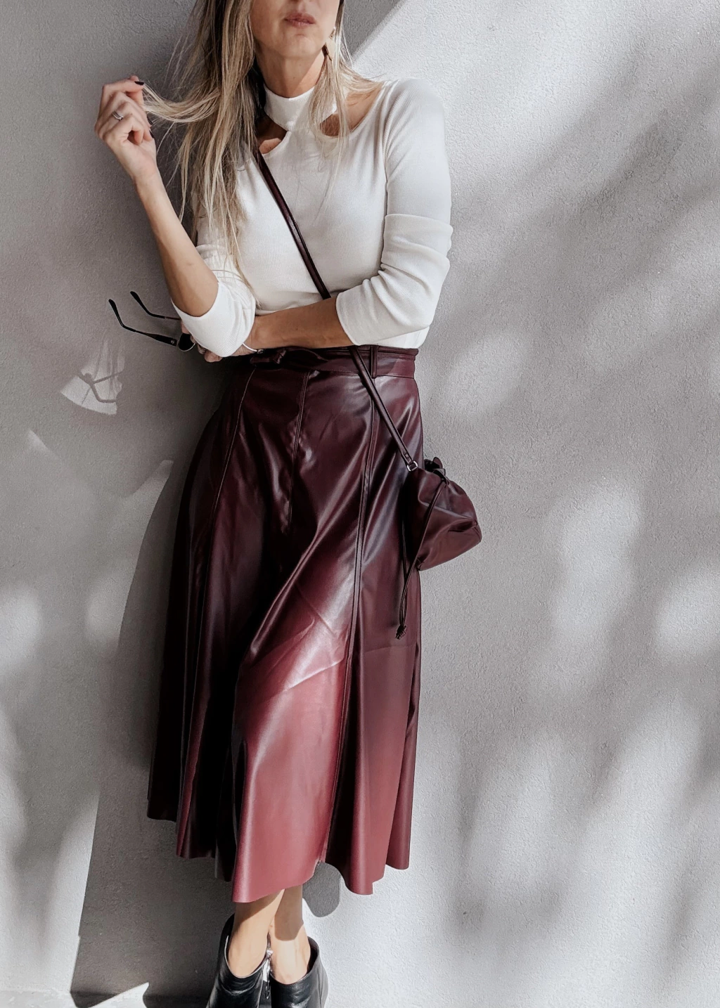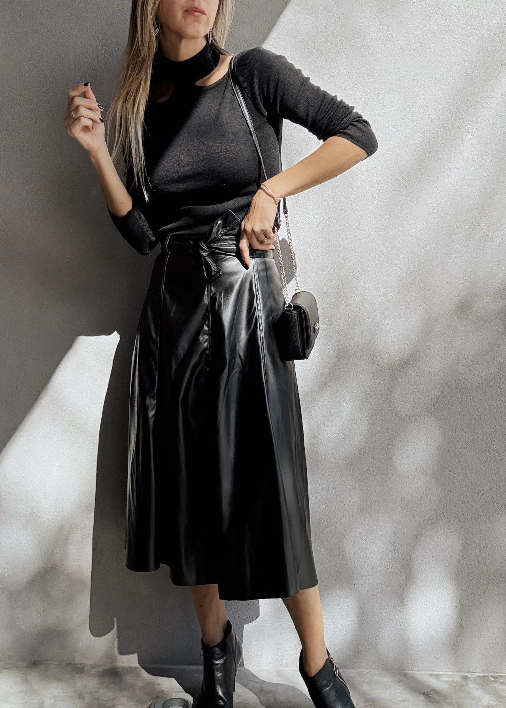Pollera largo midi de cuero sintético corte evase, con gajos generando gran vuelo. Posee cintura con presillas y lazo. Cierre invisible en el lateral.