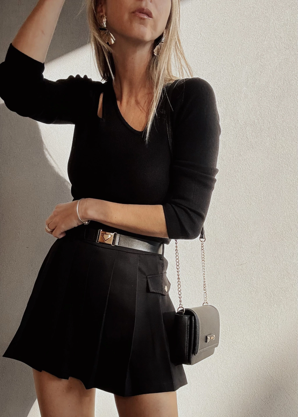 Mini/Pollera tableada con cierre al tono. Posee tapa de falso bolsillo al frente/lateral, y presillas con cinturón elástico y de cuero Pu con hebilla incorporado. El cinturón es desmontable.