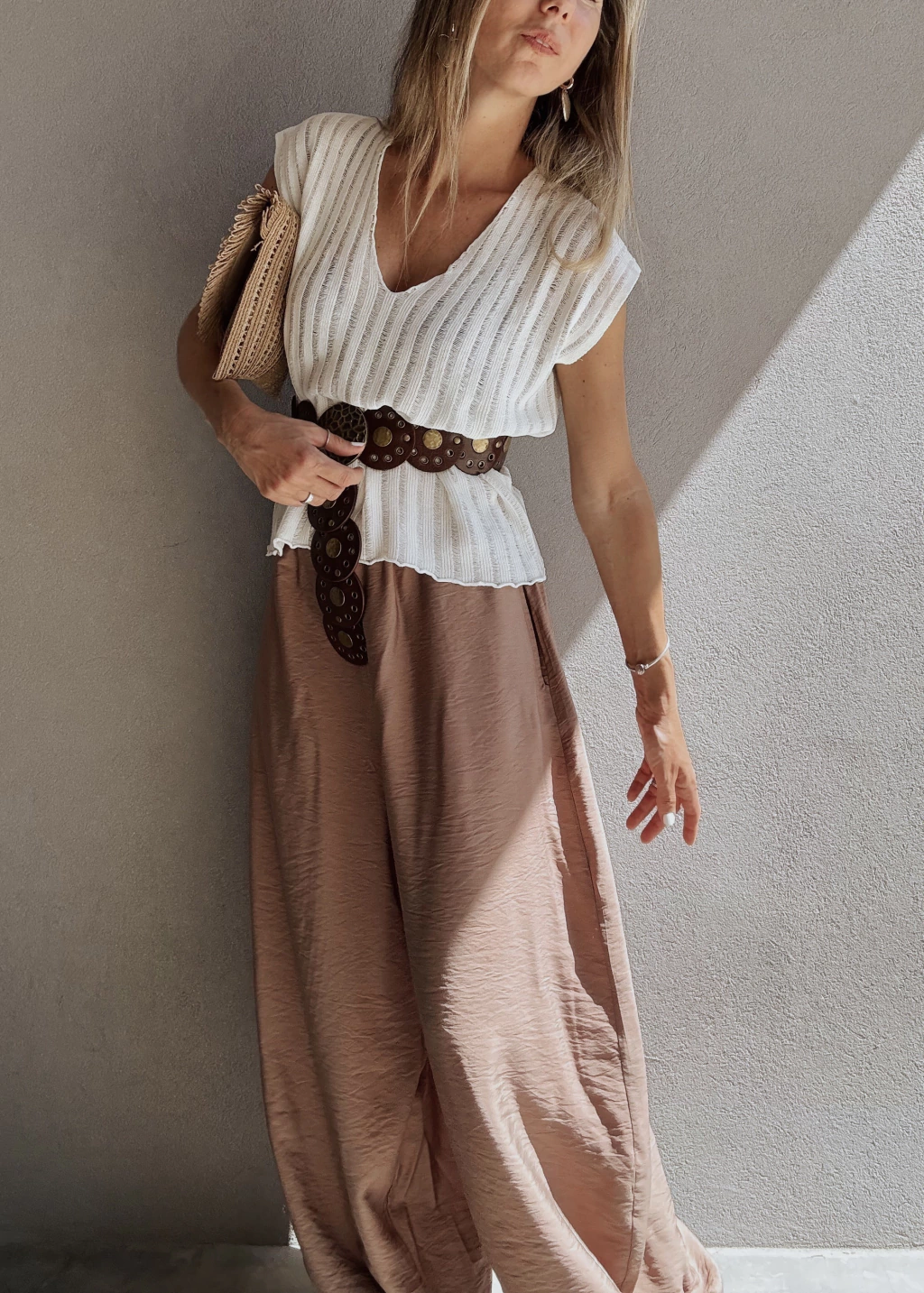 Remera sin mangas de punto liviano con trama calada en líneas verticales. Posee escote en “V”, caída suelta y terminación ondulada en el ruedo. Fresca, cómoda y perfecta para looks relajados de verano.
