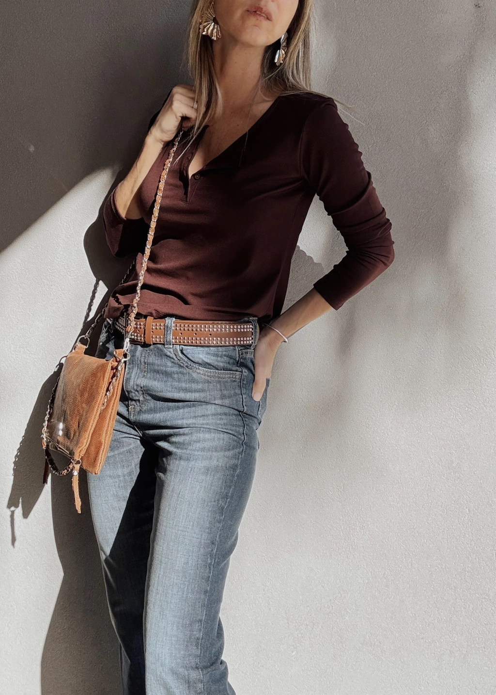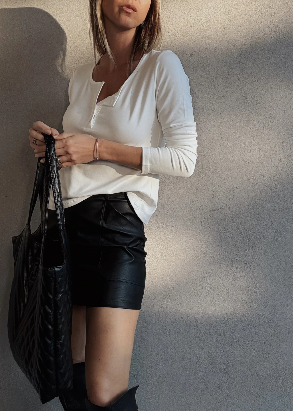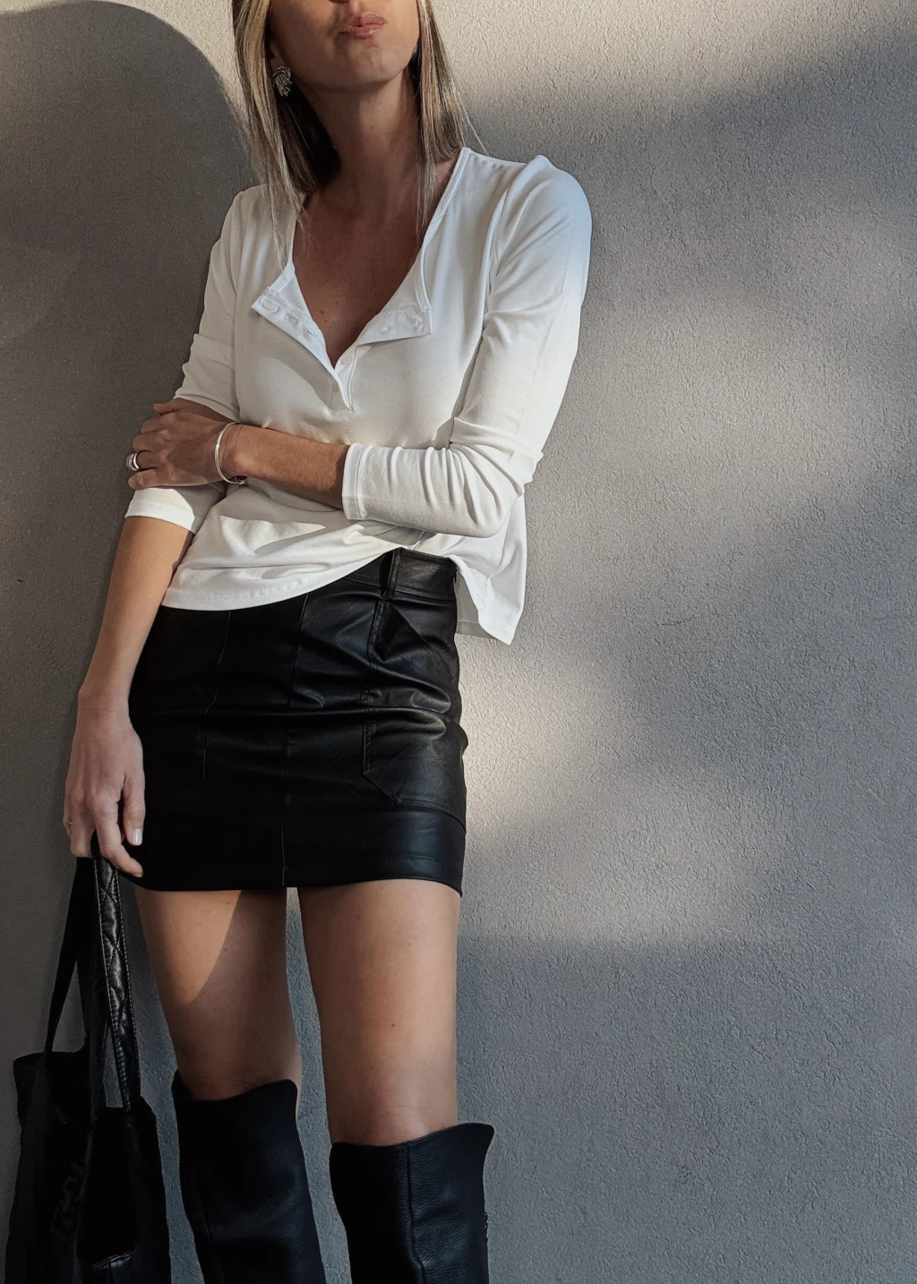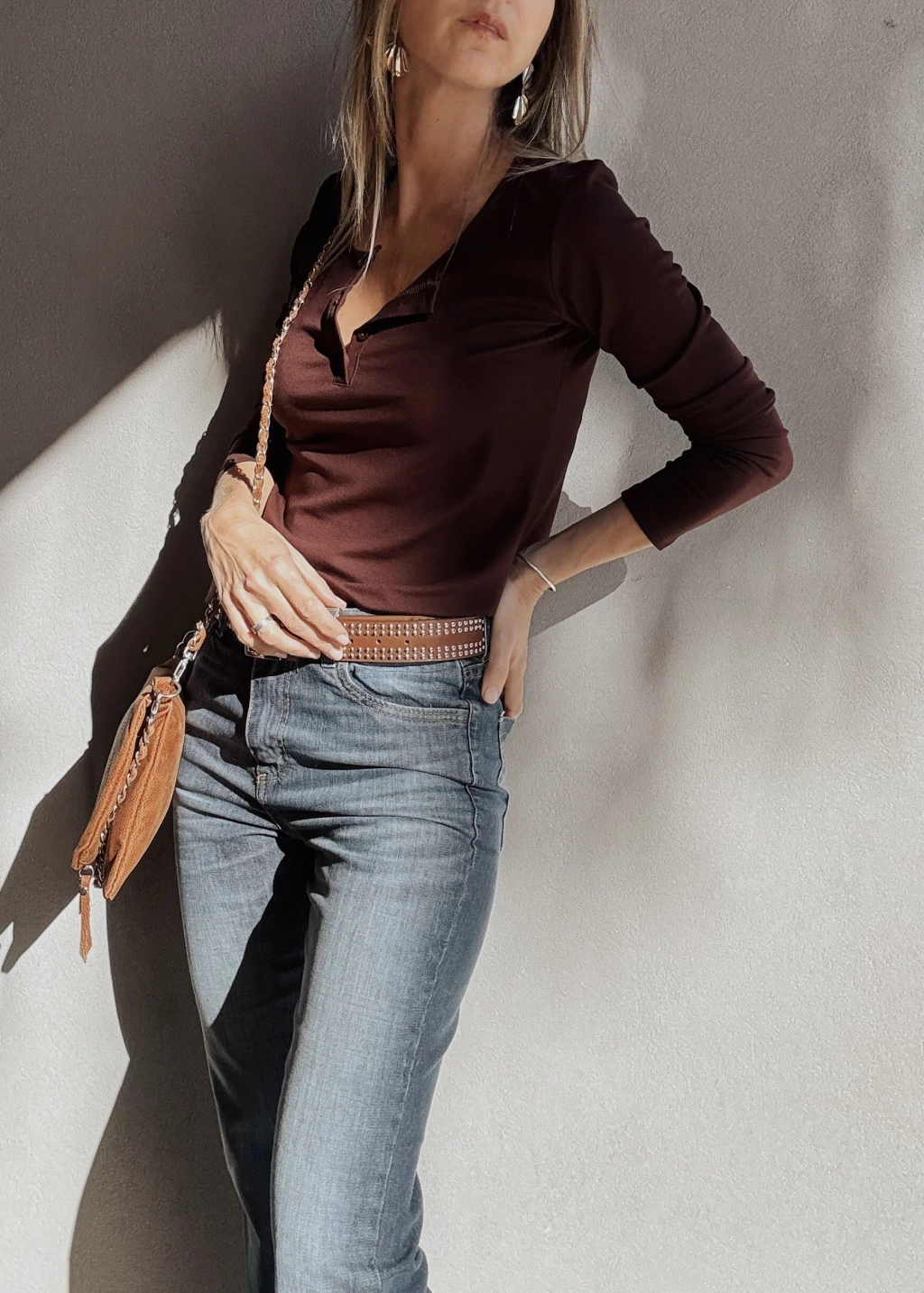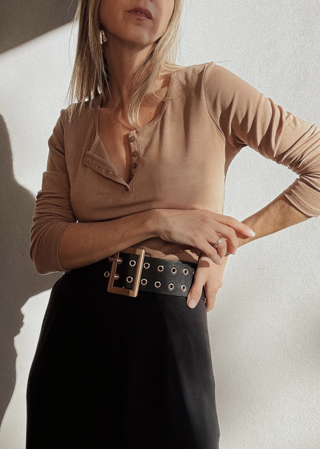 Remera básica larguita corte evase con cuello redondo escotado y botoncitos al tono, manga larga. Un básico infaltable.
