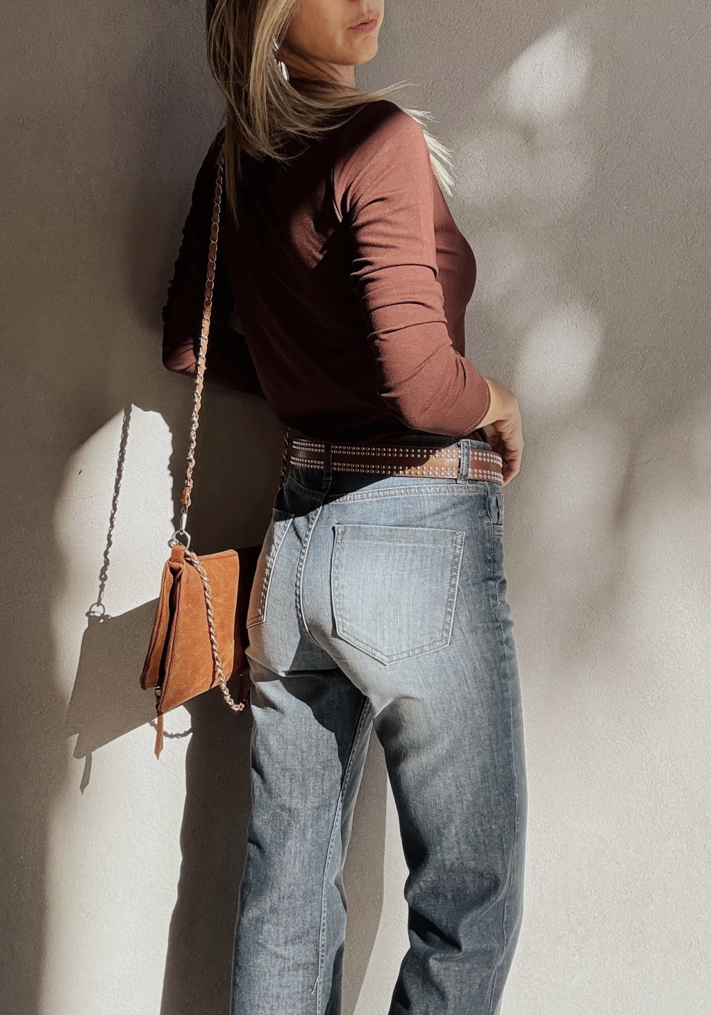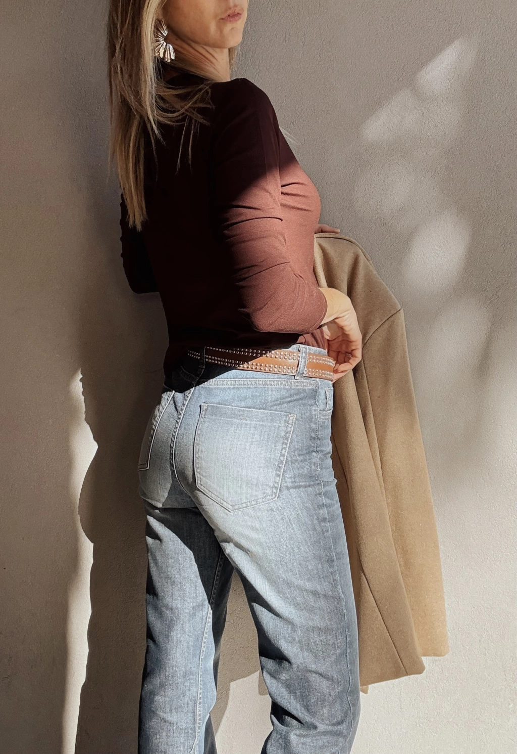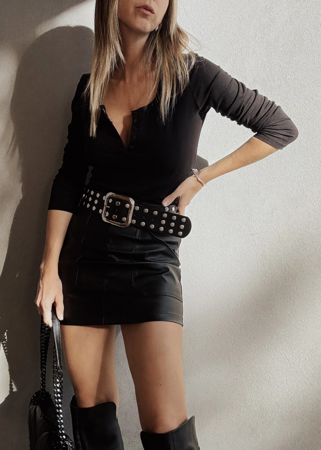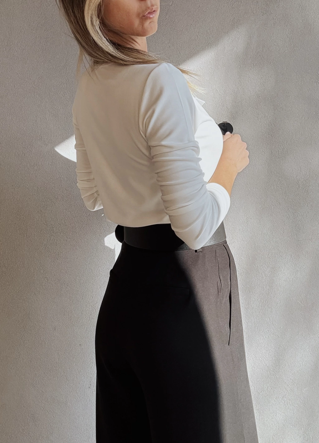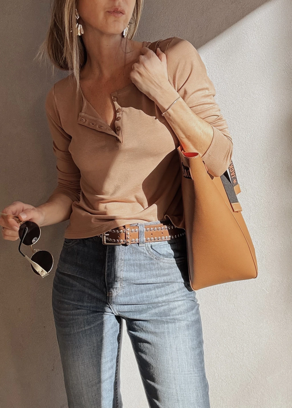 Remera básica larguita corte evase con cuello redondo escotado y botoncitos al tono, manga larga. Un básico infaltable.