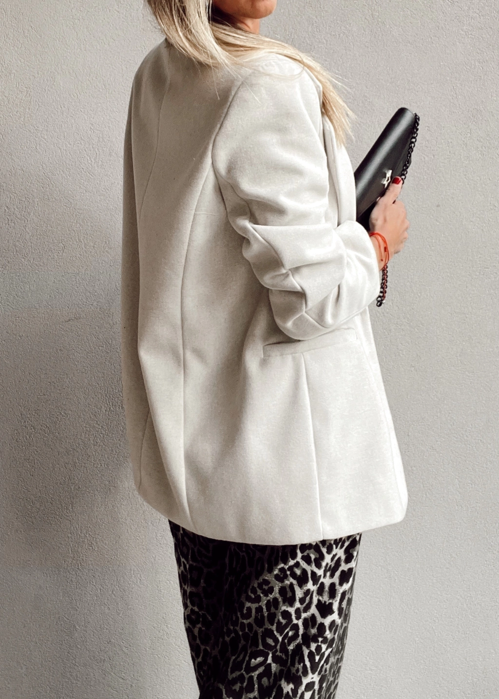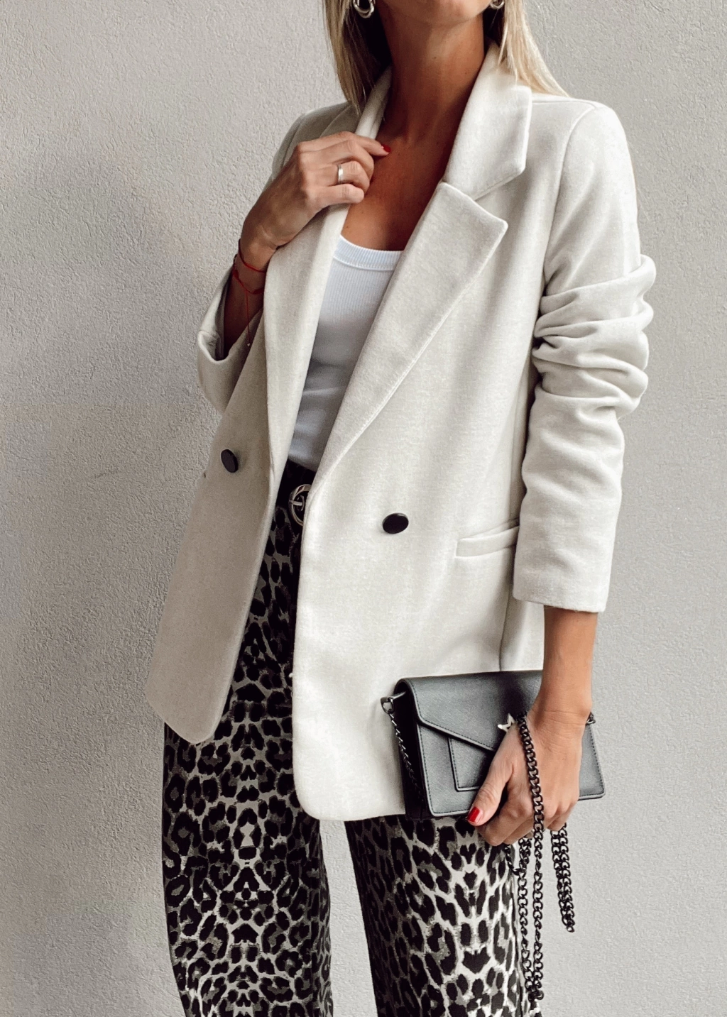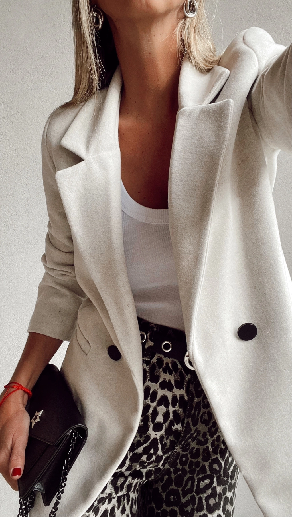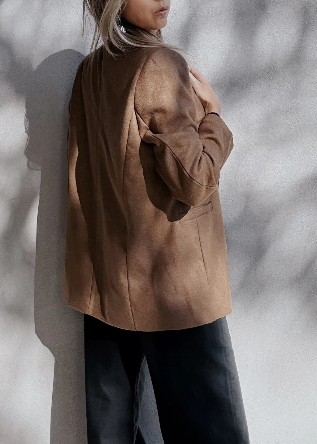 Sacon de paño forrado al tono semi entallado, cruzado, con botones negros. Posee dos falsos bolsillos frontales.