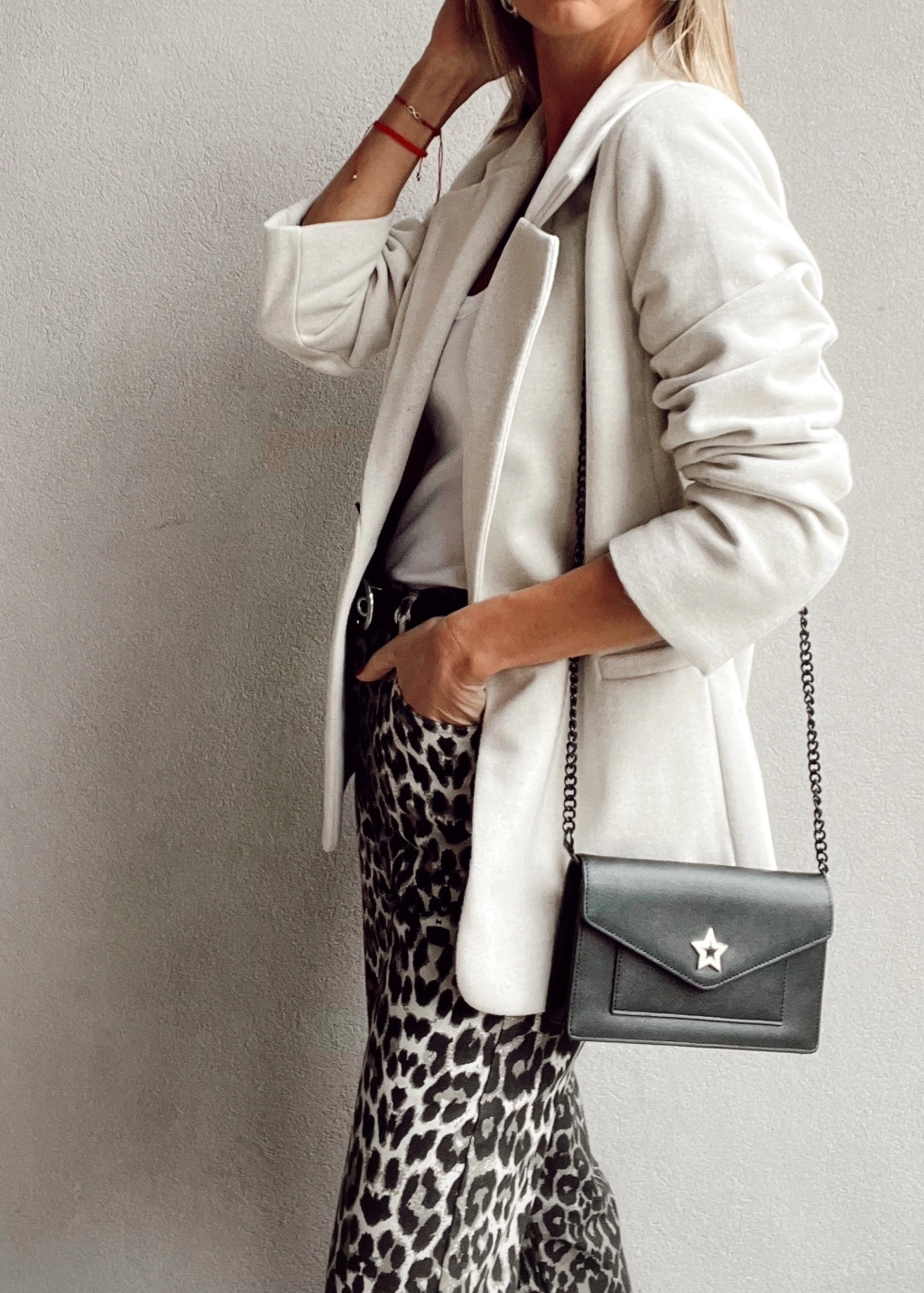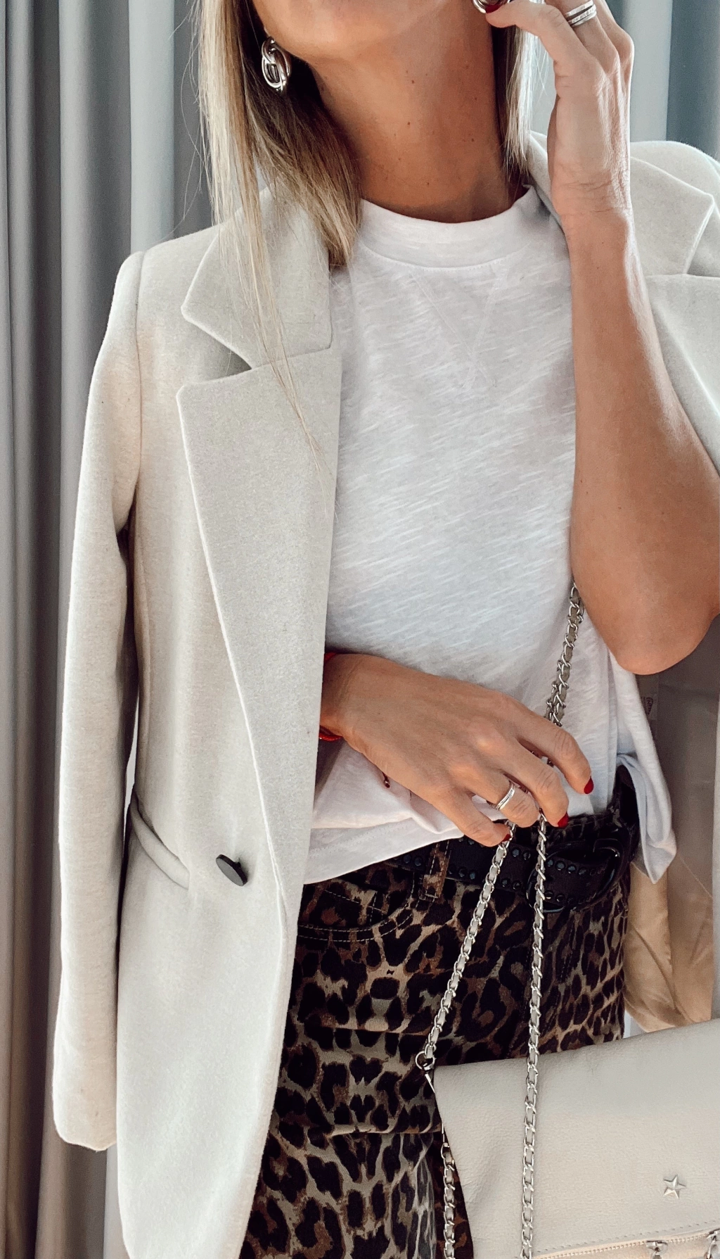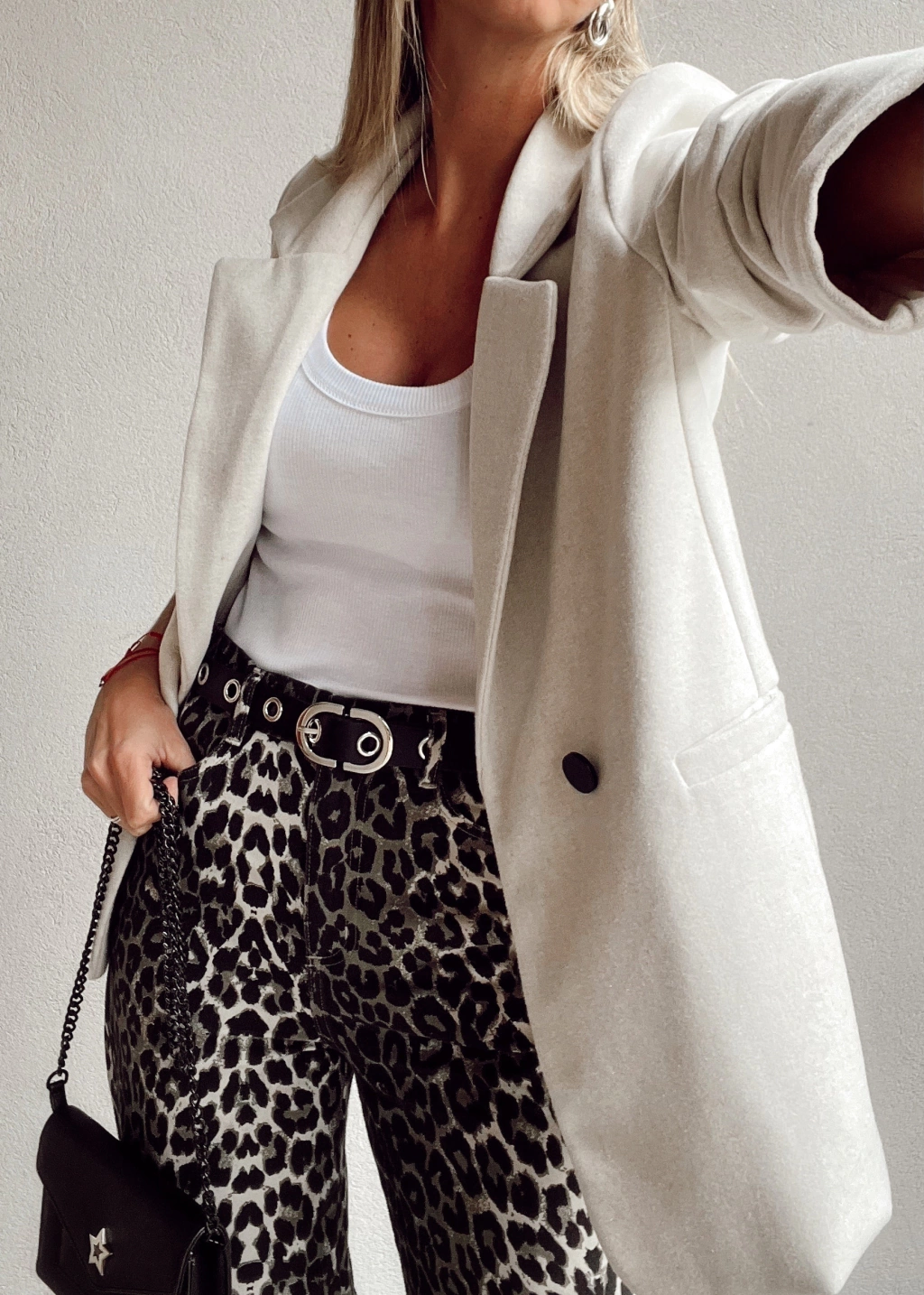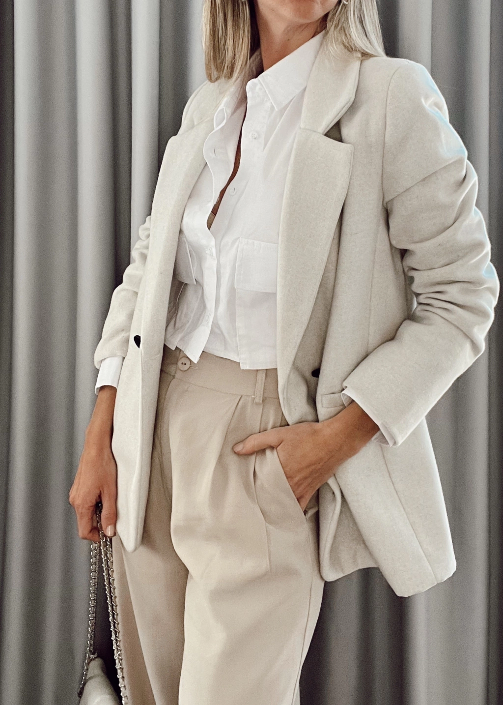 Sacon de paño forrado al tono semi entallado, cruzado, con botones negros. Posee dos falsos bolsillos frontales.