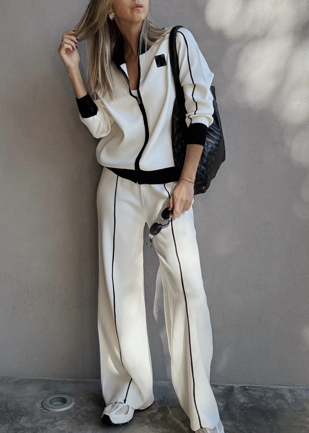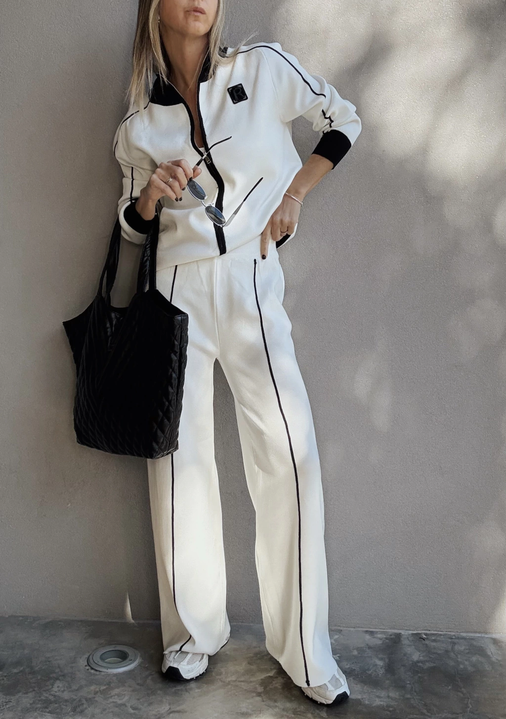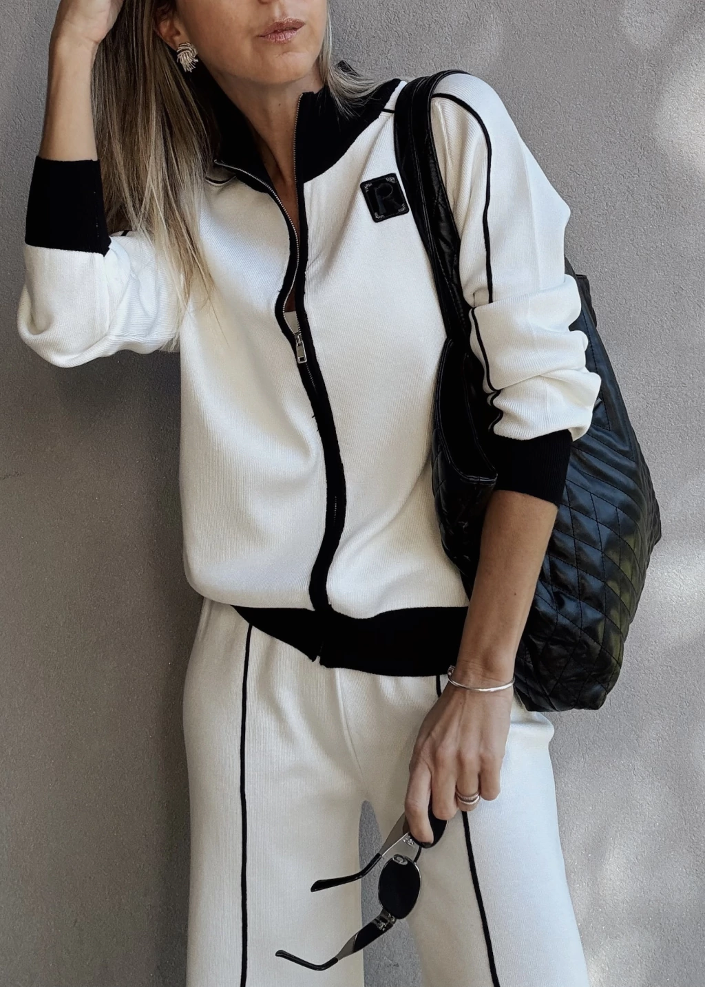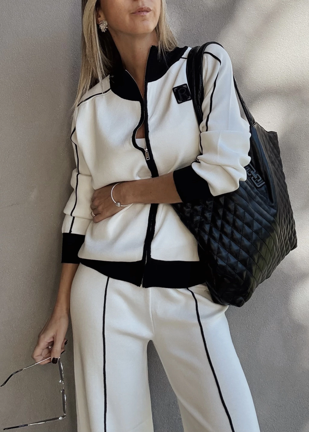 Conjunto de camperita tejita con cierre metálico, pose puños en mangas y en cintura. Posee detalles en otro tono tanto en cuello, puños, cartera y una costura en las mangas. Detalle de aplique bordado en tono opuesto.