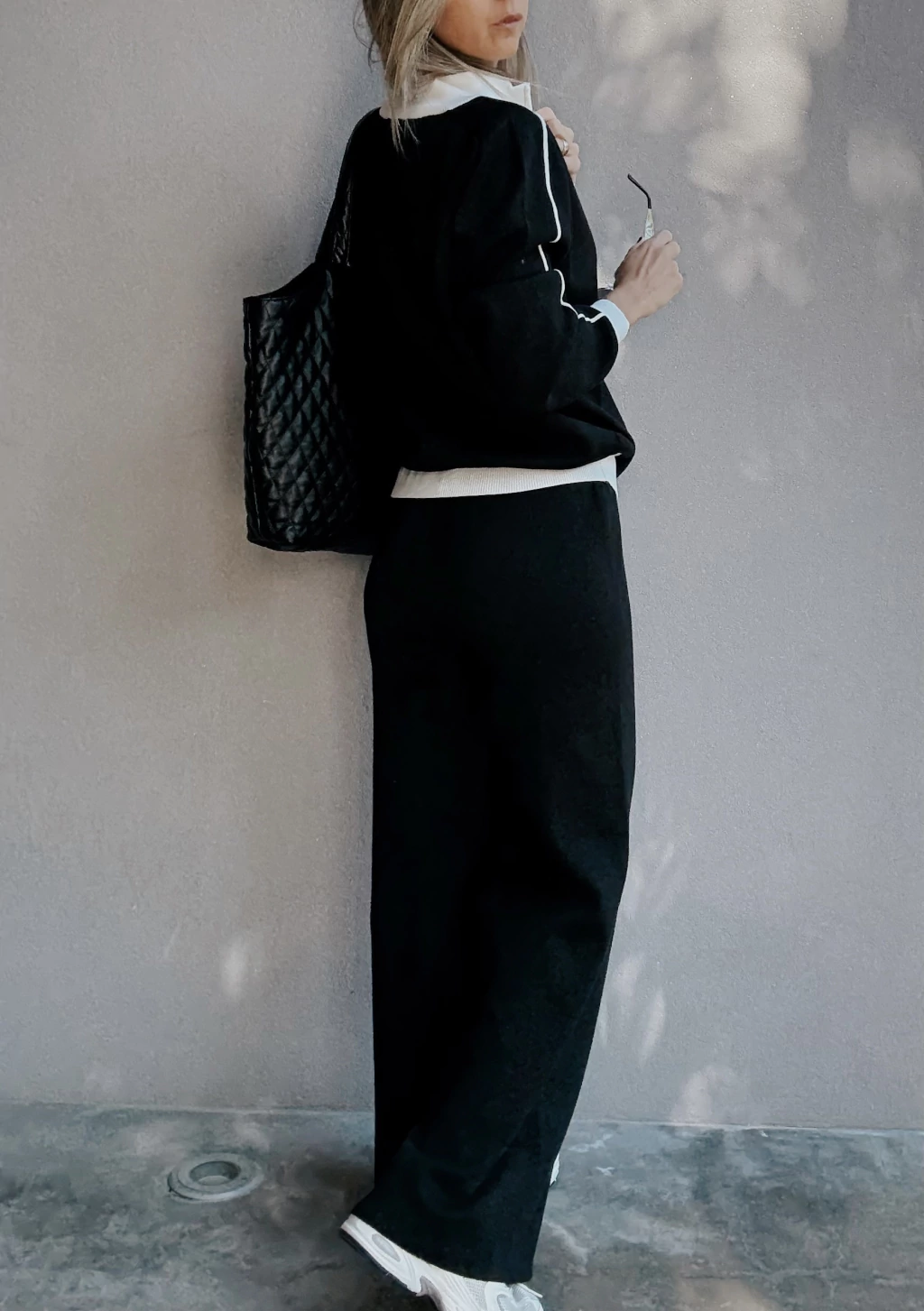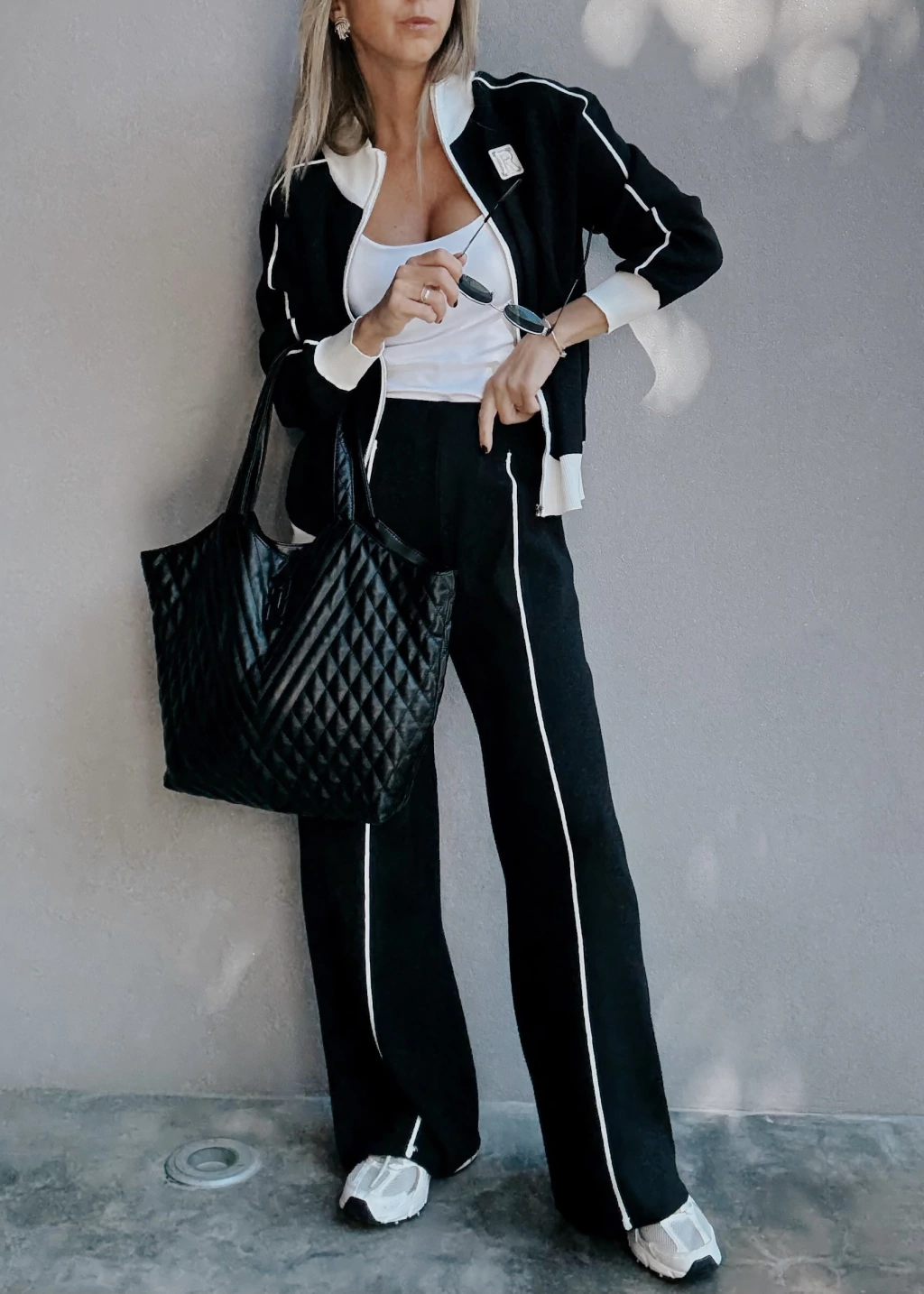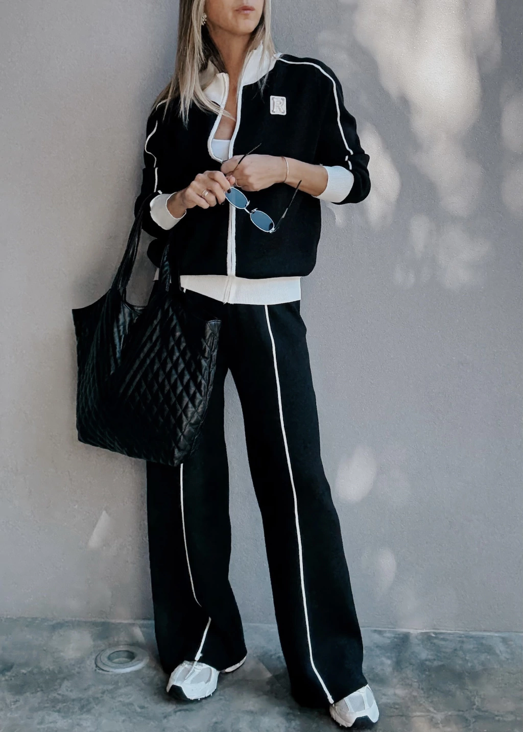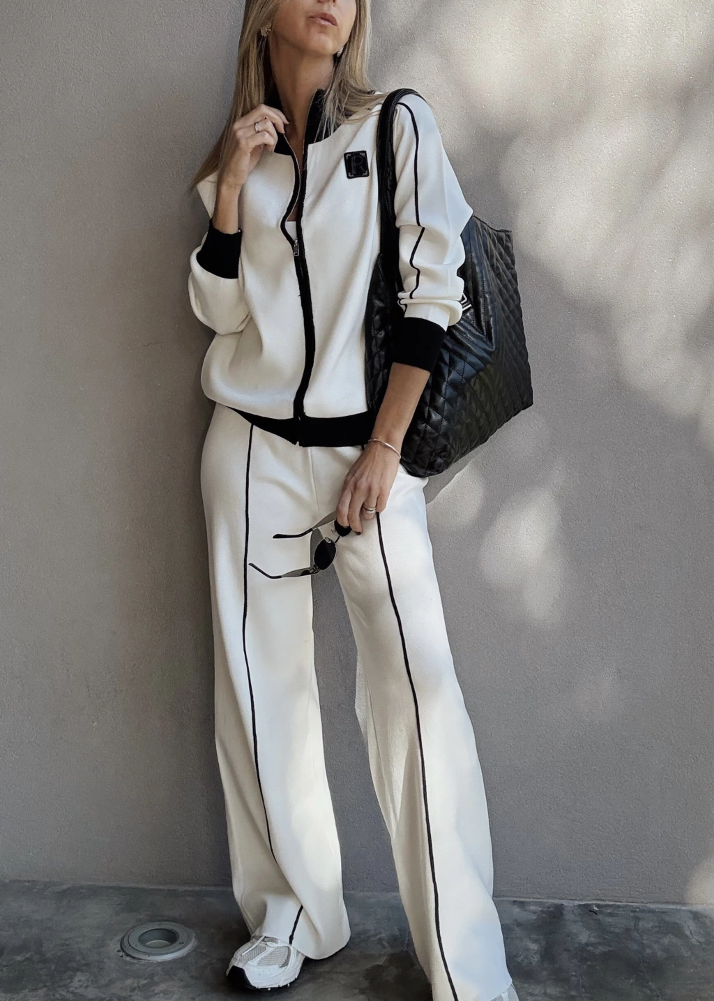 Conjunto de camperita tejita con cierre metálico, pose puños en mangas y en cintura. Posee detalles en otro tono tanto en cuello, puños, cartera y una costura en las mangas. Detalle de aplique bordado en tono opuesto.