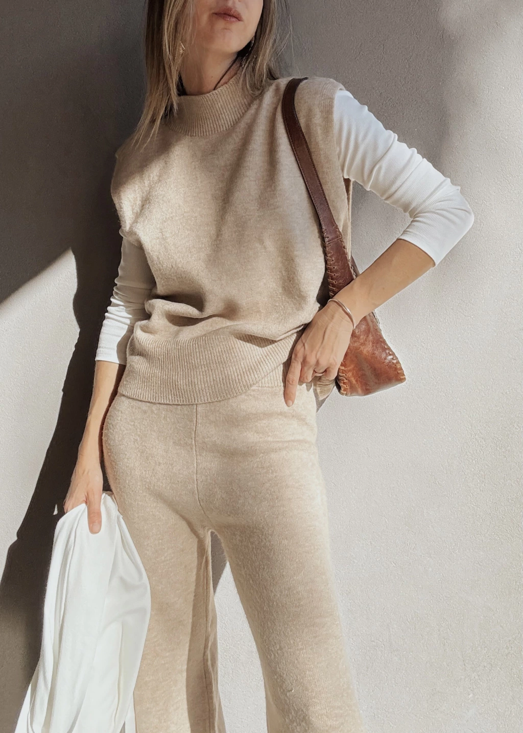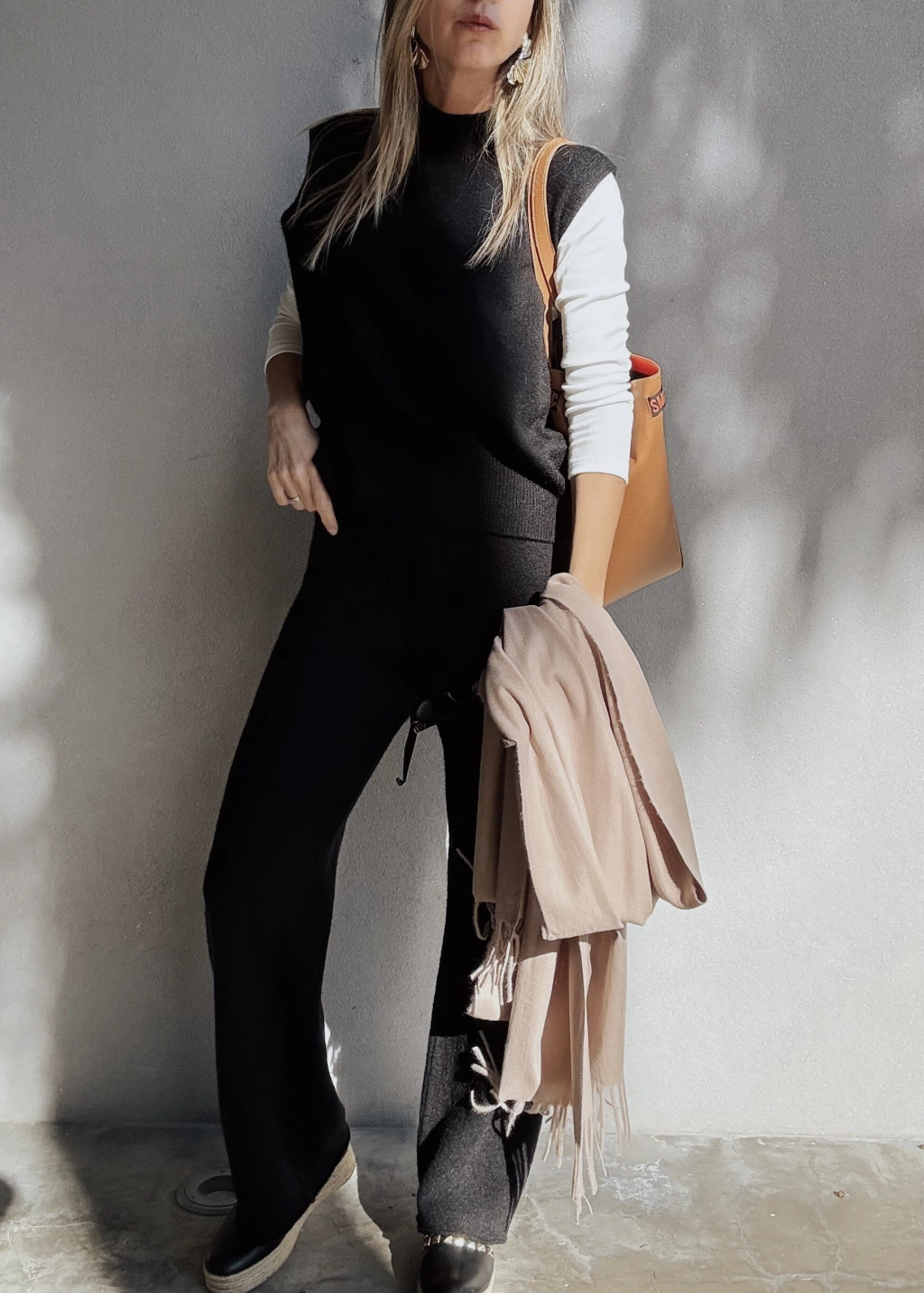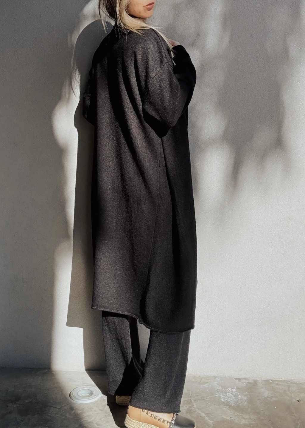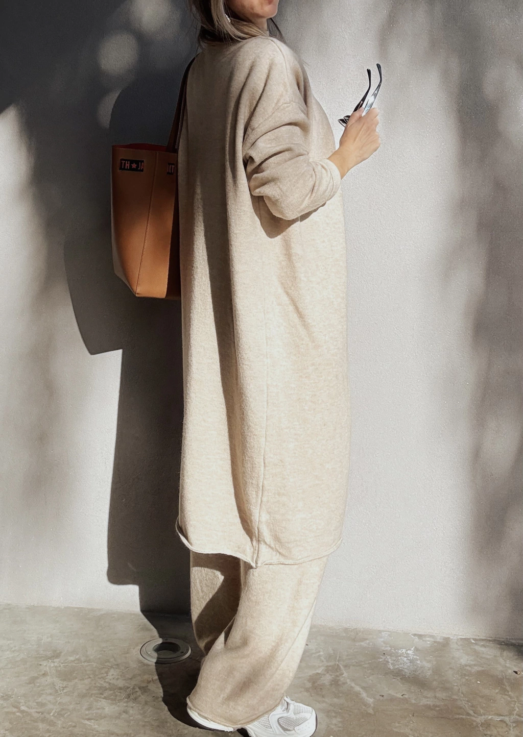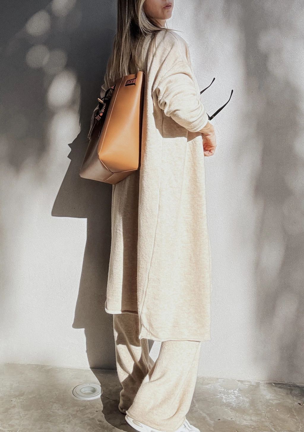 Conjunto de chaleco con cuello alto tipo media polera y puño en cintura. Pantalón con ancha cintura elástica tipo palazzo con ruedo al corte, y largo saco, amplio y recto, también con ruedo al corte en mangas y en la base.