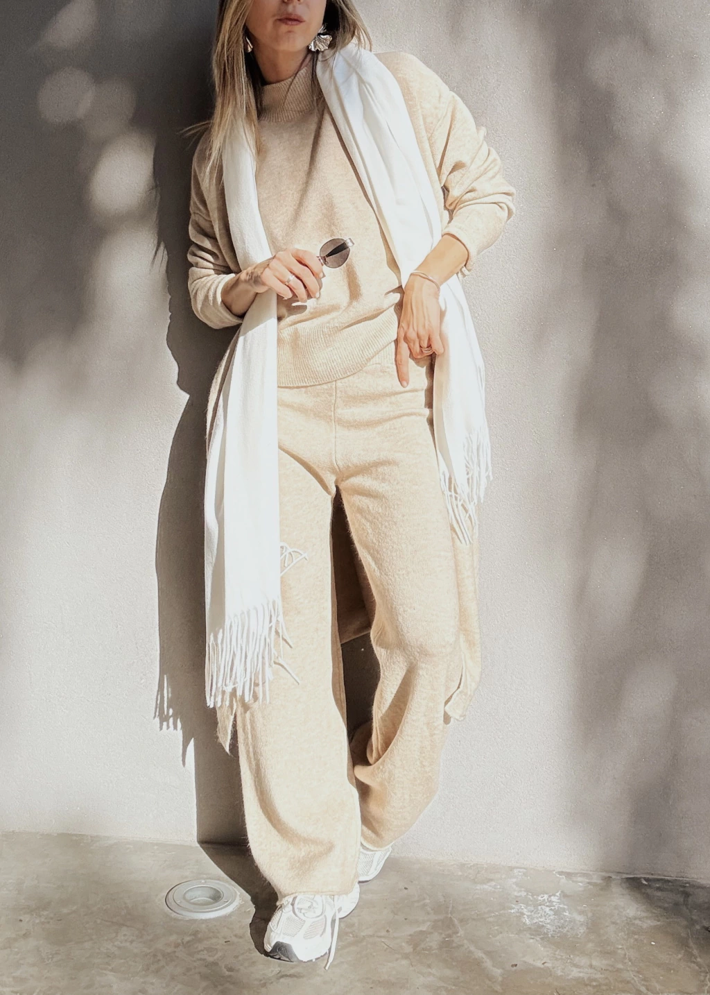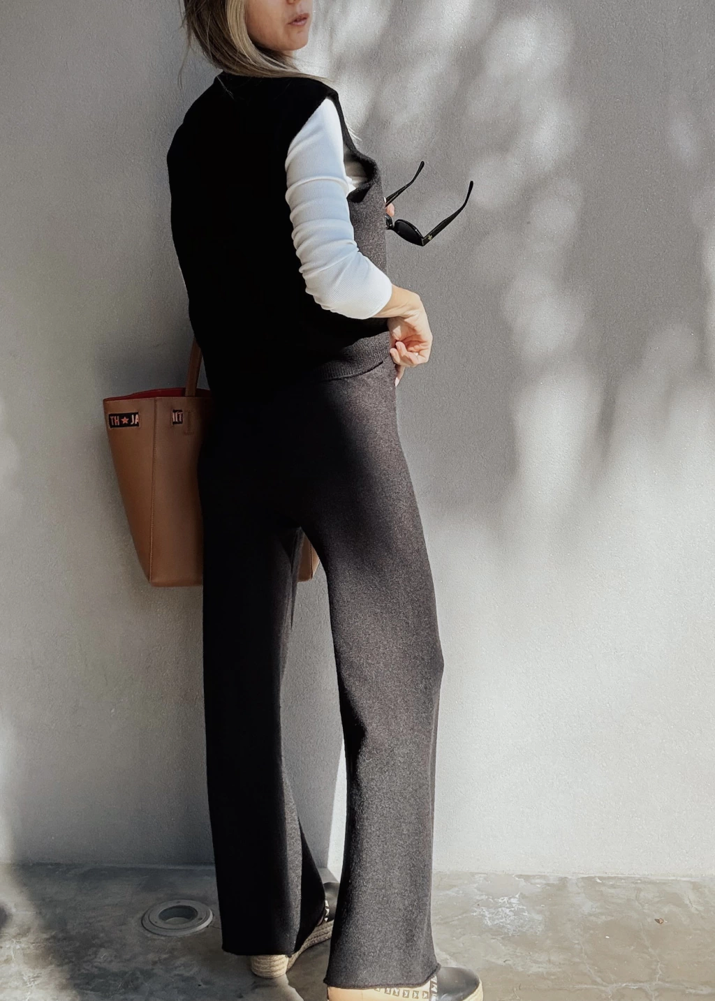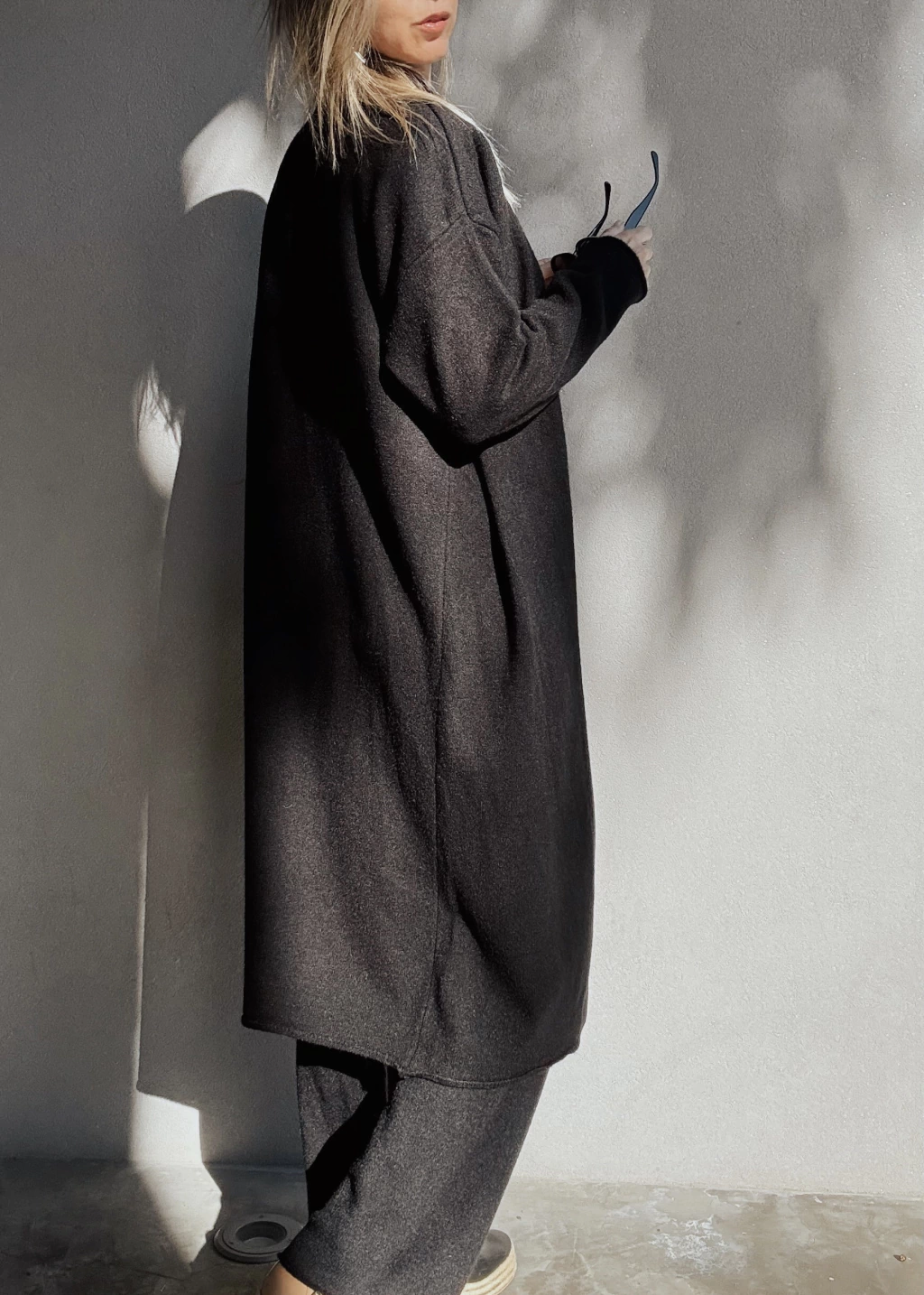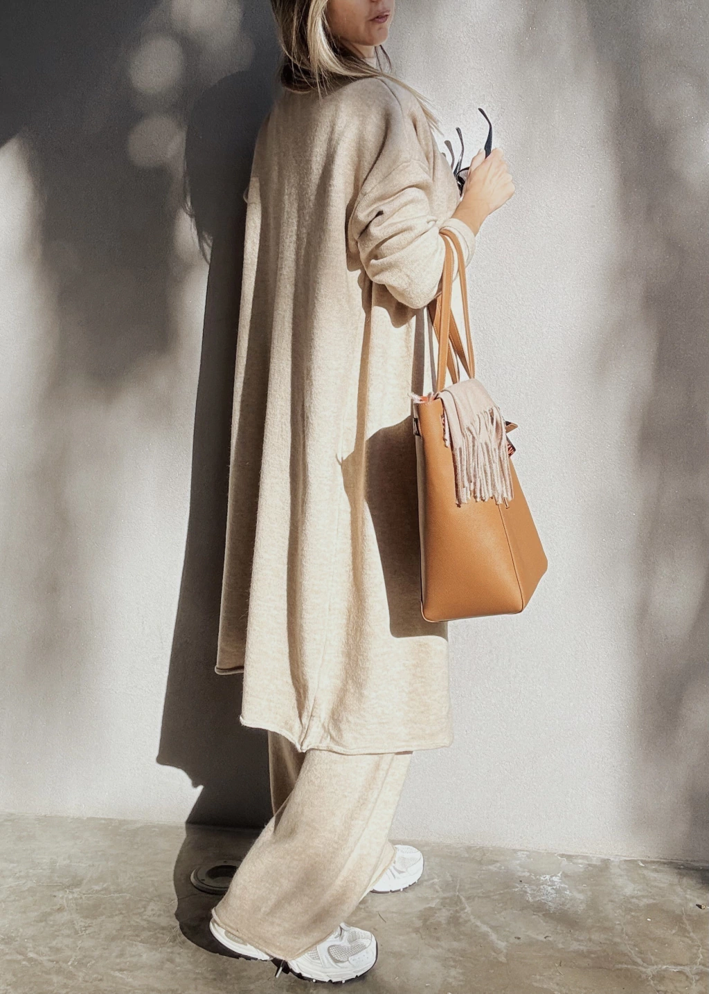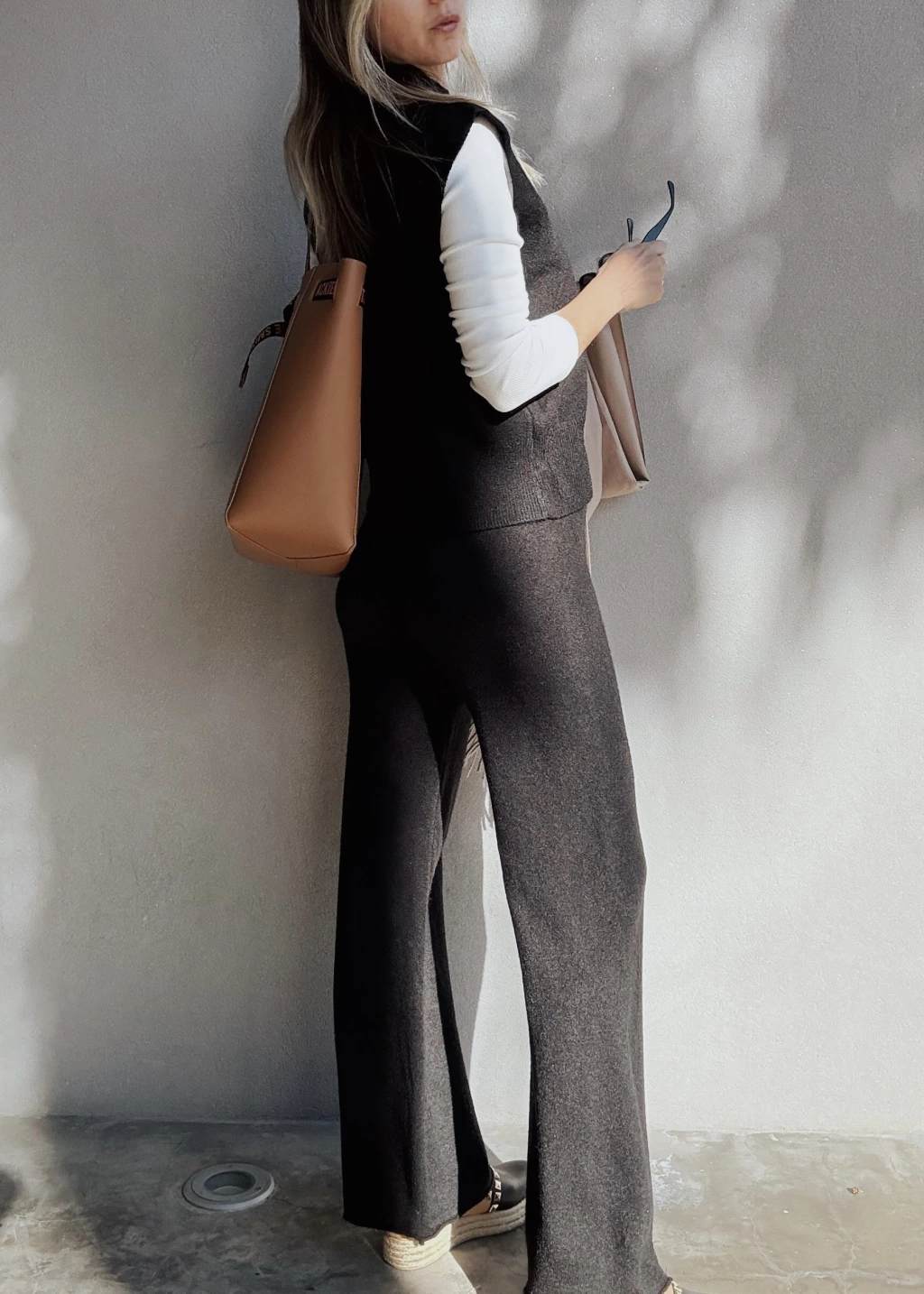 Conjunto de chaleco con cuello alto tipo media polera y puño en cintura. Pantalón con ancha cintura elástica tipo palazzo con ruedo al corte, y largo saco, amplio y recto, también con ruedo al corte en mangas y en la base.