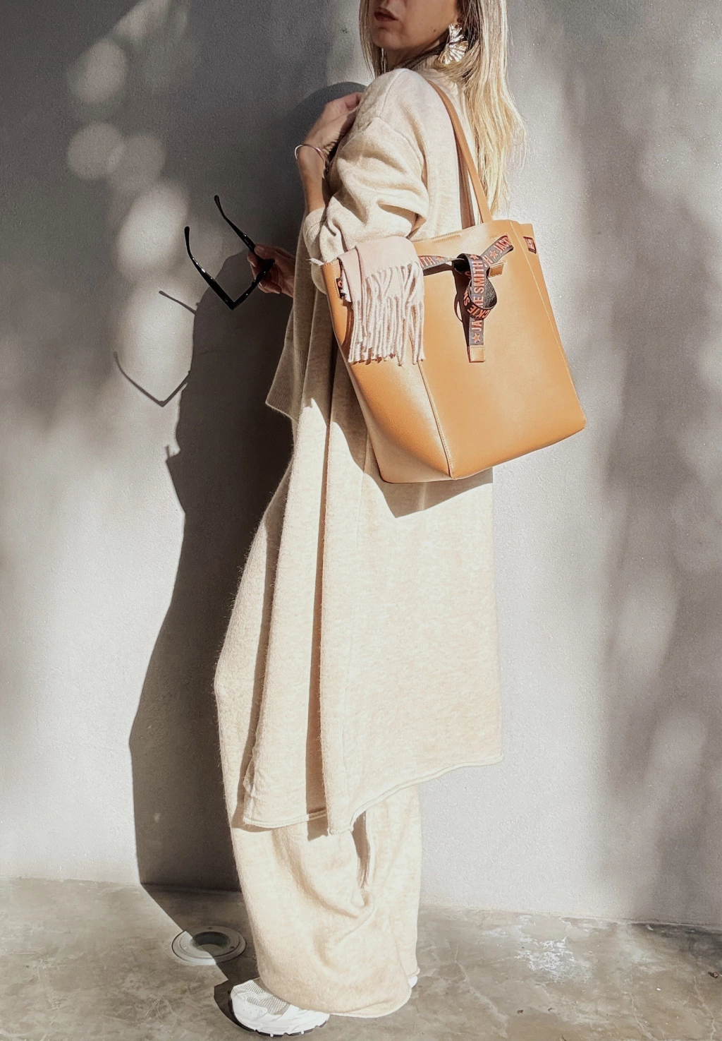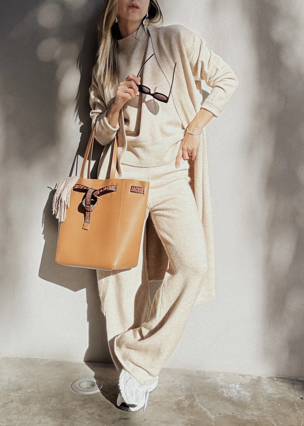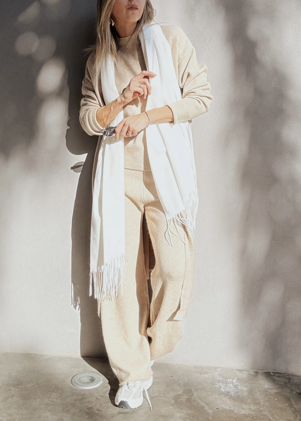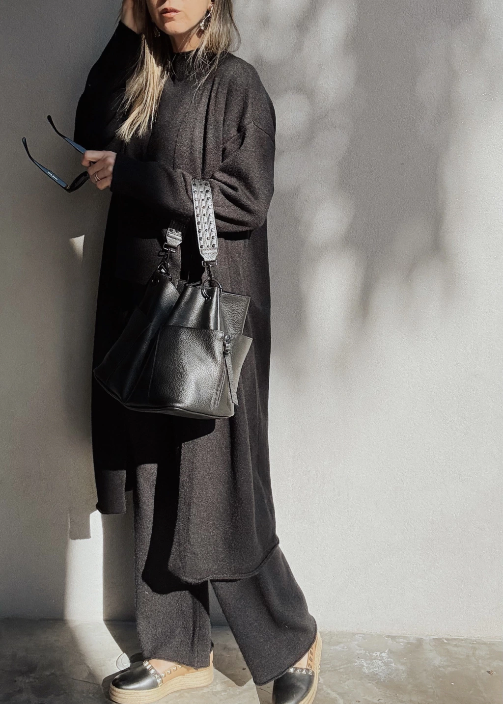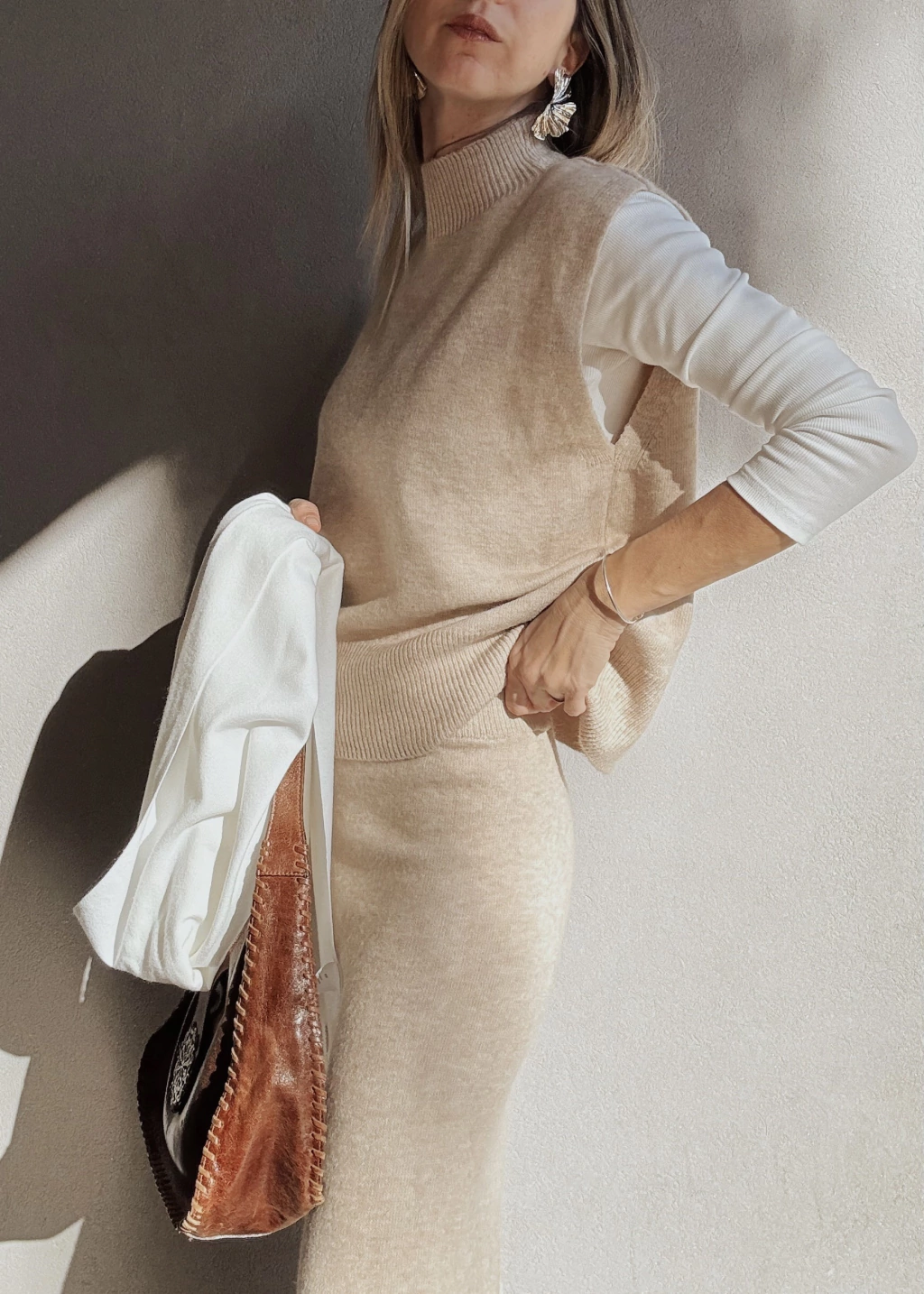 Conjunto de chaleco con cuello alto tipo media polera y puño en cintura. Pantalón con ancha cintura elástica tipo palazzo con ruedo al corte, y largo saco, amplio y recto, también con ruedo al corte en mangas y en la base.