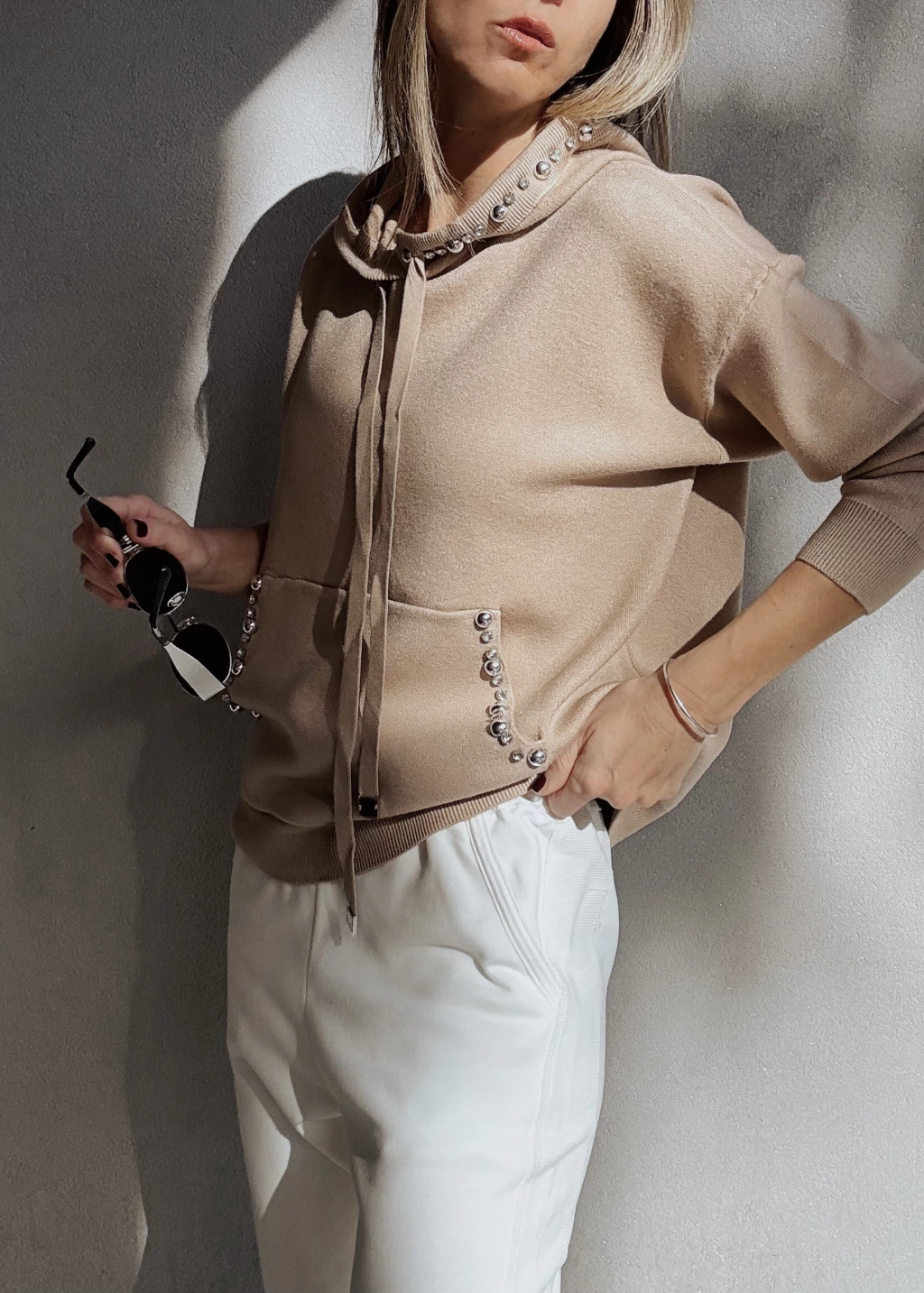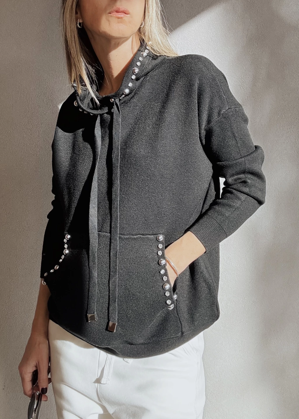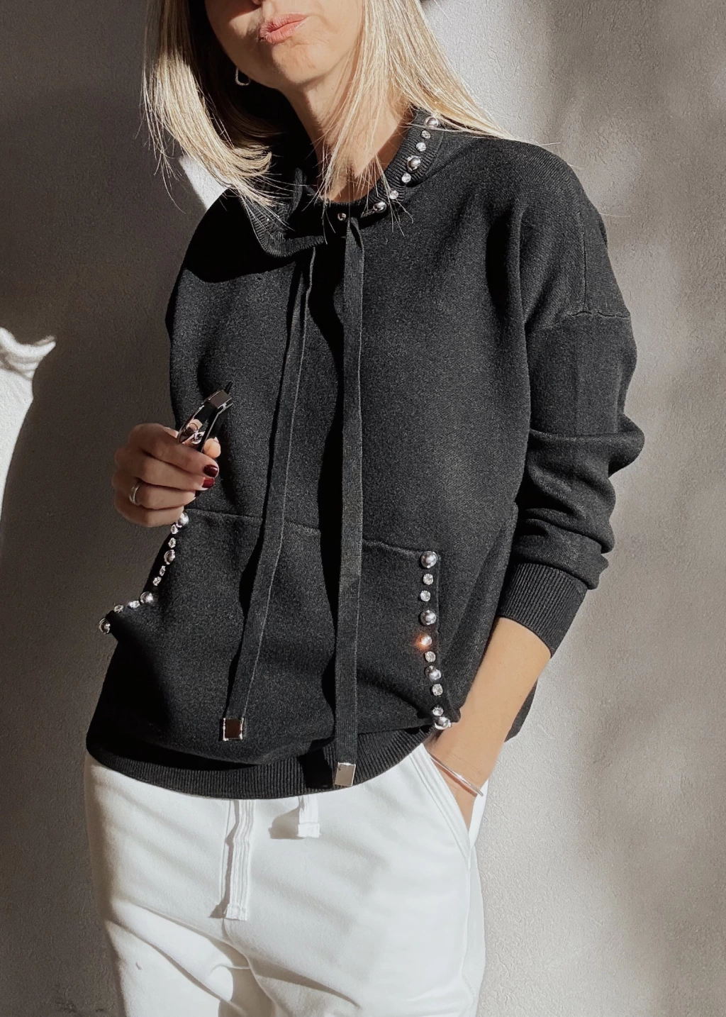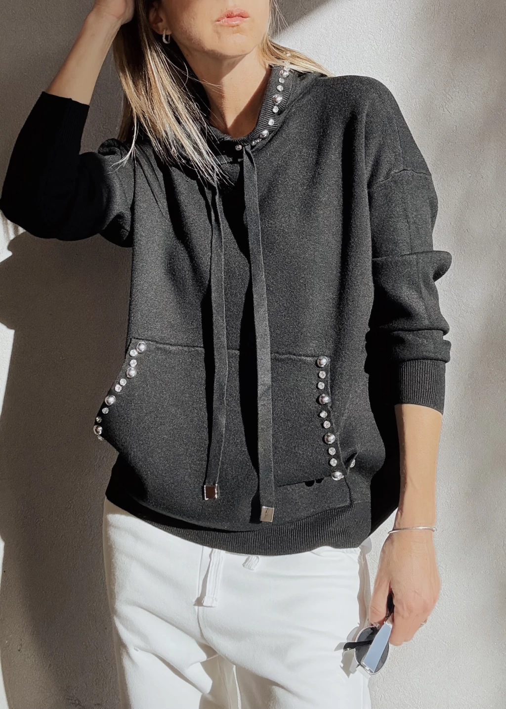 Sweater tejido canguro, con capucha y cordón regulable con puntera metálica, puños en mangas y en cintura. Posee aplique de tachas grandes y strass.