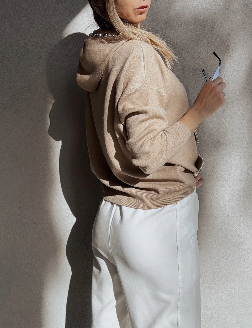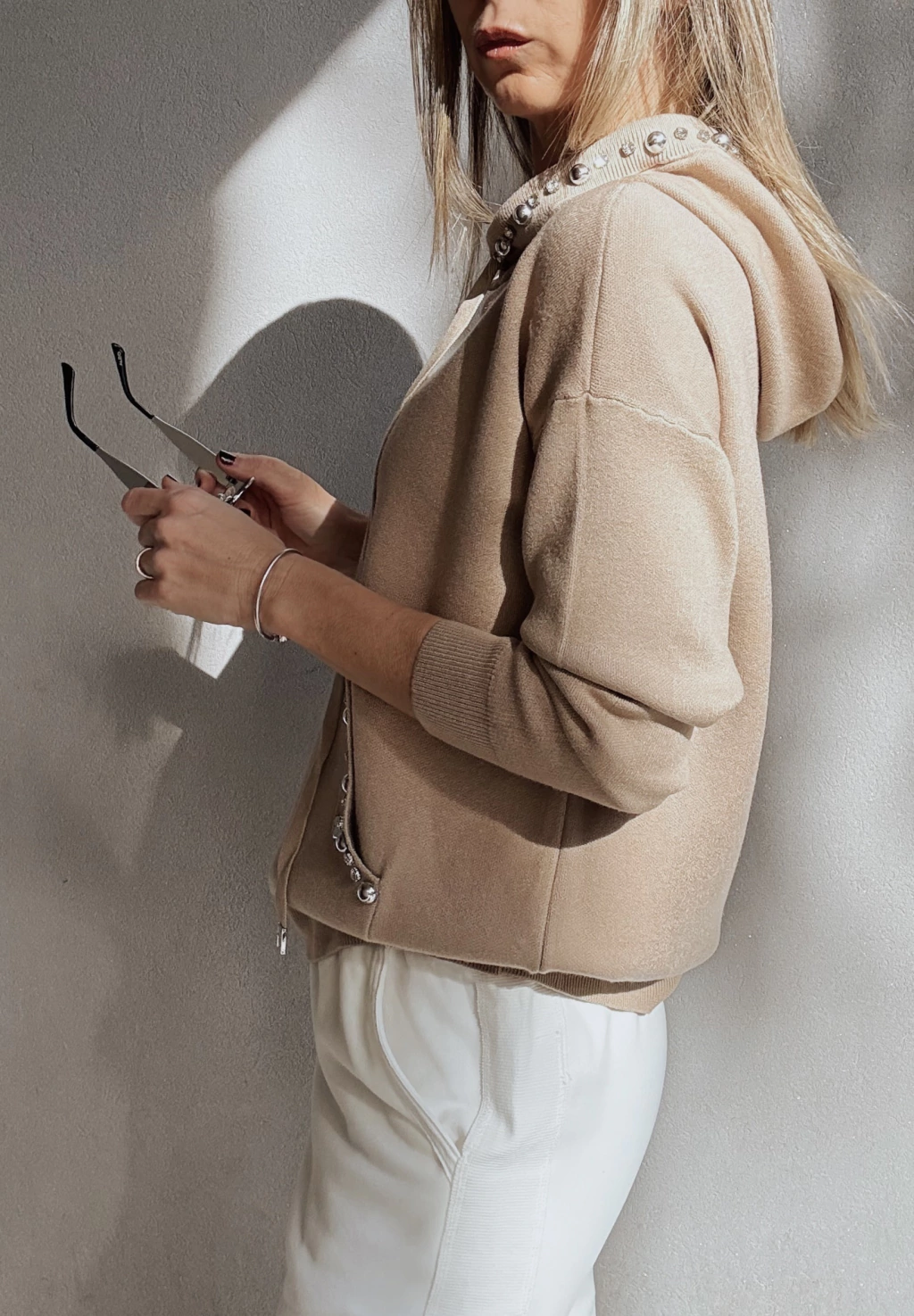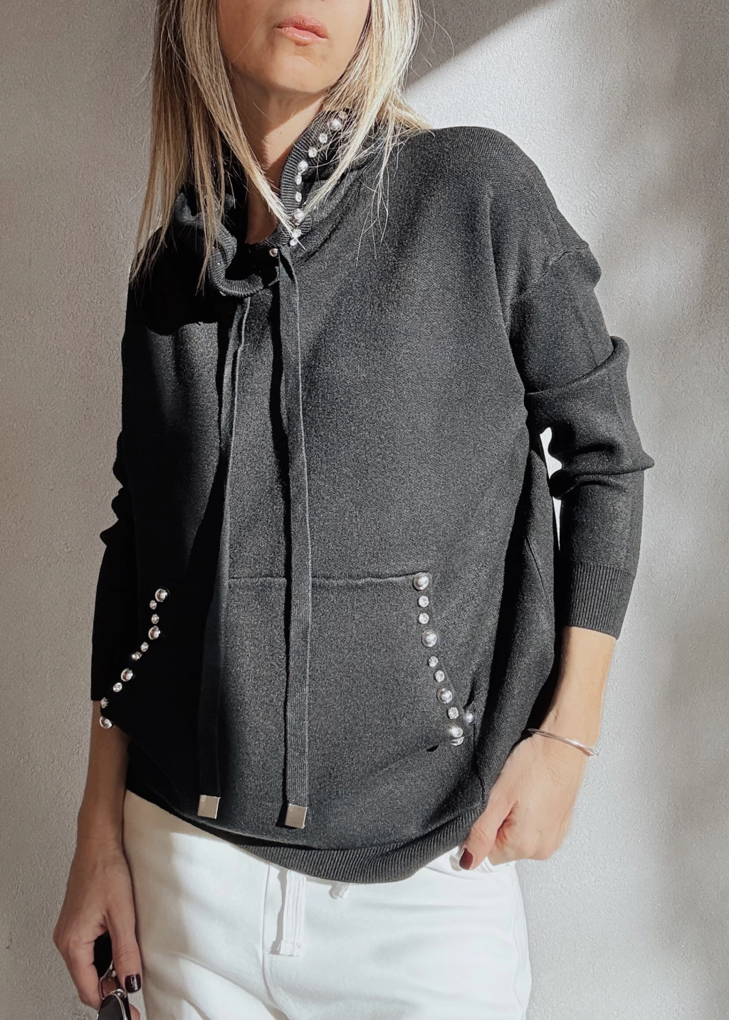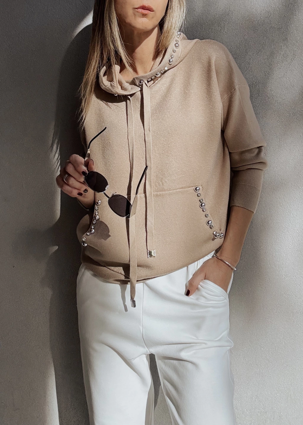 Sweater tejido canguro, con capucha y cordón regulable con puntera metálica, puños en mangas y en cintura. Posee aplique de tachas grandes y strass.