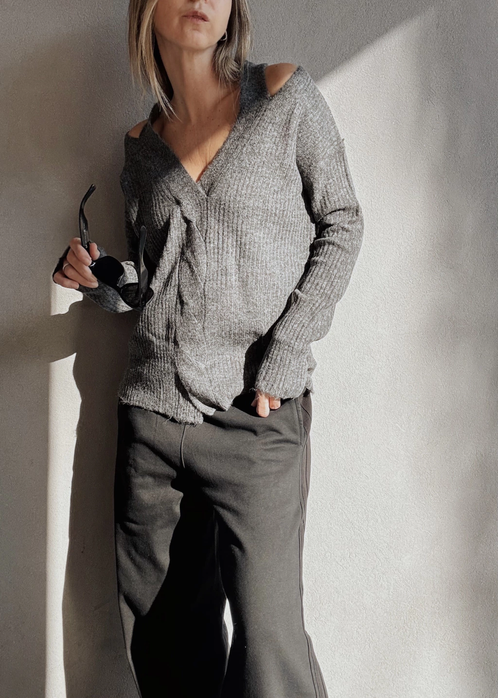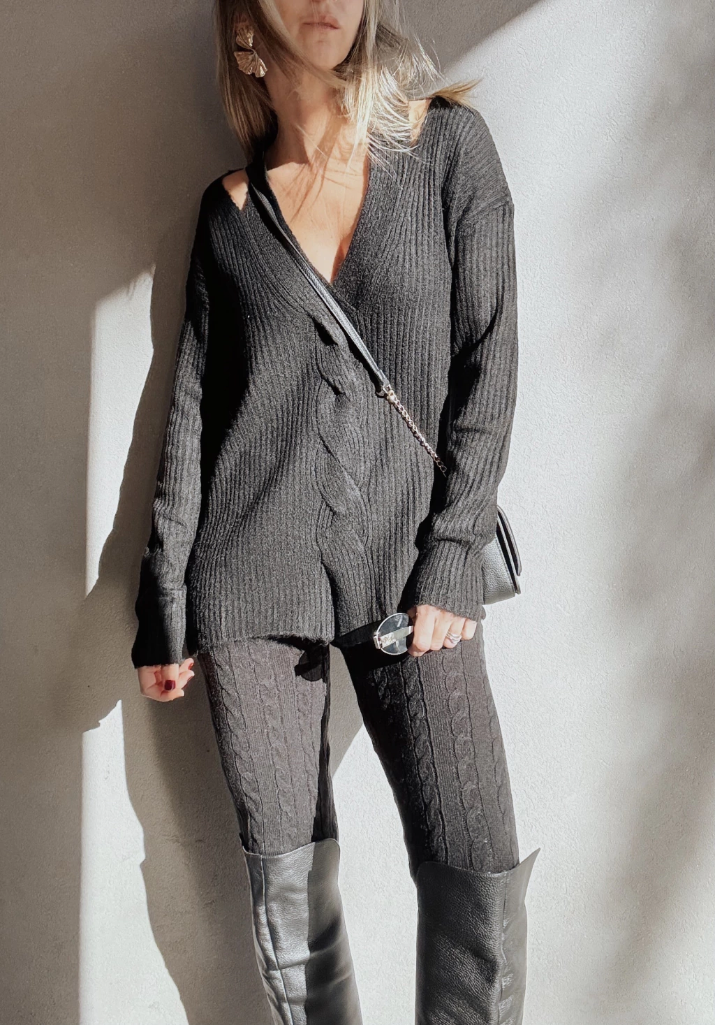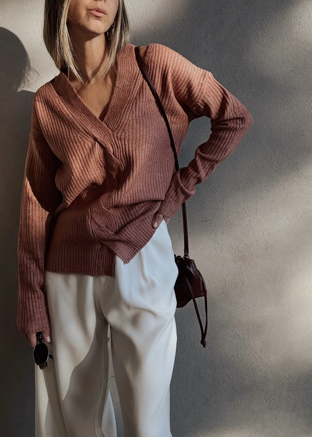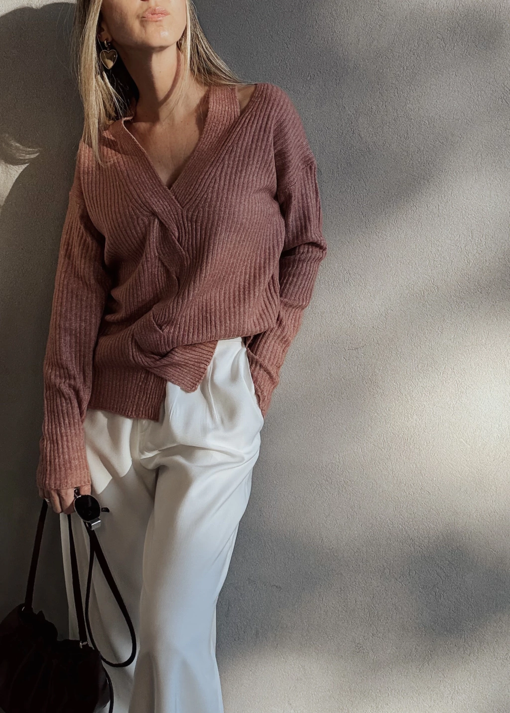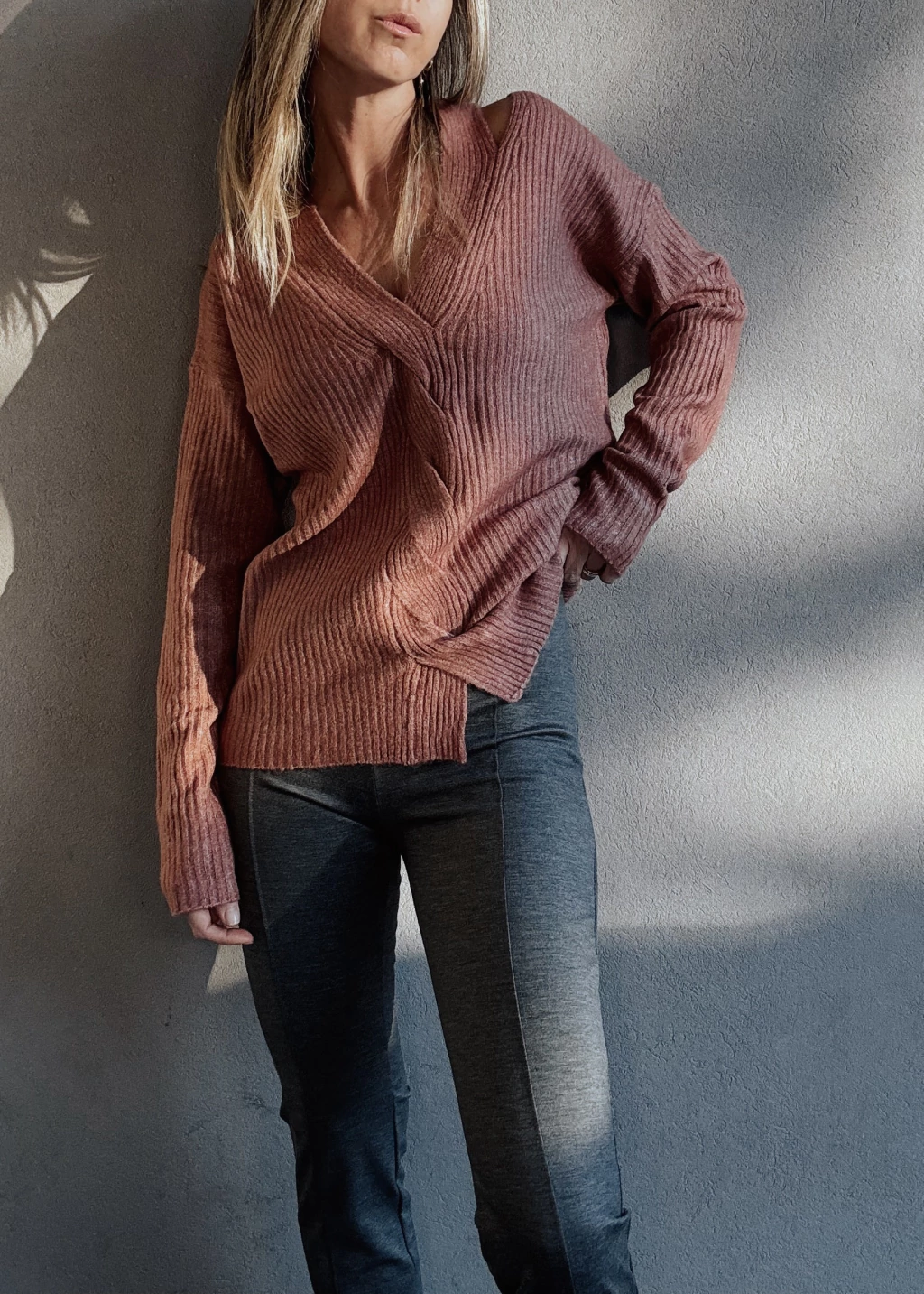 Sweater tejido escote en v con recortes sexys en el cuello. Posee canelones tipo morley & espiga vertical en el centro con pequeño tajo en la parte inferior.