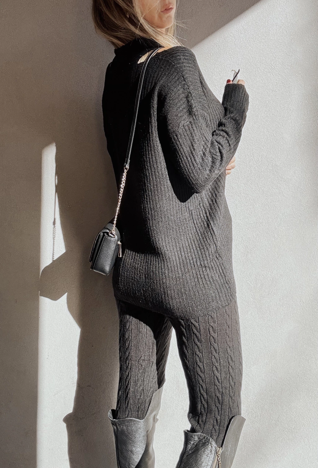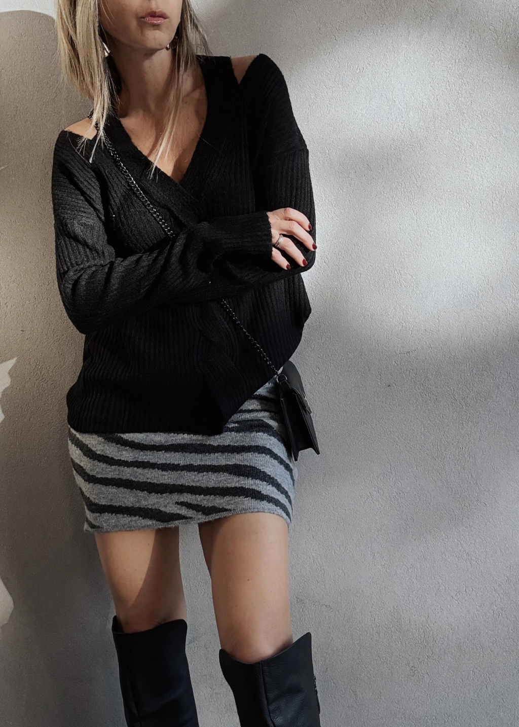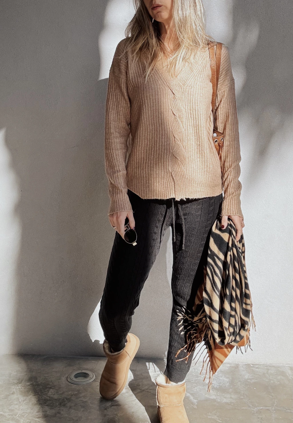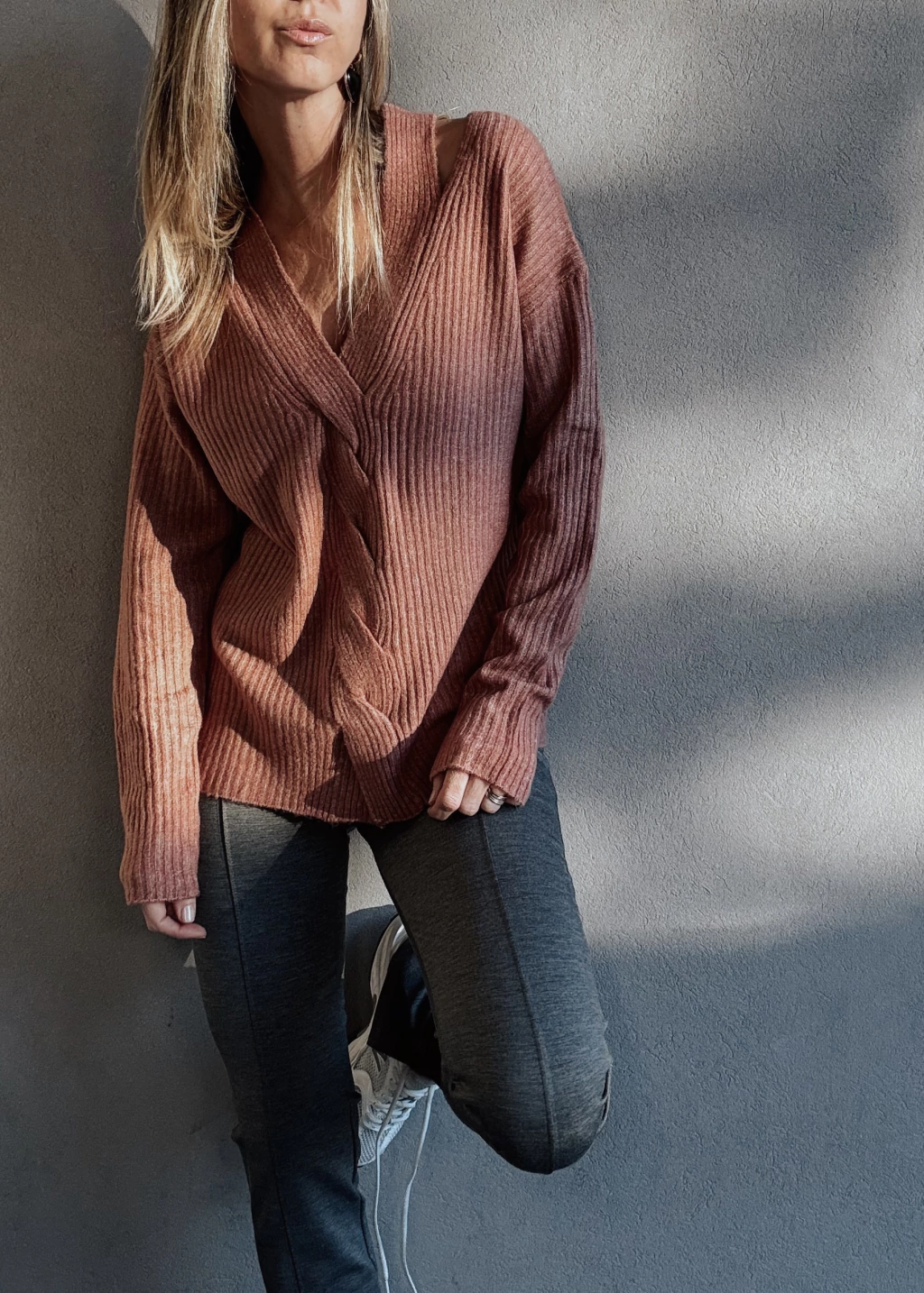 Sweater tejido escote en v con recortes sexys en el cuello. Posee canelones tipo morley & espiga vertical en el centro con pequeño tajo en la parte inferior.
