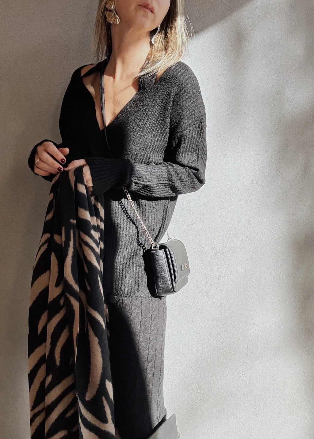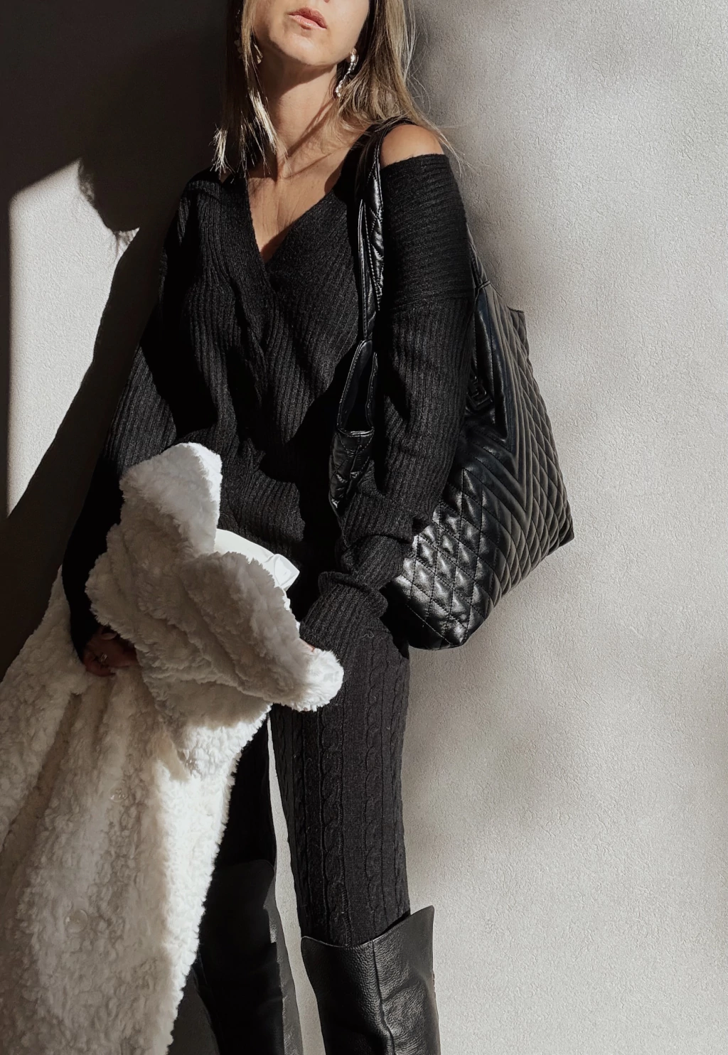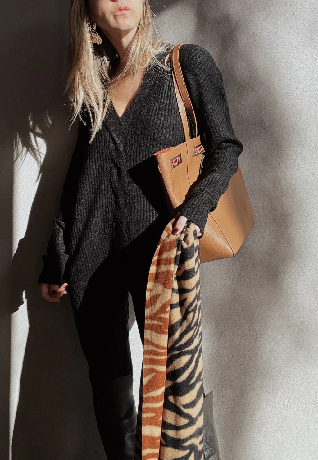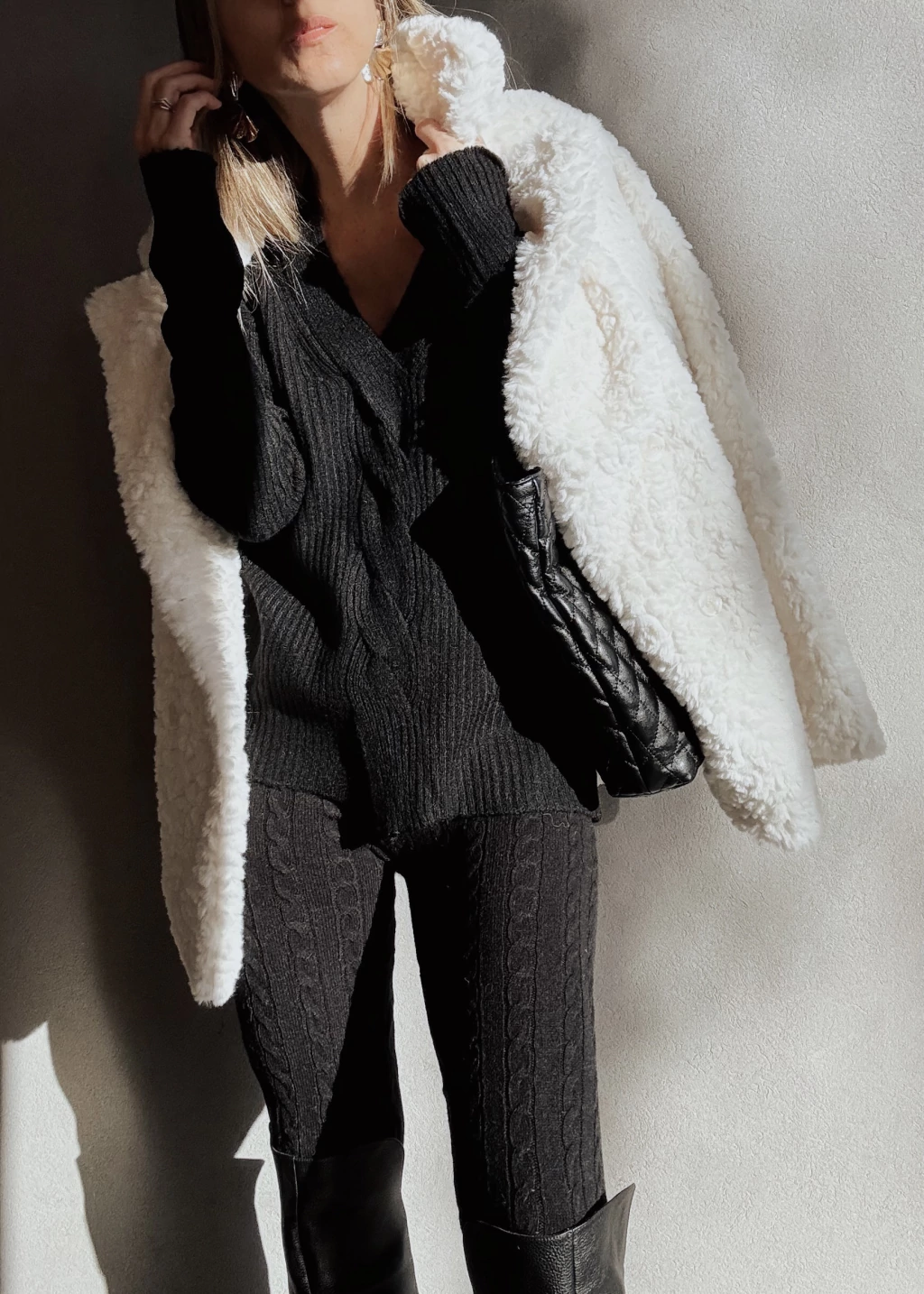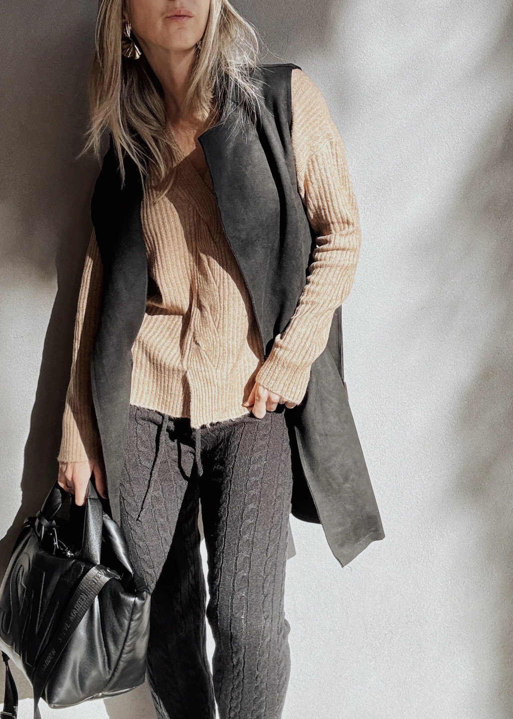 Sweater tejido escote en v con recortes sexys en el cuello. Posee canelones tipo morley & espiga vertical en el centro con pequeño tajo en la parte inferior.