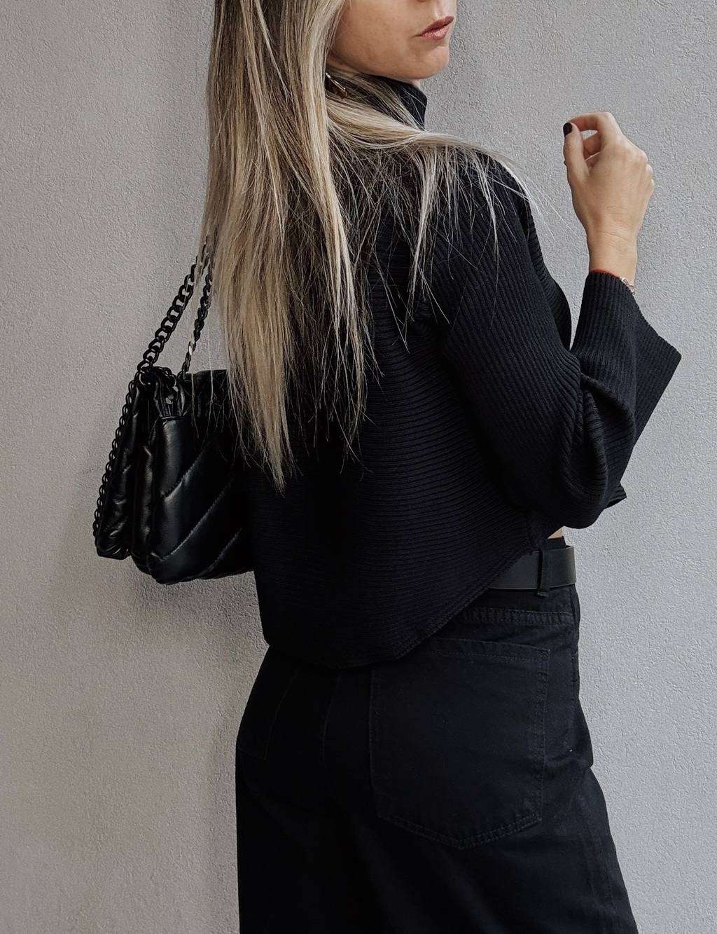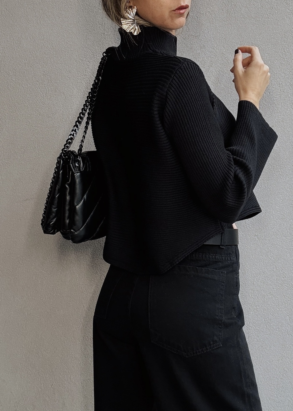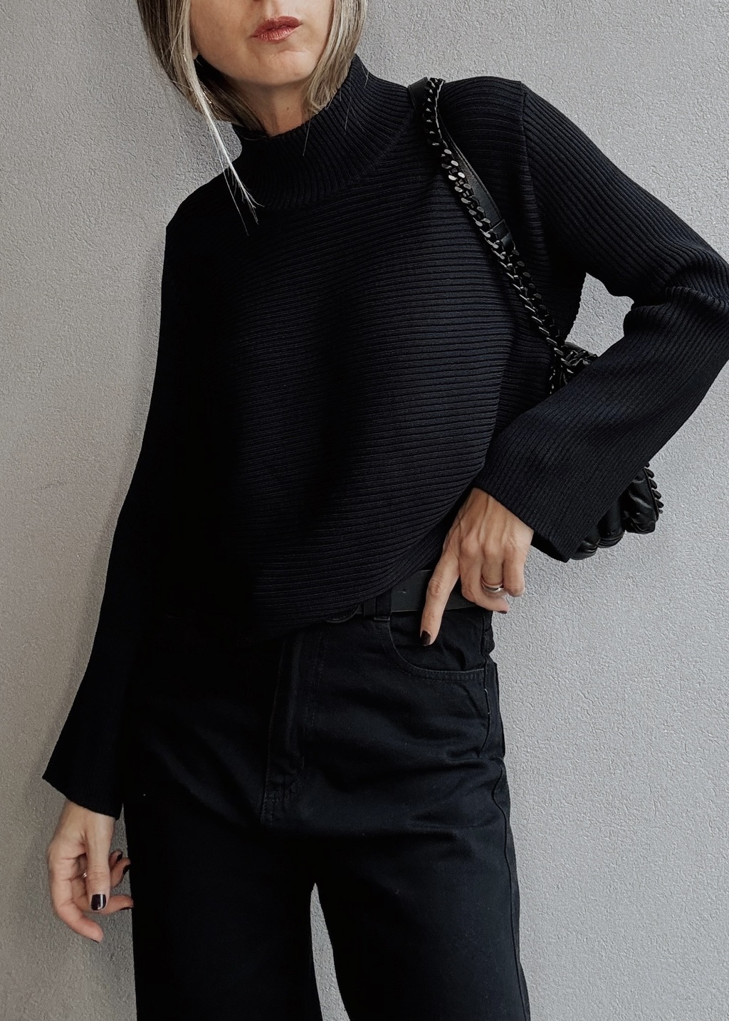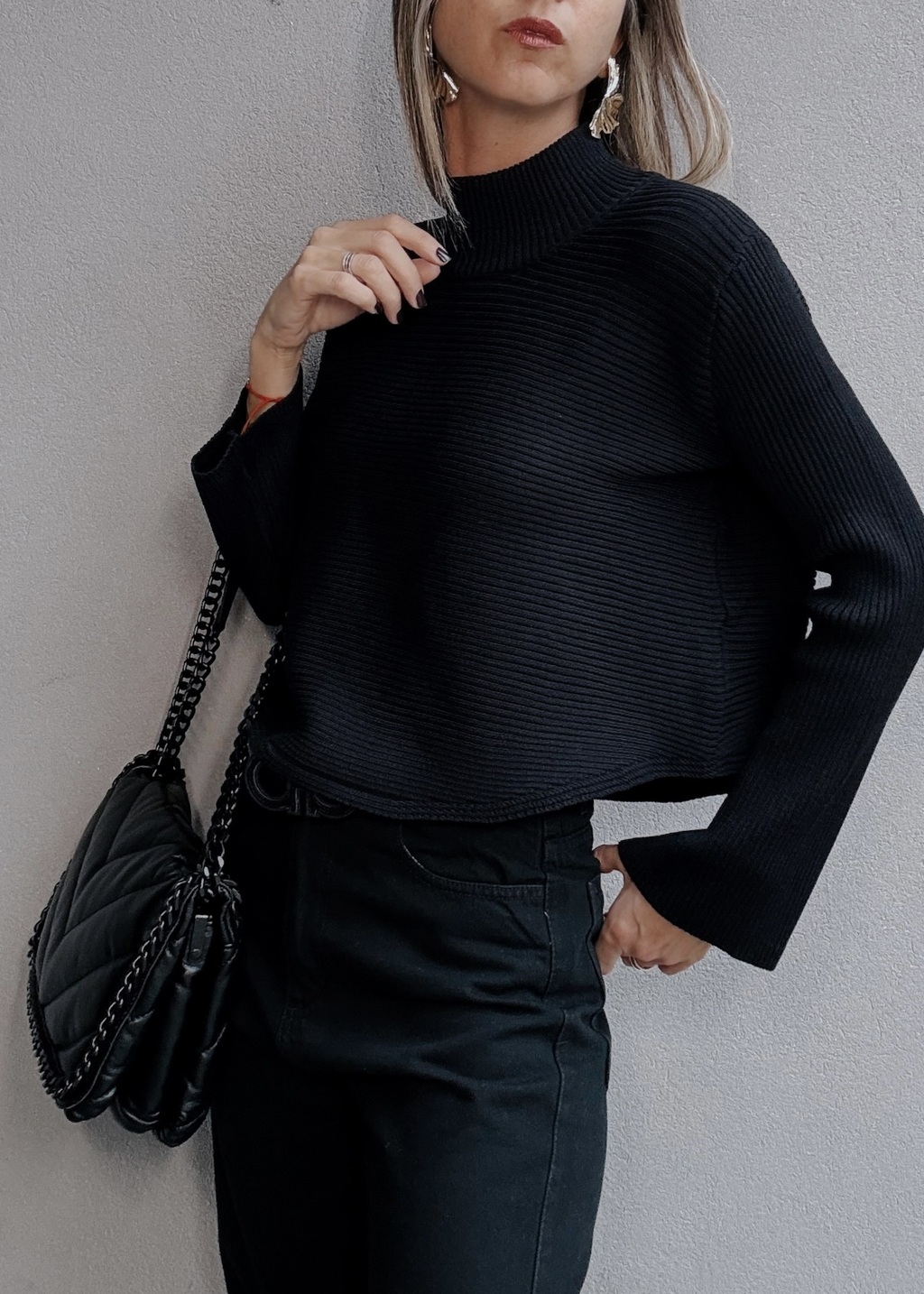 Sweater media polera. Posee canelones horizontales en el torso y canelones verticales en cuello y mangas. No posee puños en las mangas que son tipo campanita, pero si posee puño en cintura. Terminación redondeada tanto al frente como atrás.