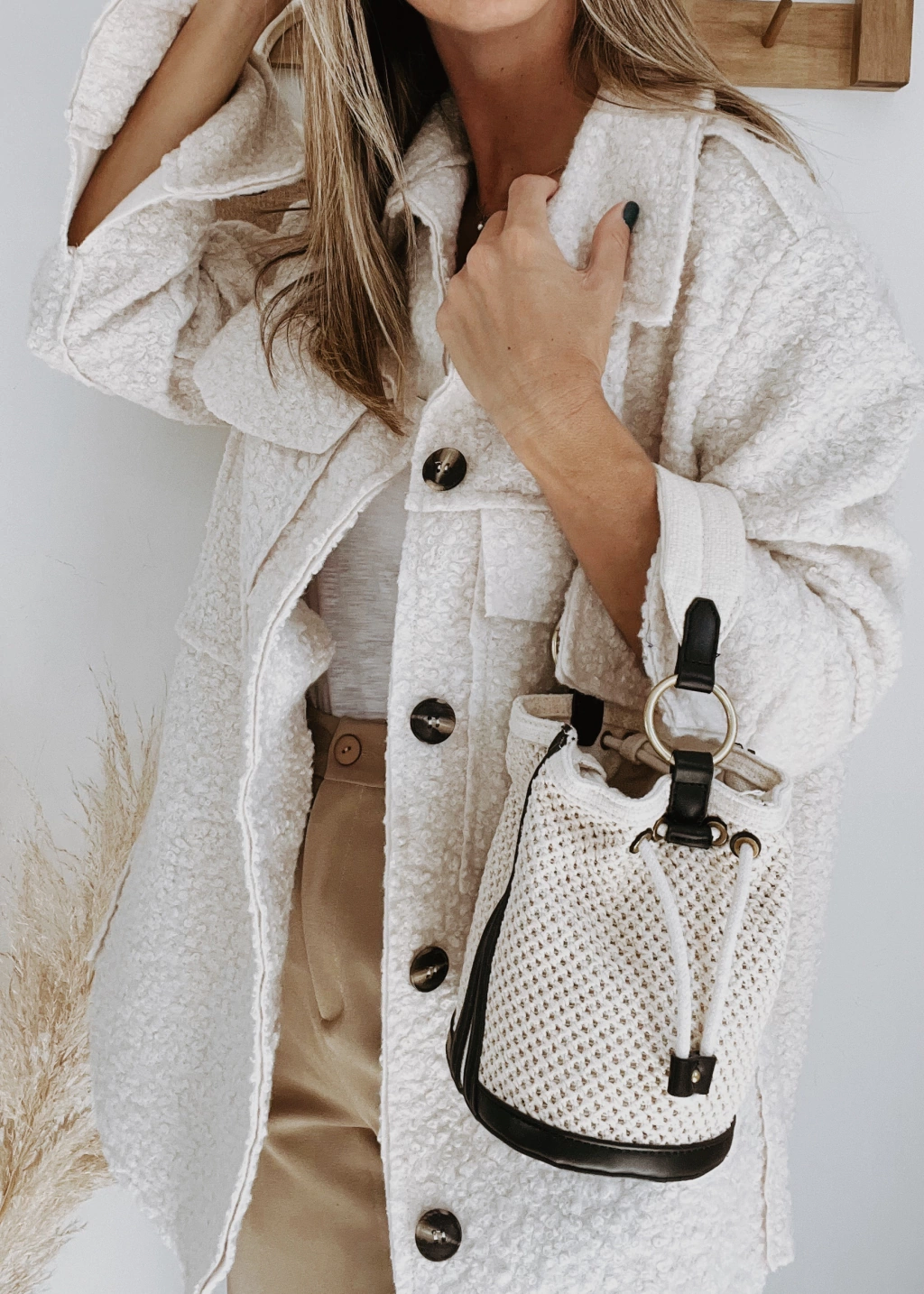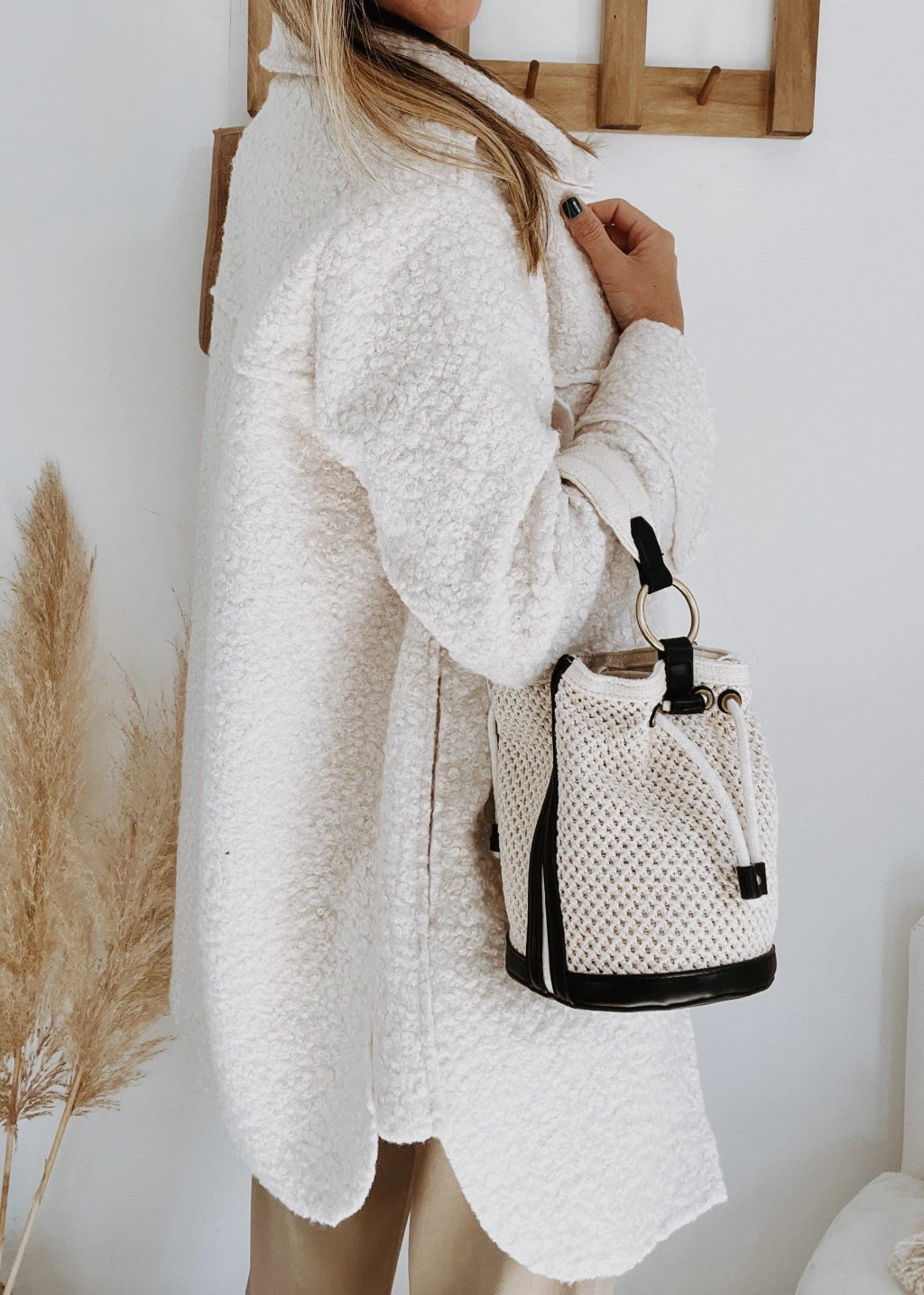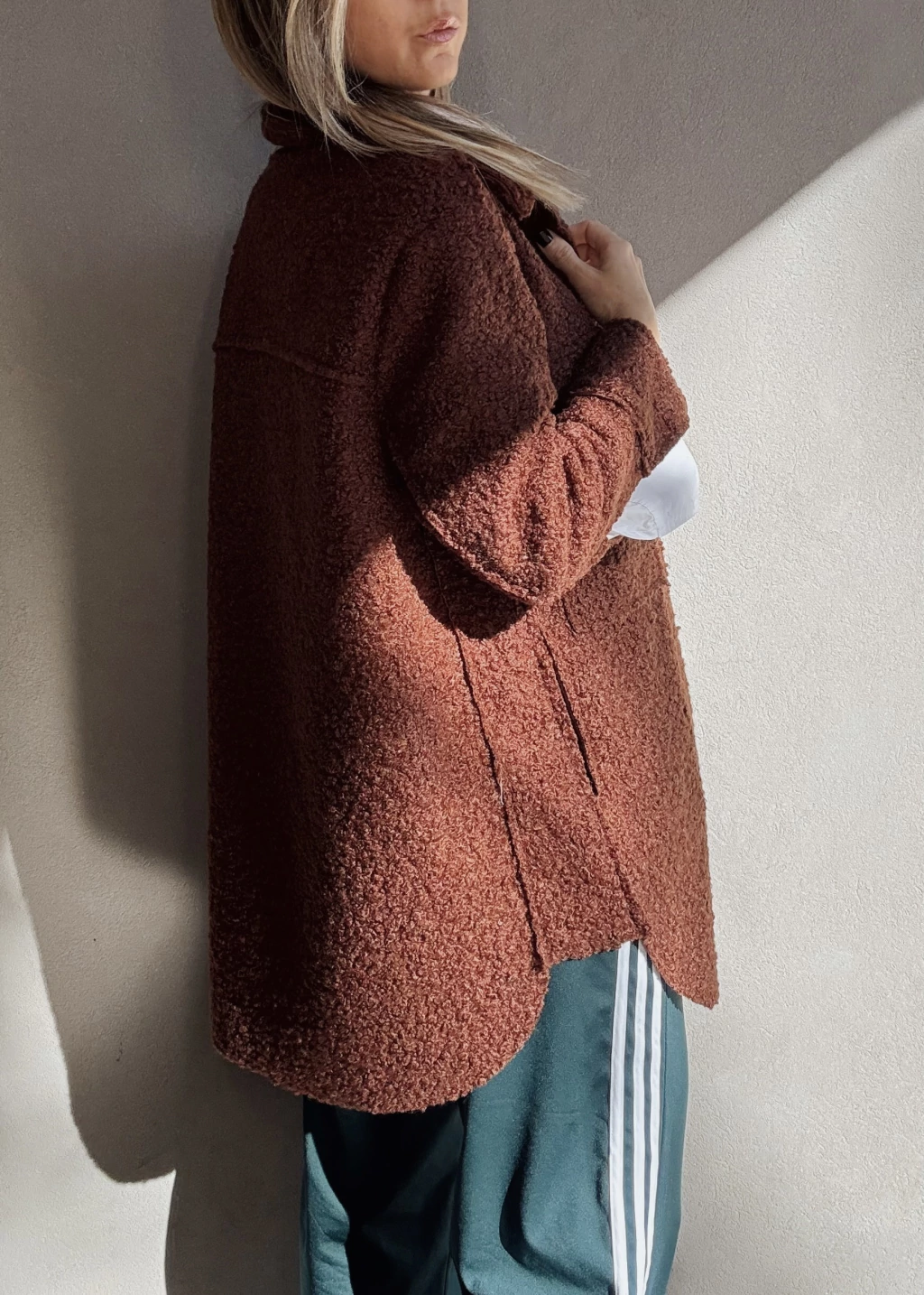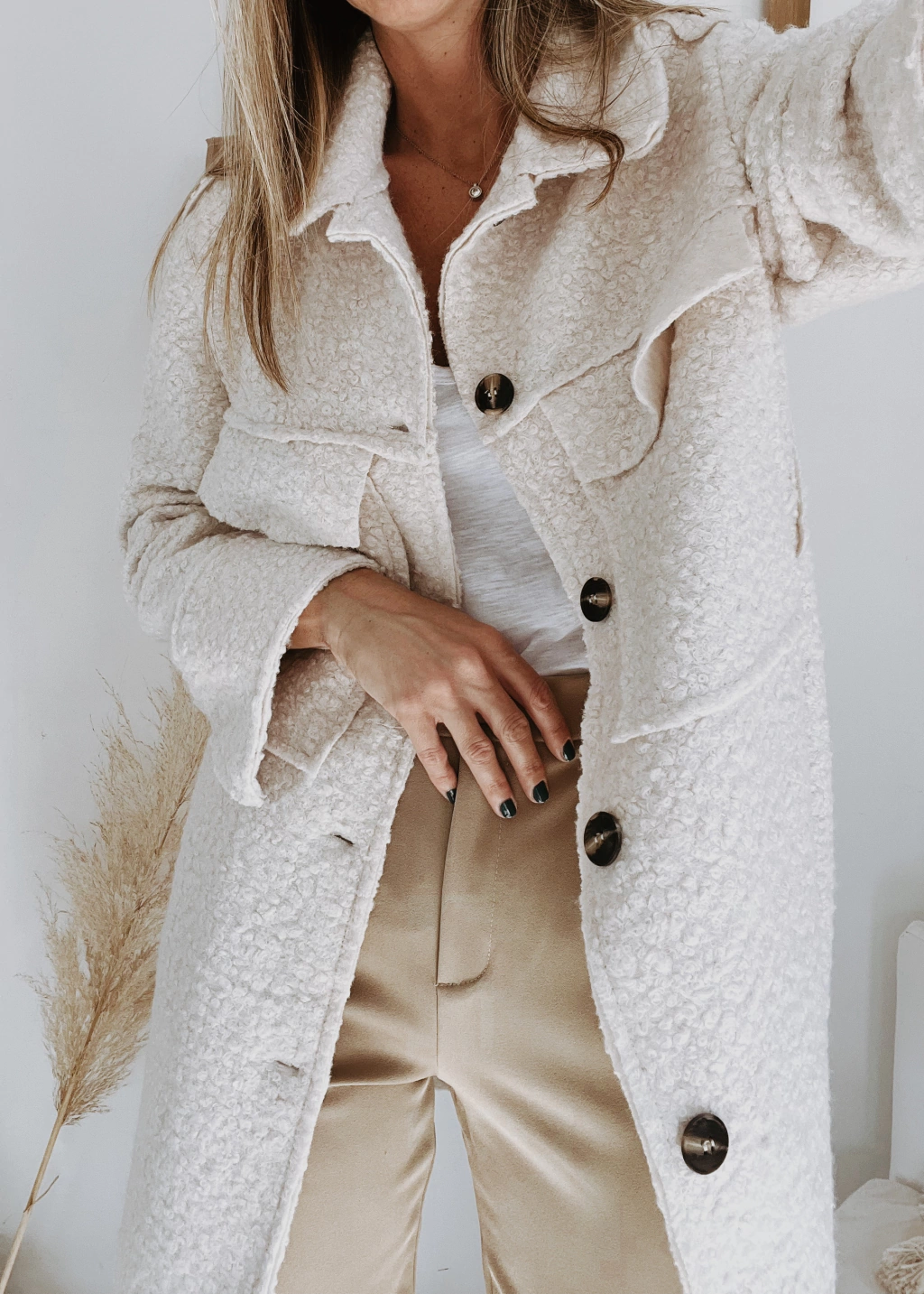 Tapado corte camisaco tipo corderito rústico bucle. Posee dos grandes bolsillos con tapa en la parte superior, y dos bolsillos laterales en la parte inferior. Posee manga con puño y botón. Terminación redondeada.