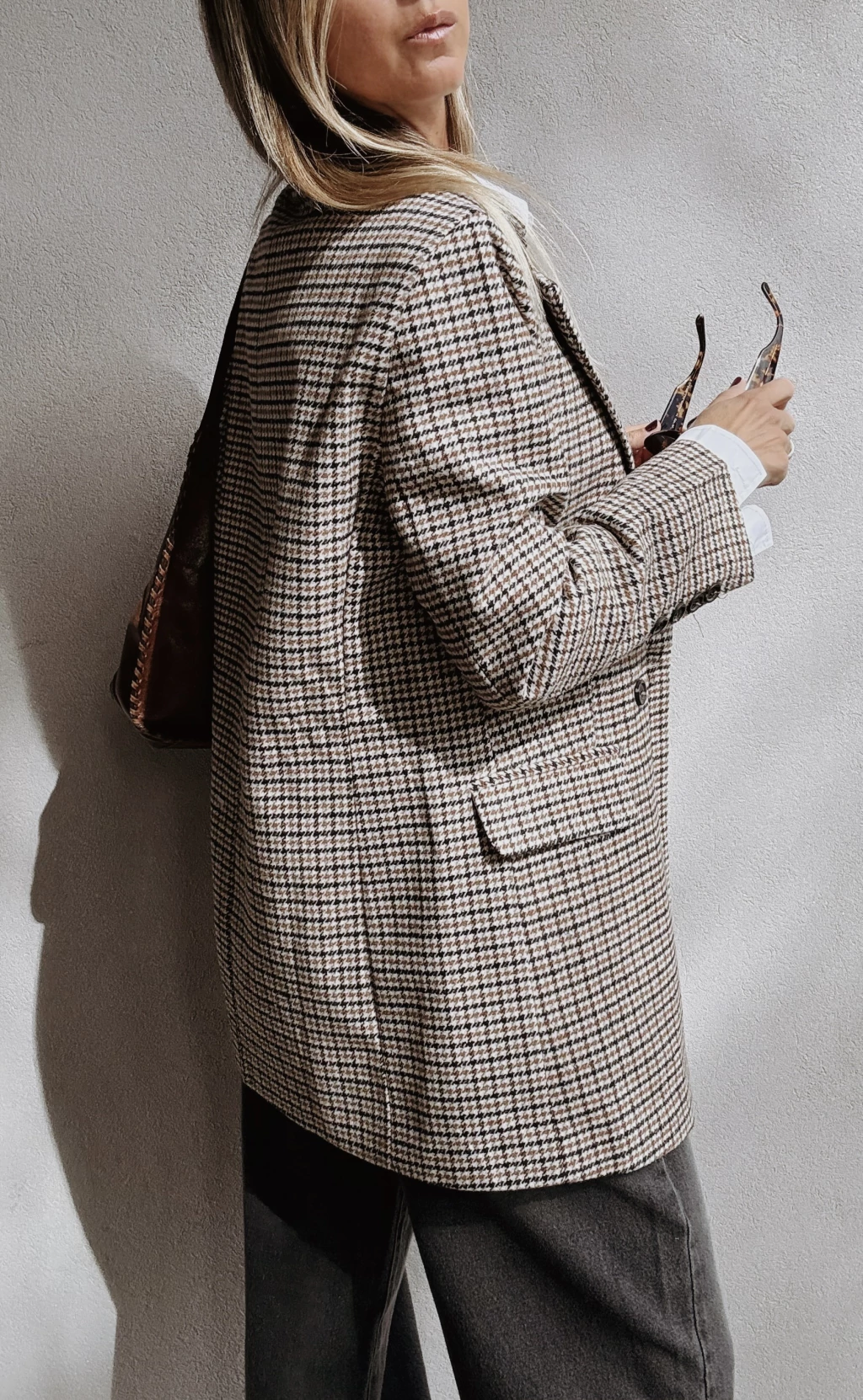 Tapado pied de poule, corte clásico forrado al tono, cruzado con dos botónes reales simil madera. Posee dos bolsillos frontales, reales, con tapa, y pinzas tanto al frente como atrás ya que el mismo es semi entallado.