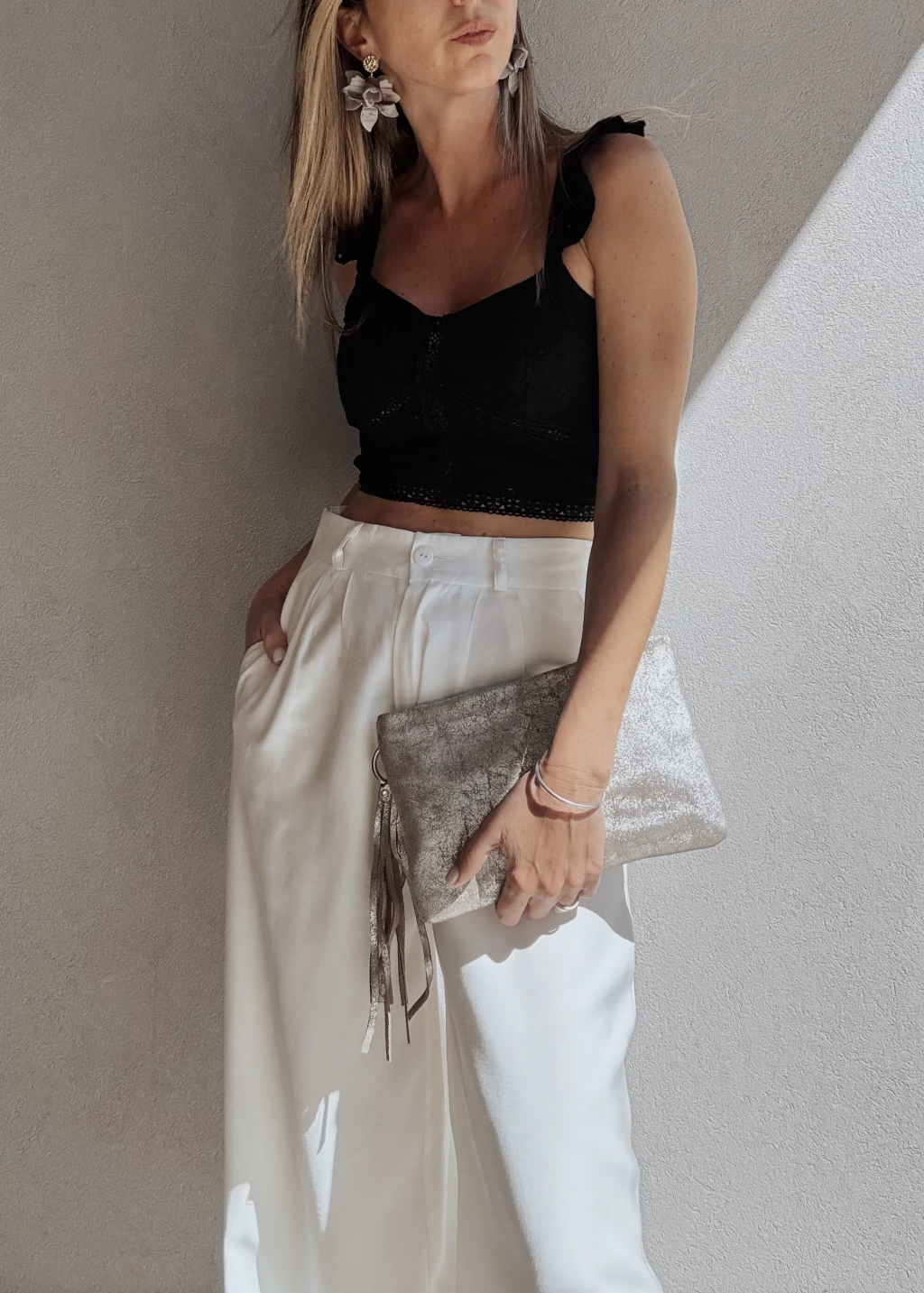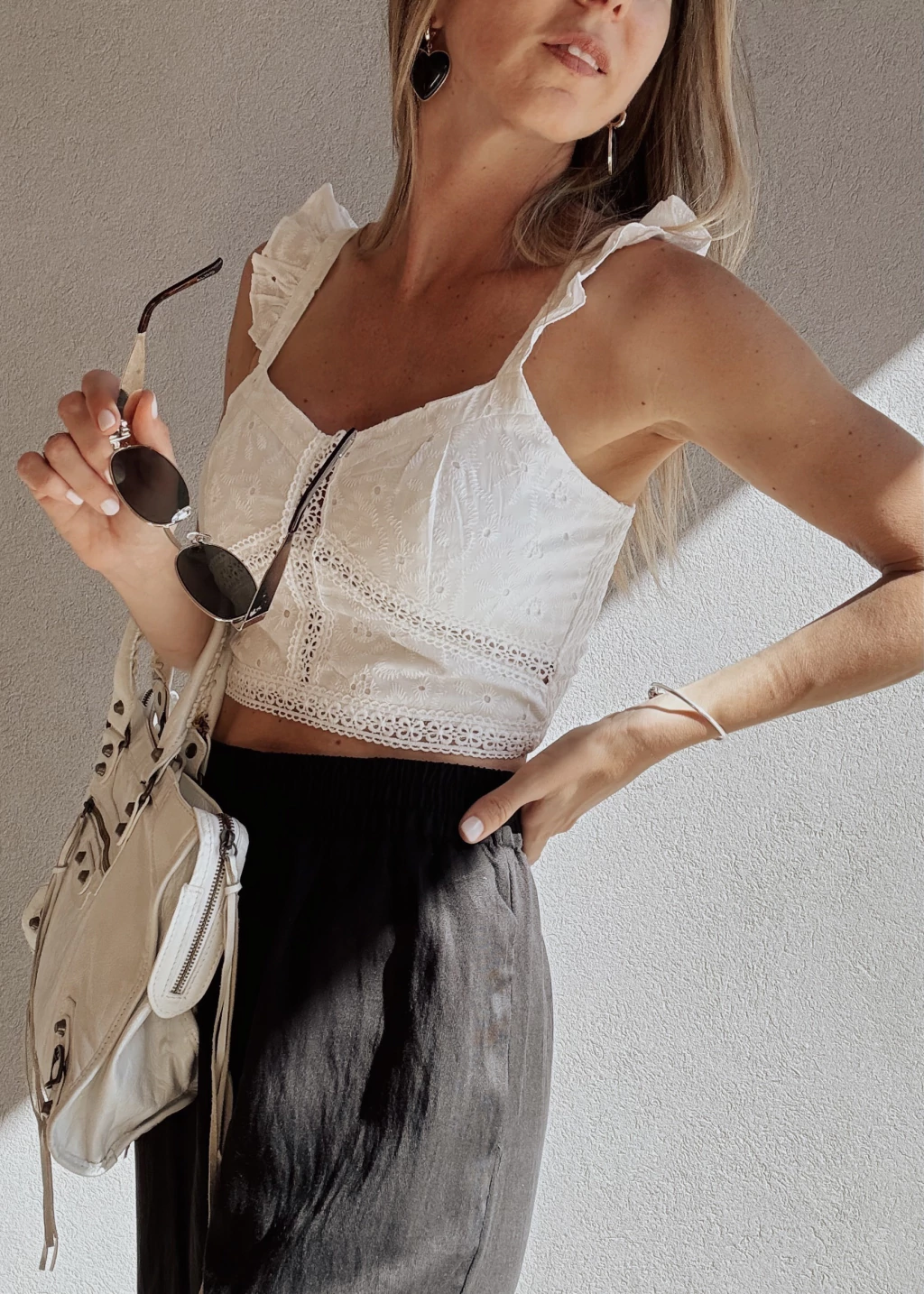 Top corto escote en v con breteles de volados. Parte delantera en broderie con detalle de galón calado en diagonal y horizontal. La espalda es completamente fruncida con smock elástico para un calce ajustable. Terminación con guarda de puntilla fina en el borde superior.