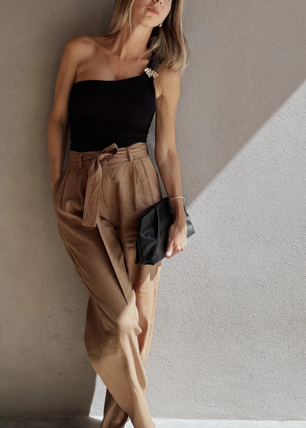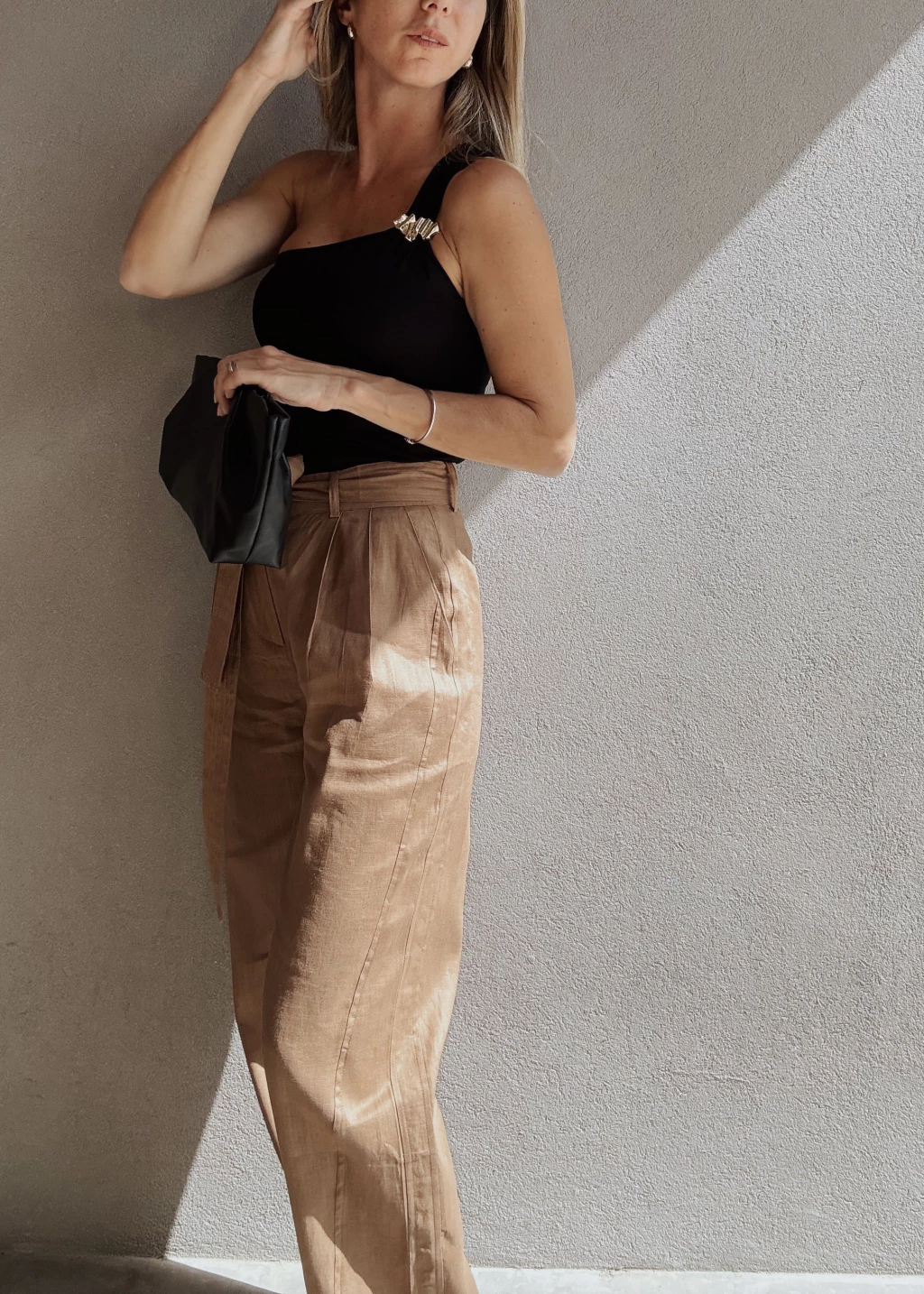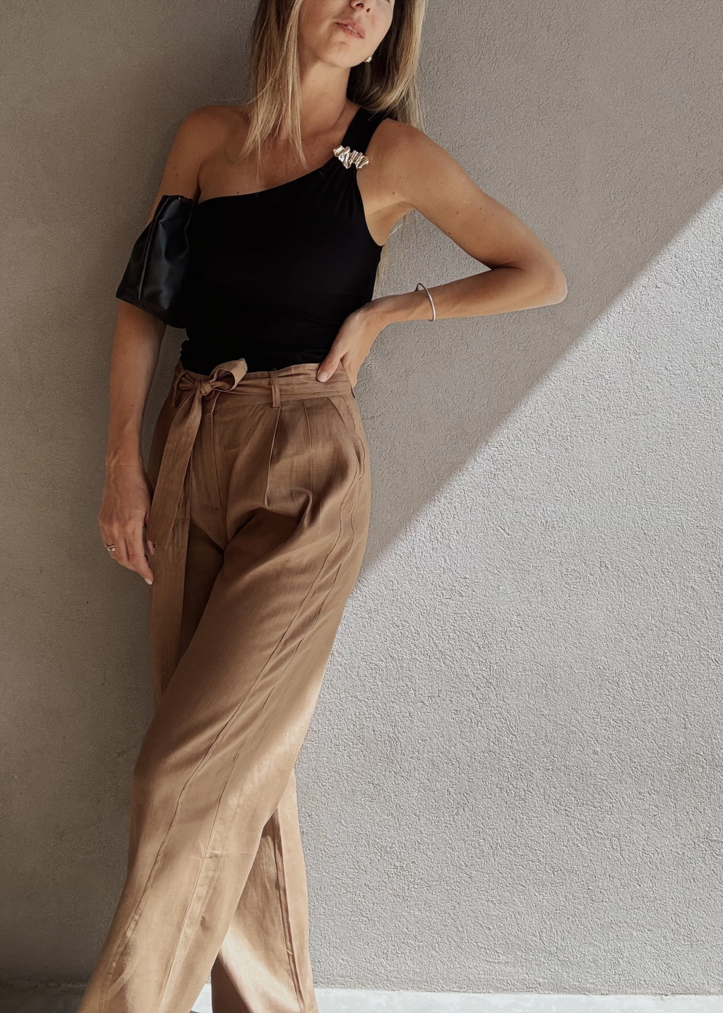 Top de un solo hombro con aplique metálico en el hombro no extraible que aporta un detalle distintivo y elegante. Corte al cuerpo, con terminaciones rectas y forro al tono en la zona del busto.