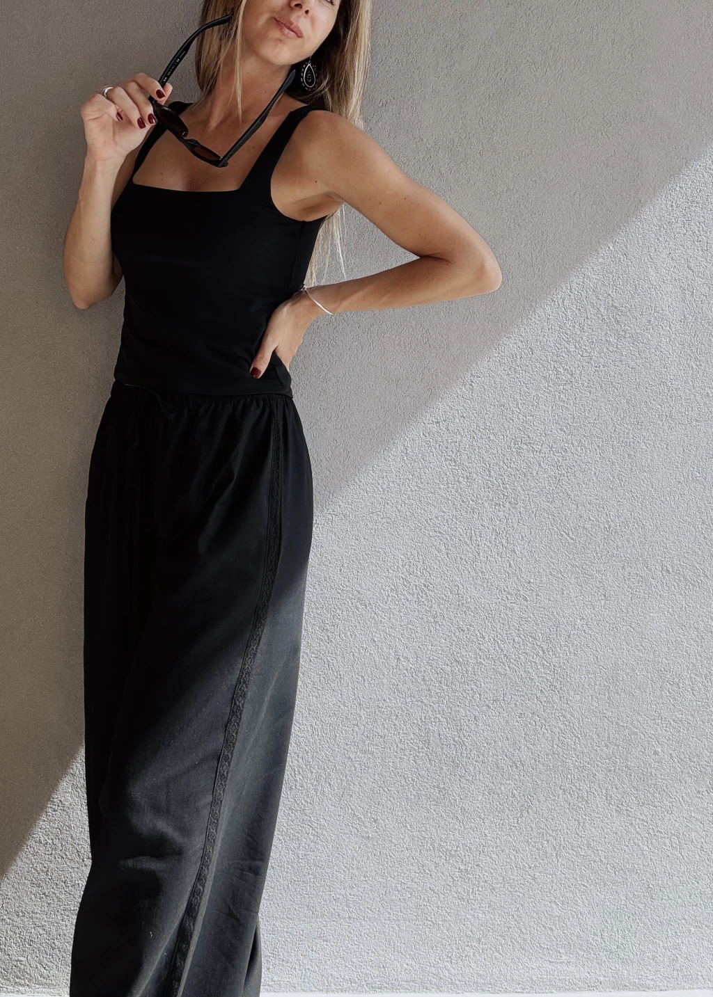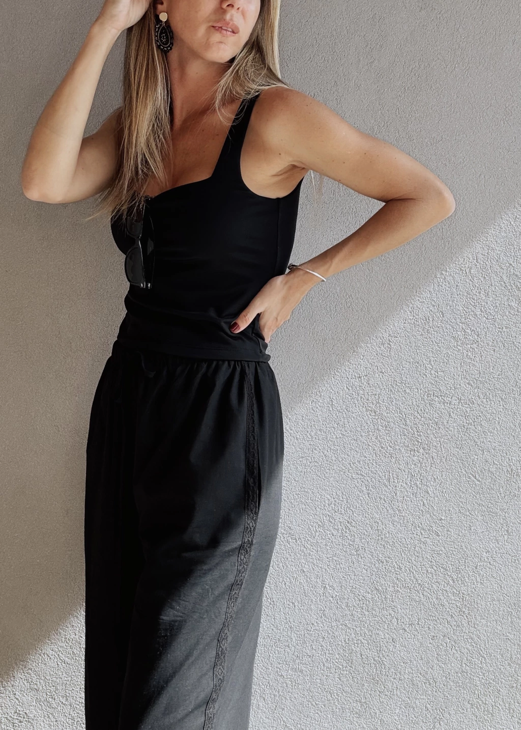 Top de corte recto, con escote cuadrado y tiras anchas que aportan buena sujeción. Silueta al cuerpo con caída limpia y terminación prolija. Posee forro al tono en la zona del busto.