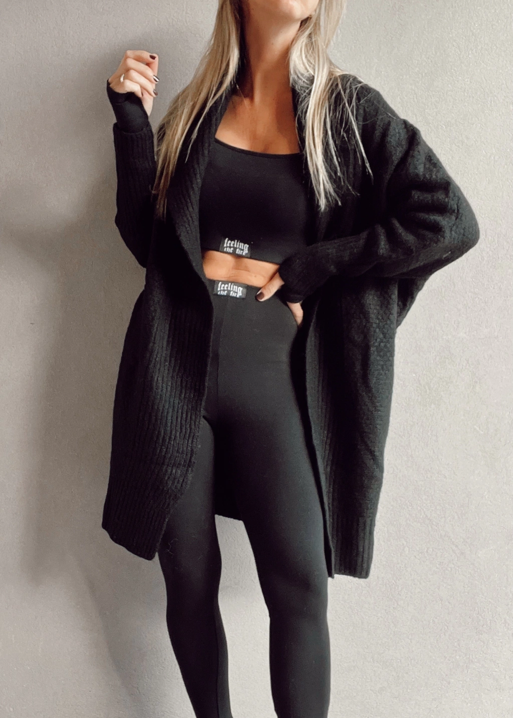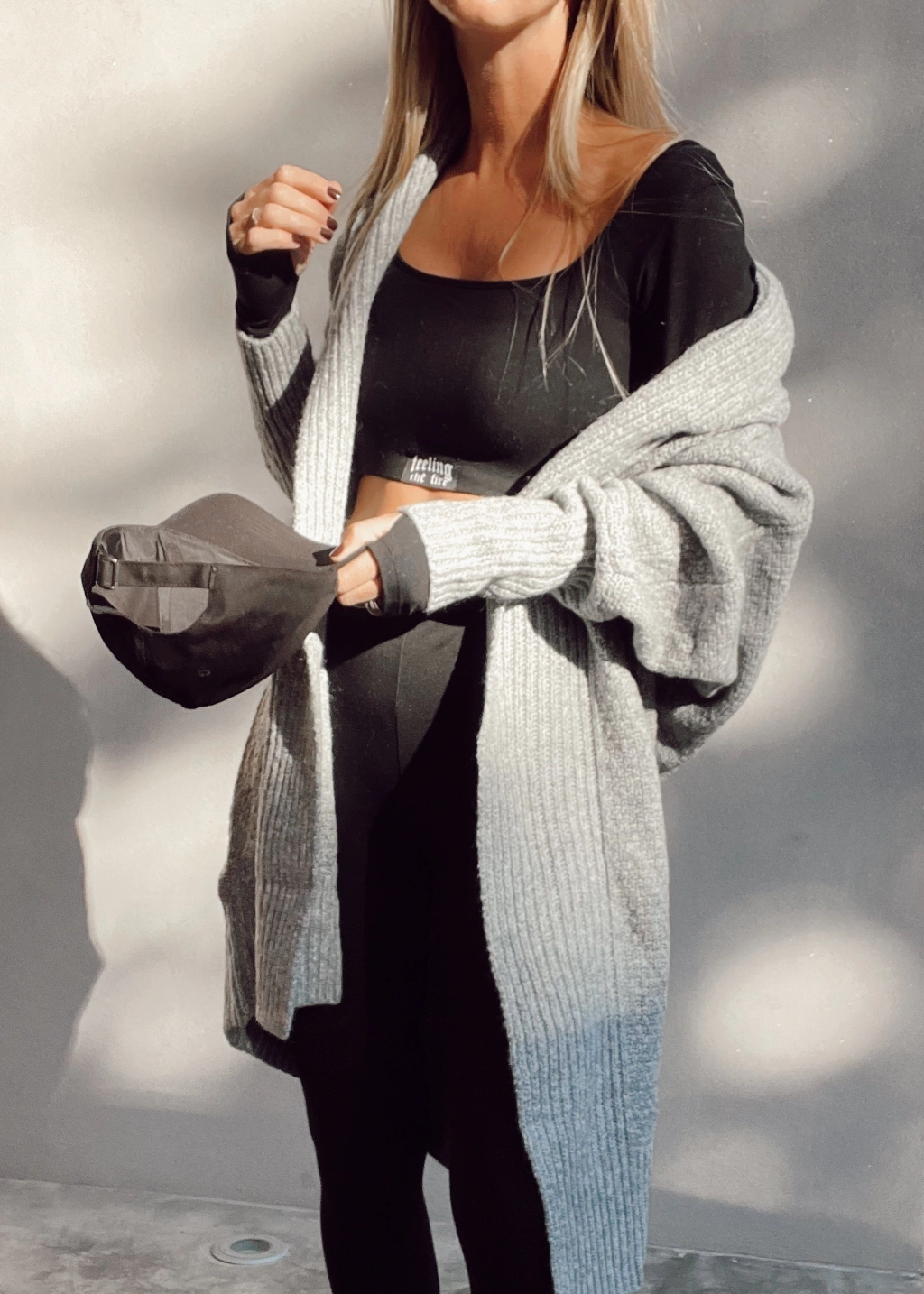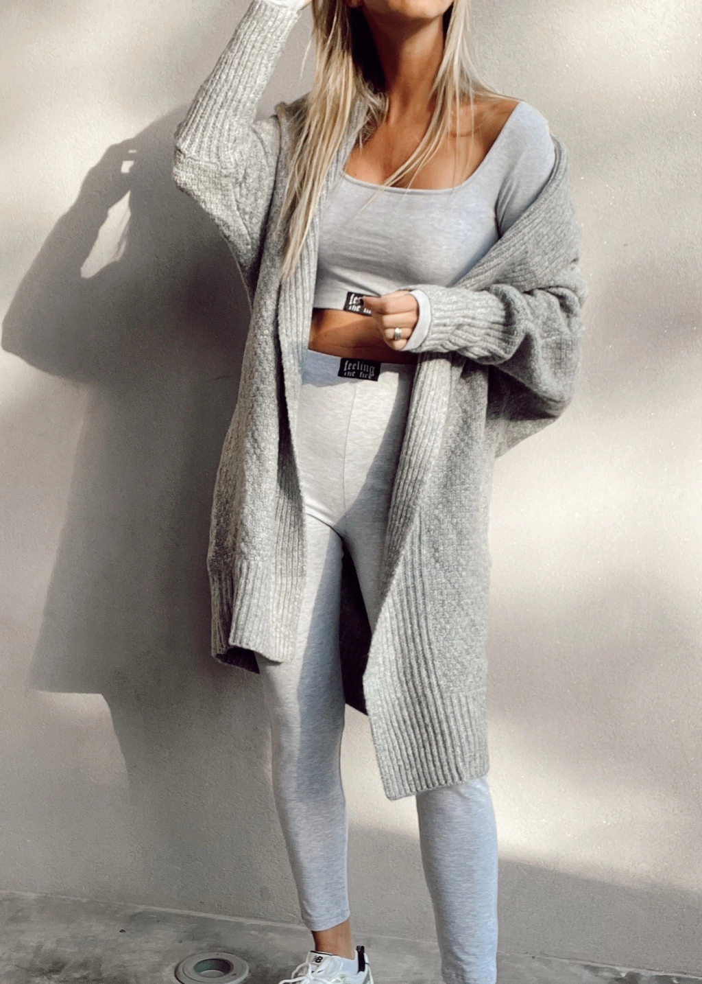Top manga larga, al cuerpo. Escote y espalda en U. Posee abertura para el dedo pulgar en las mangas.
