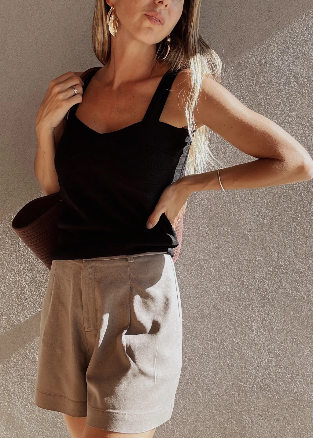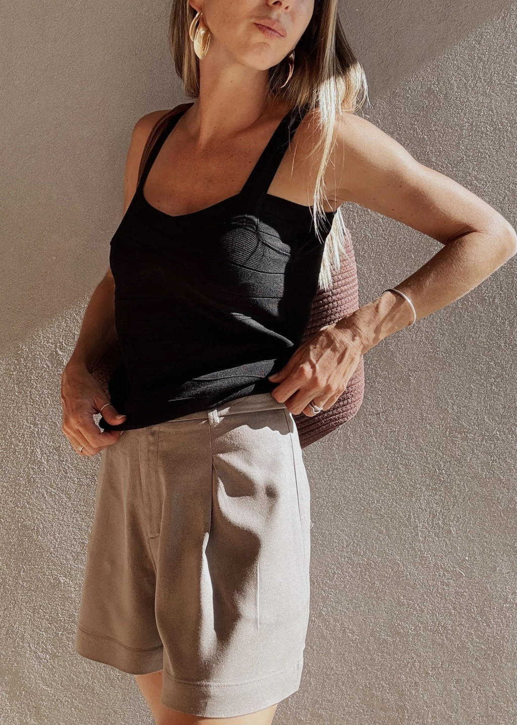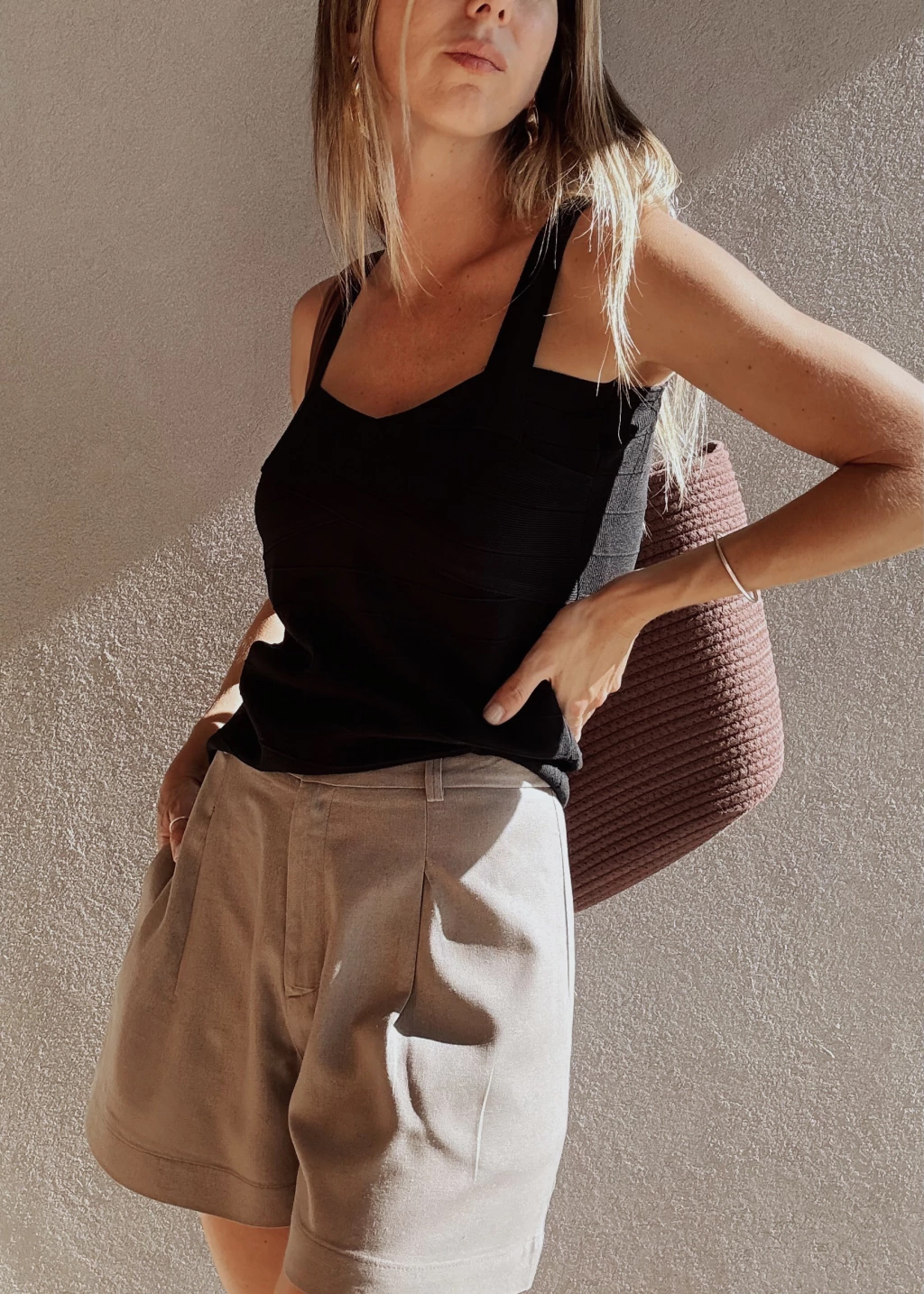 Top tejido con textura de líneas horizontales. Breteles anchos y fijos. Posee dos guardadas que se entrecruzan en la zona del busto.