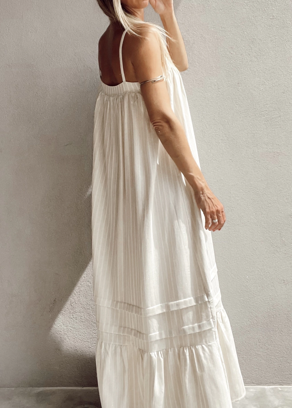Amplio vestido escote recto con frunces que generan gran vuelo y bretles finitos fijos. El mismo posee pespuntes horizonates y gran volado en la base.