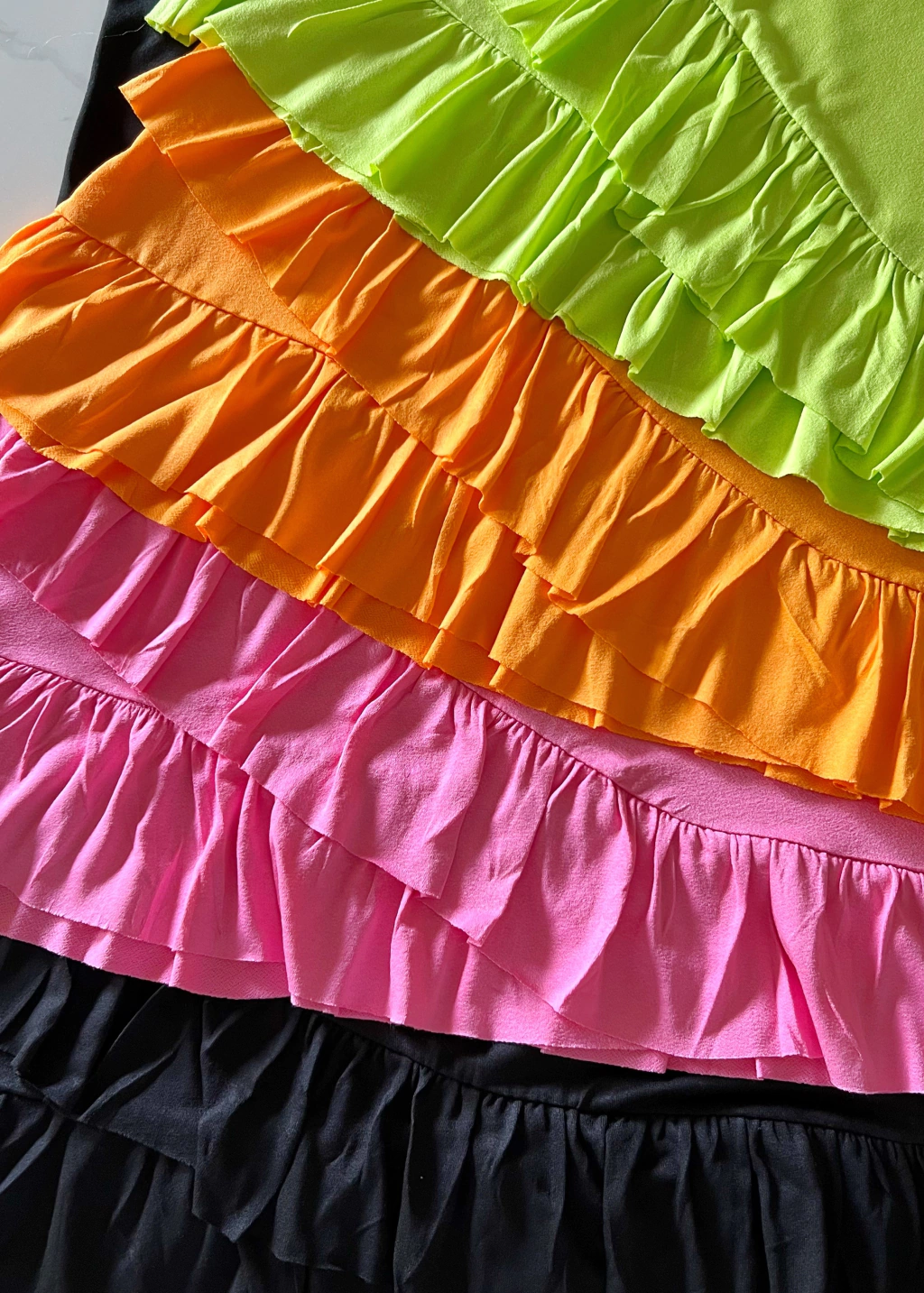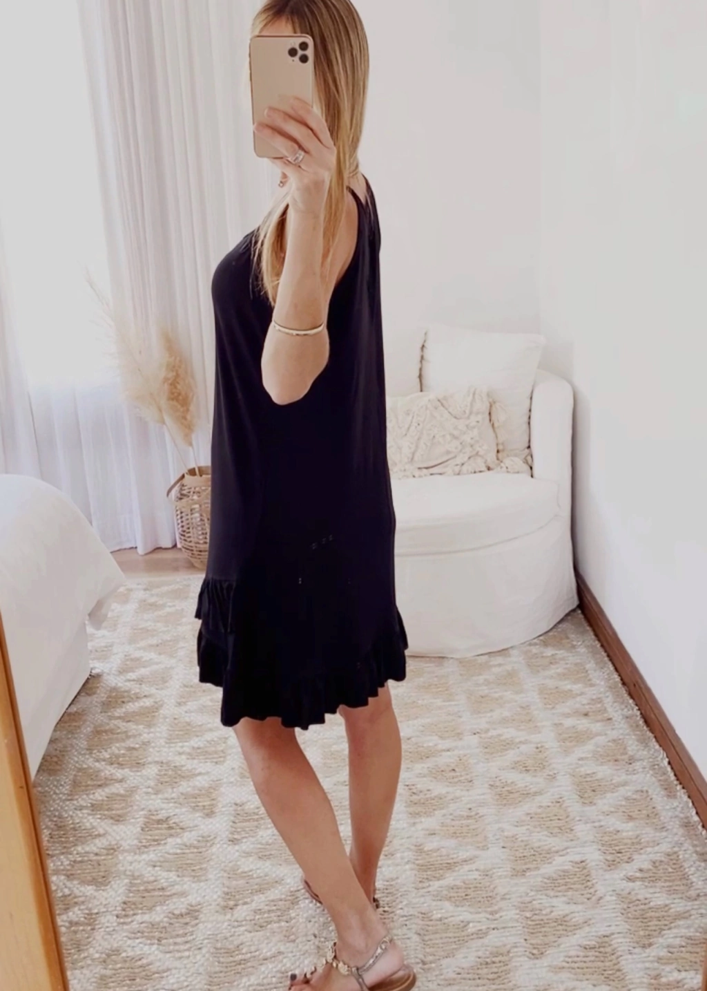 Vestido con breteles fijos y escote americano con volado cruzado en base. Pequeña gota abierta en la espalda.