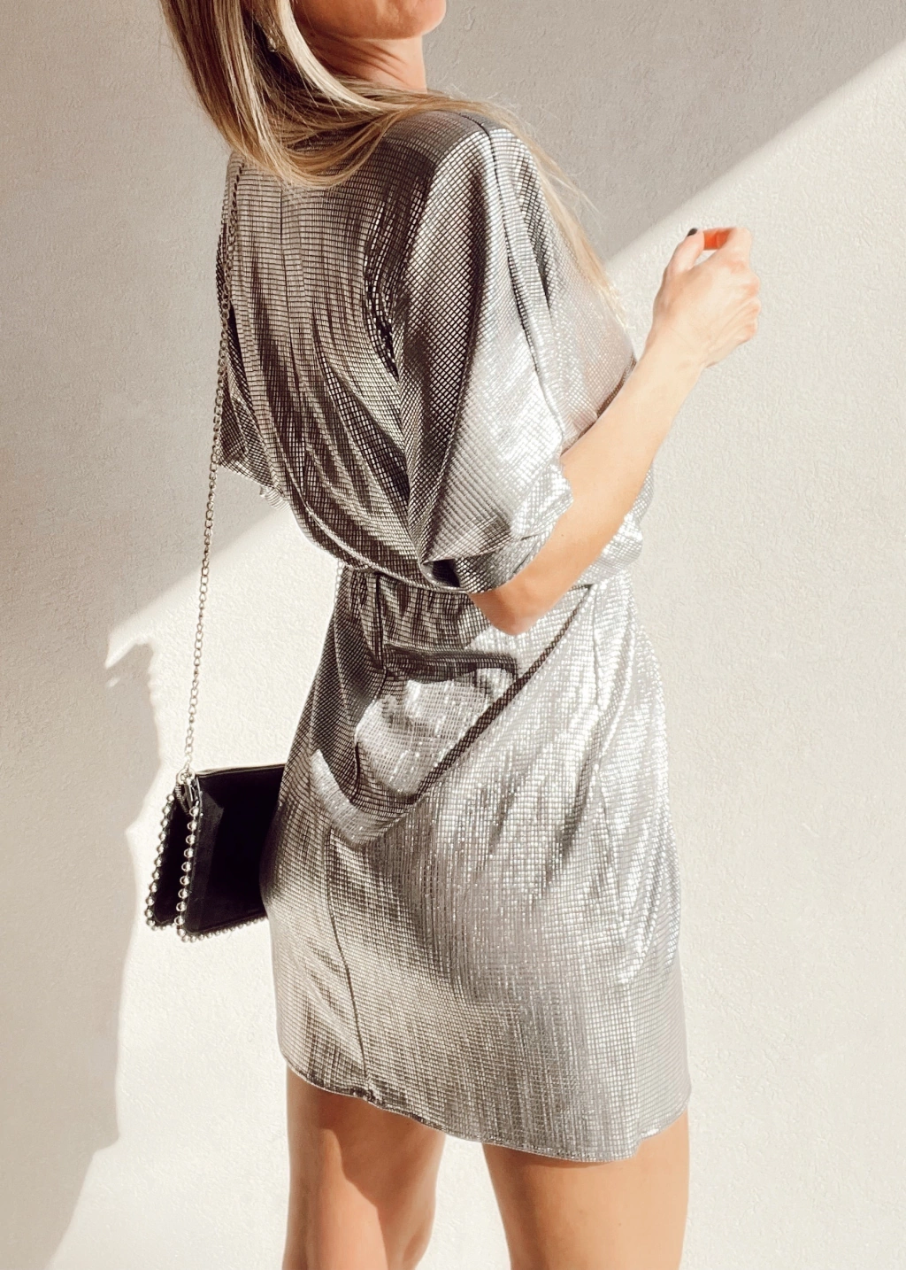 Vestido escote profundo en V, efecto cruzado de lentejuelas espejo, manga murciélago al codo. Posee hombreras y elástico en la cintura, con falda cruzada y terminación redondeada. La espalda es cerrada.