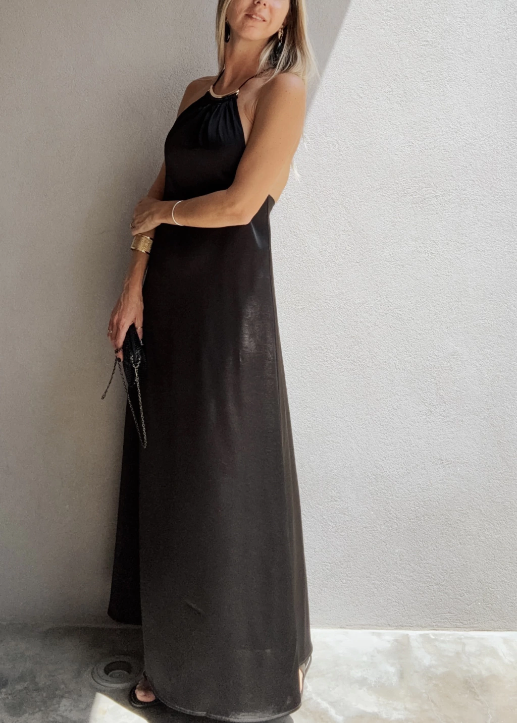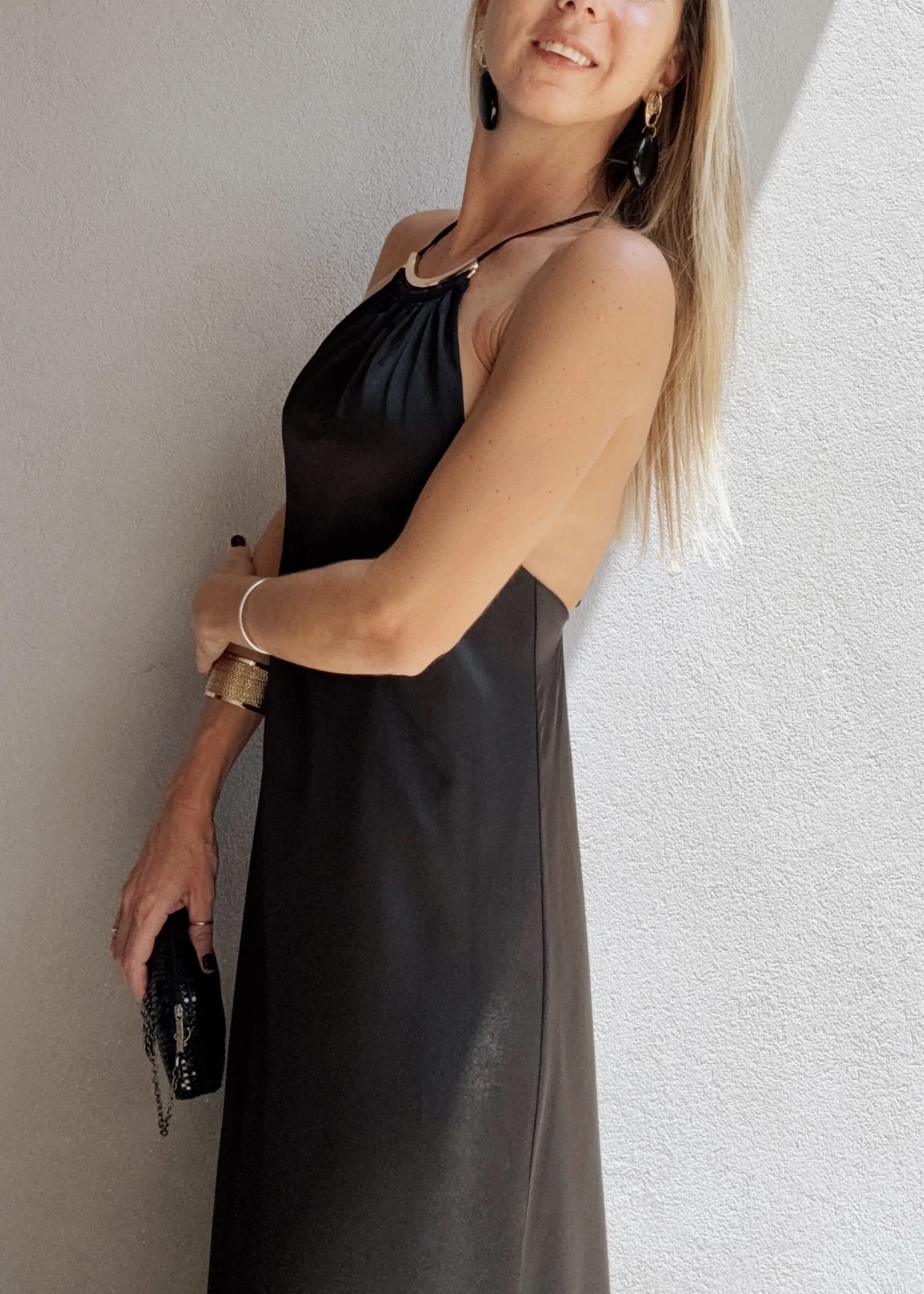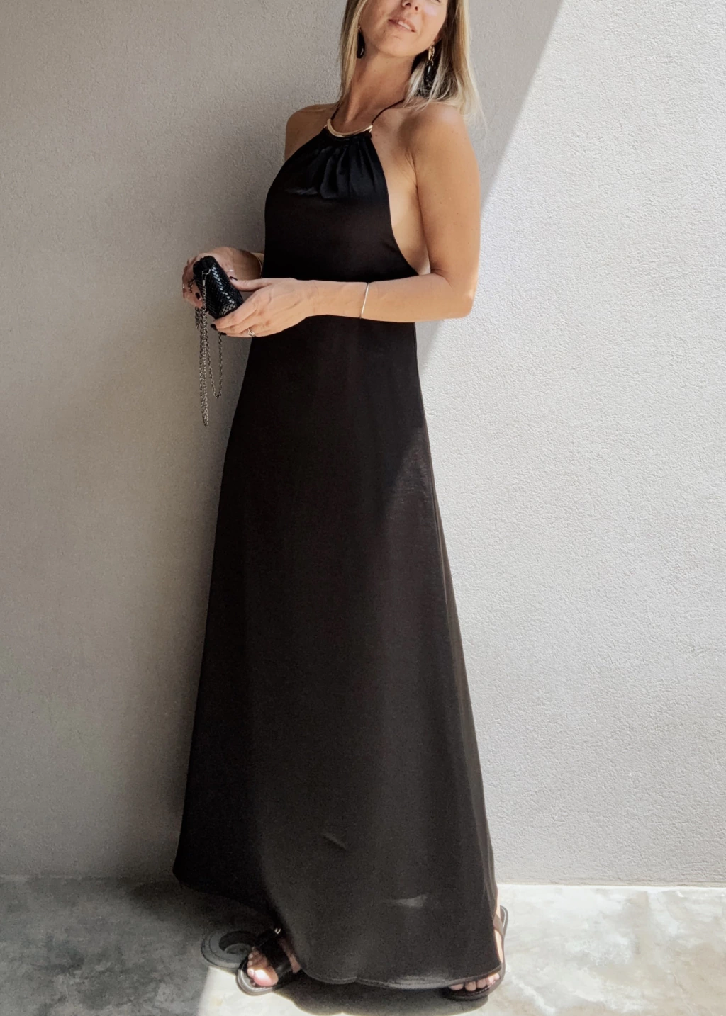 Vestido largo con caída fluida, escote halter con detalle metálico rígido al frente. La espalda es profundamente escotada, con tiras finas con punteras metálicas que se cruzan y ajustan mediante un lazo regulable, permitiendo adaptar el calce. Sisa profunda. Interior íntegramente forrado al tono para mayor prolijidad y sostén.