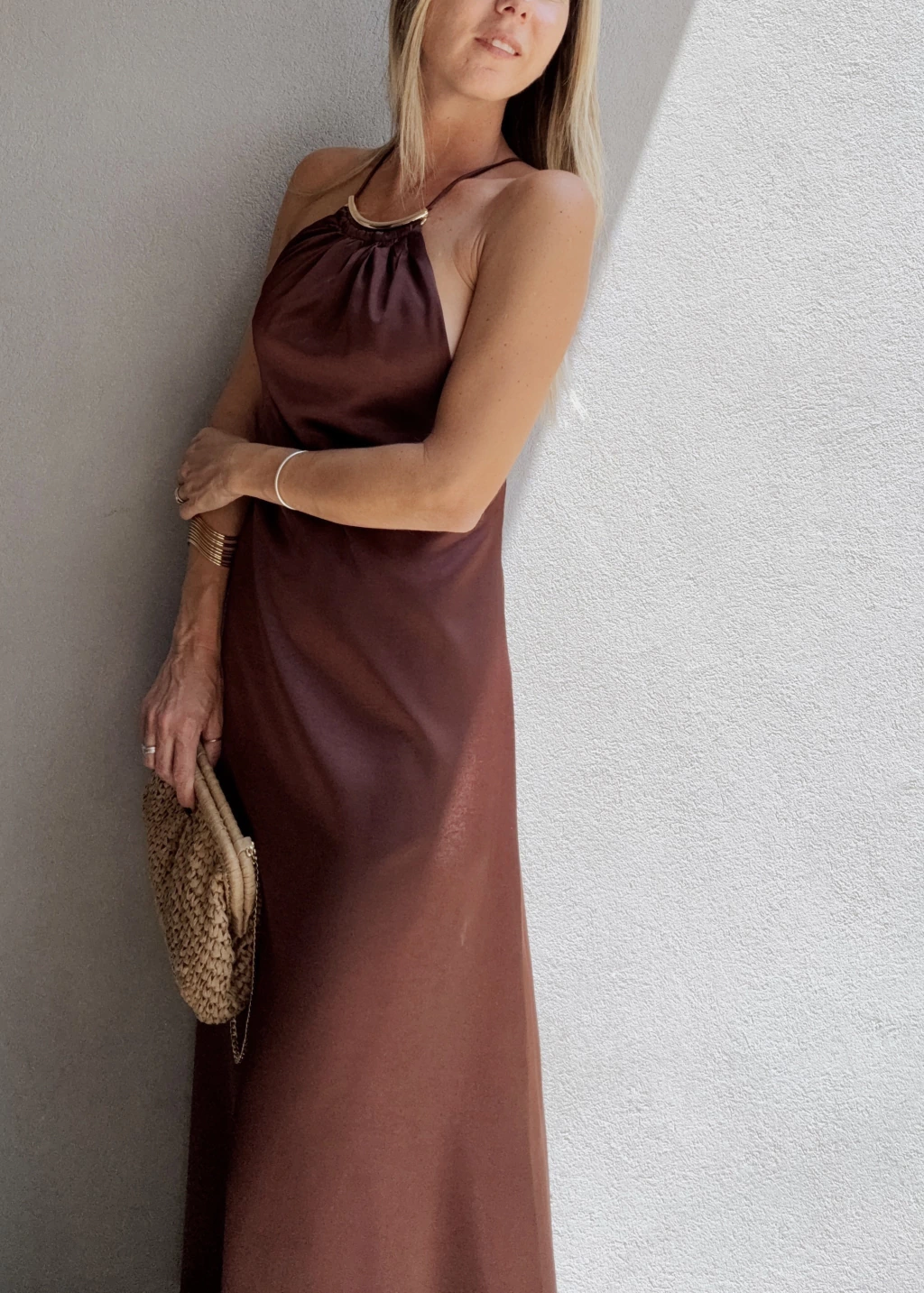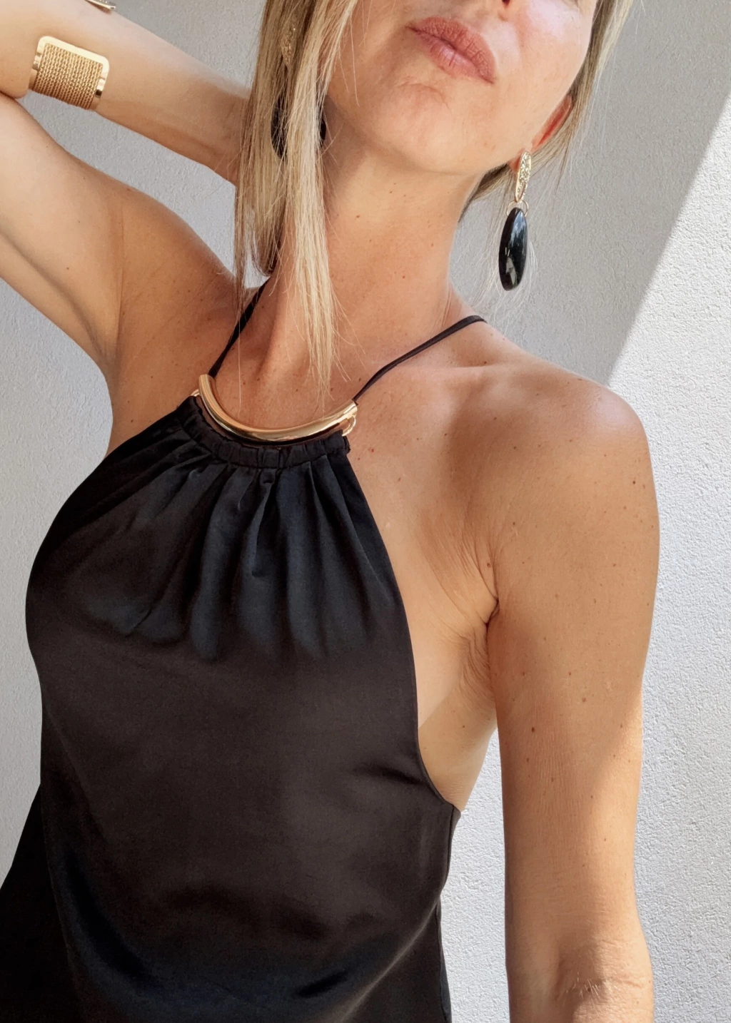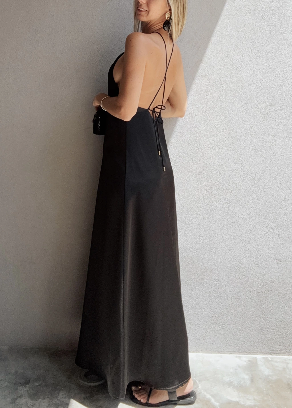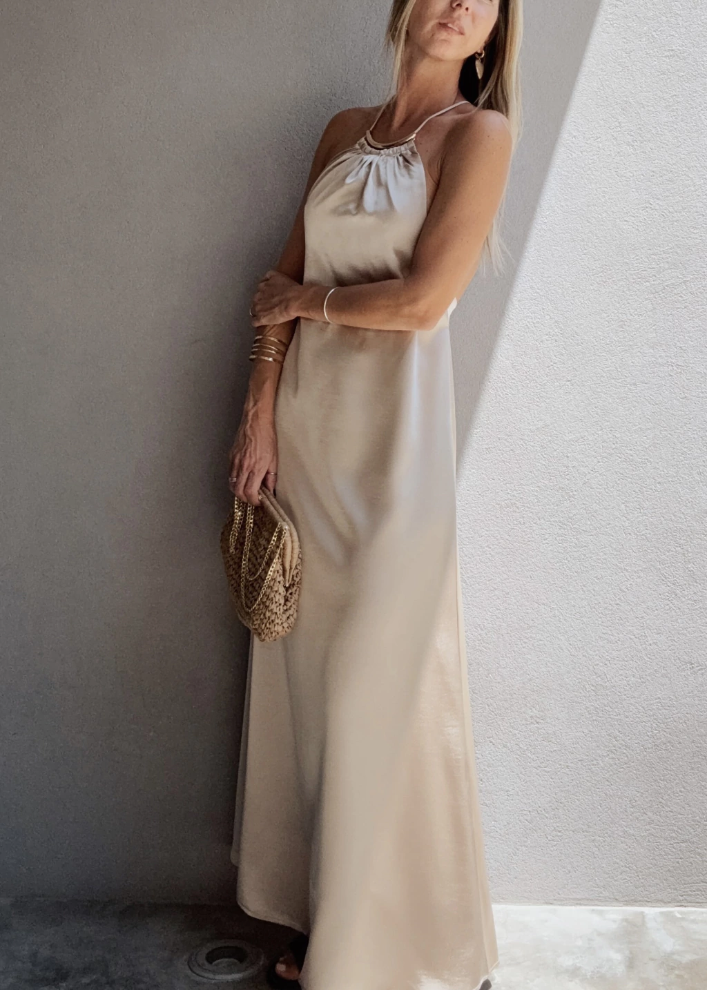 Vestido largo con caída fluida, escote halter con detalle metálico rígido al frente. La espalda es profundamente escotada, con tiras finas con punteras metálicas que se cruzan y ajustan mediante un lazo regulable, permitiendo adaptar el calce. Sisa profunda. Interior íntegramente forrado al tono para mayor prolijidad y sostén.