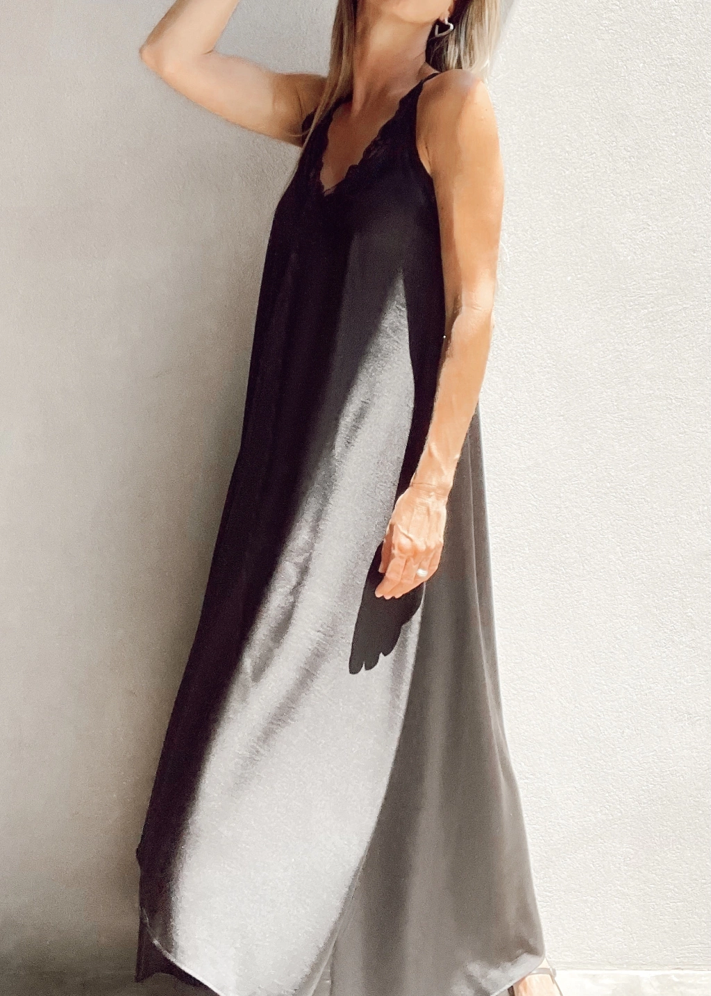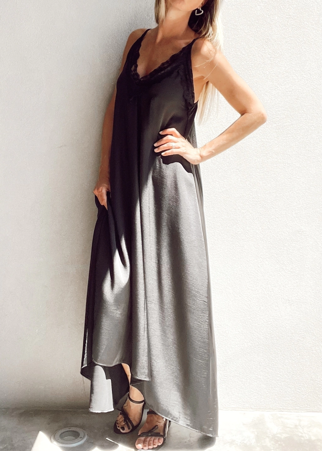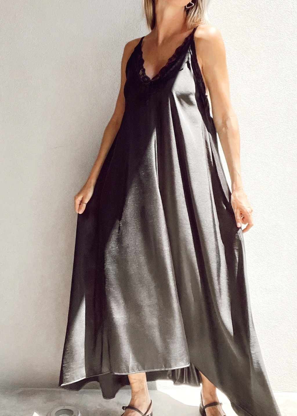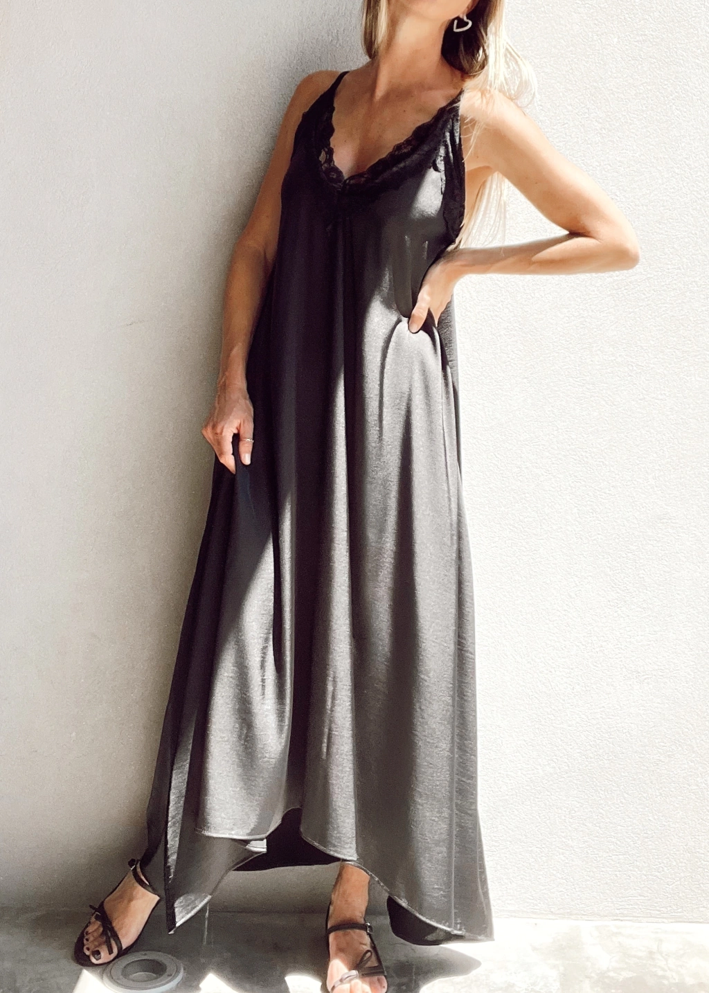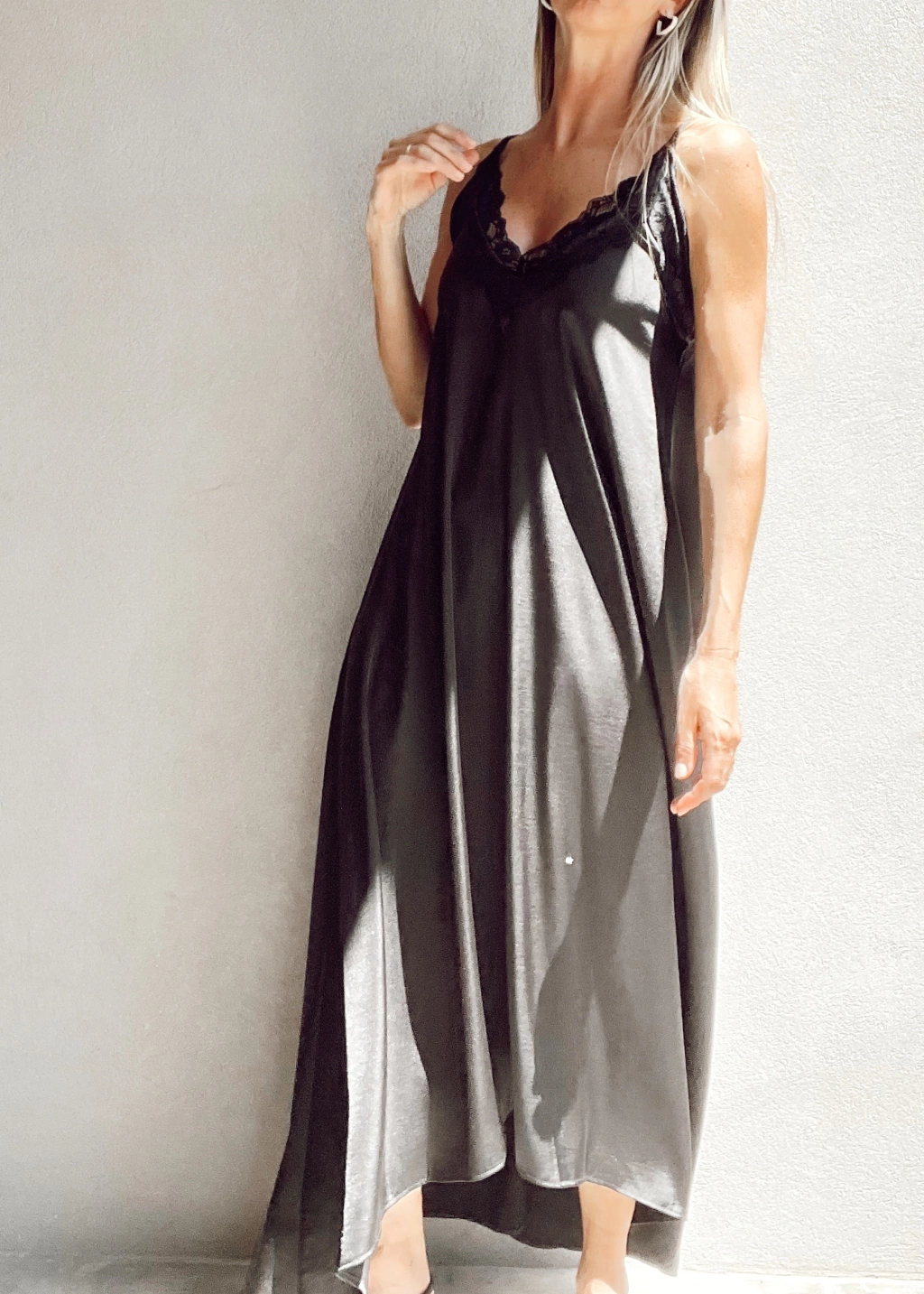 Vestido lencero escote en v con encaje, breteles fijos, y espalda con elástico. Corte evase, más largo atrás que al frente.