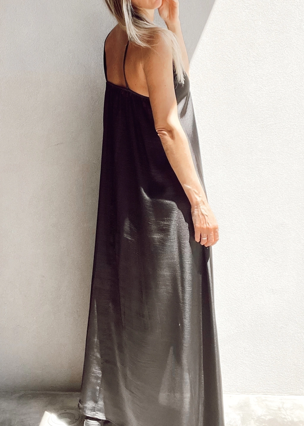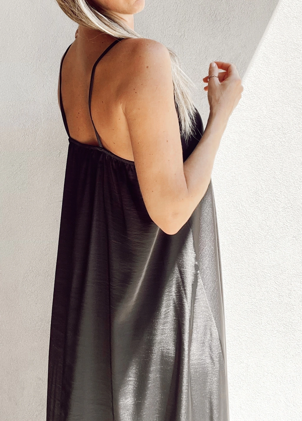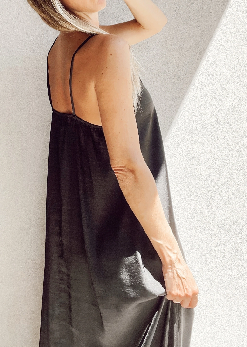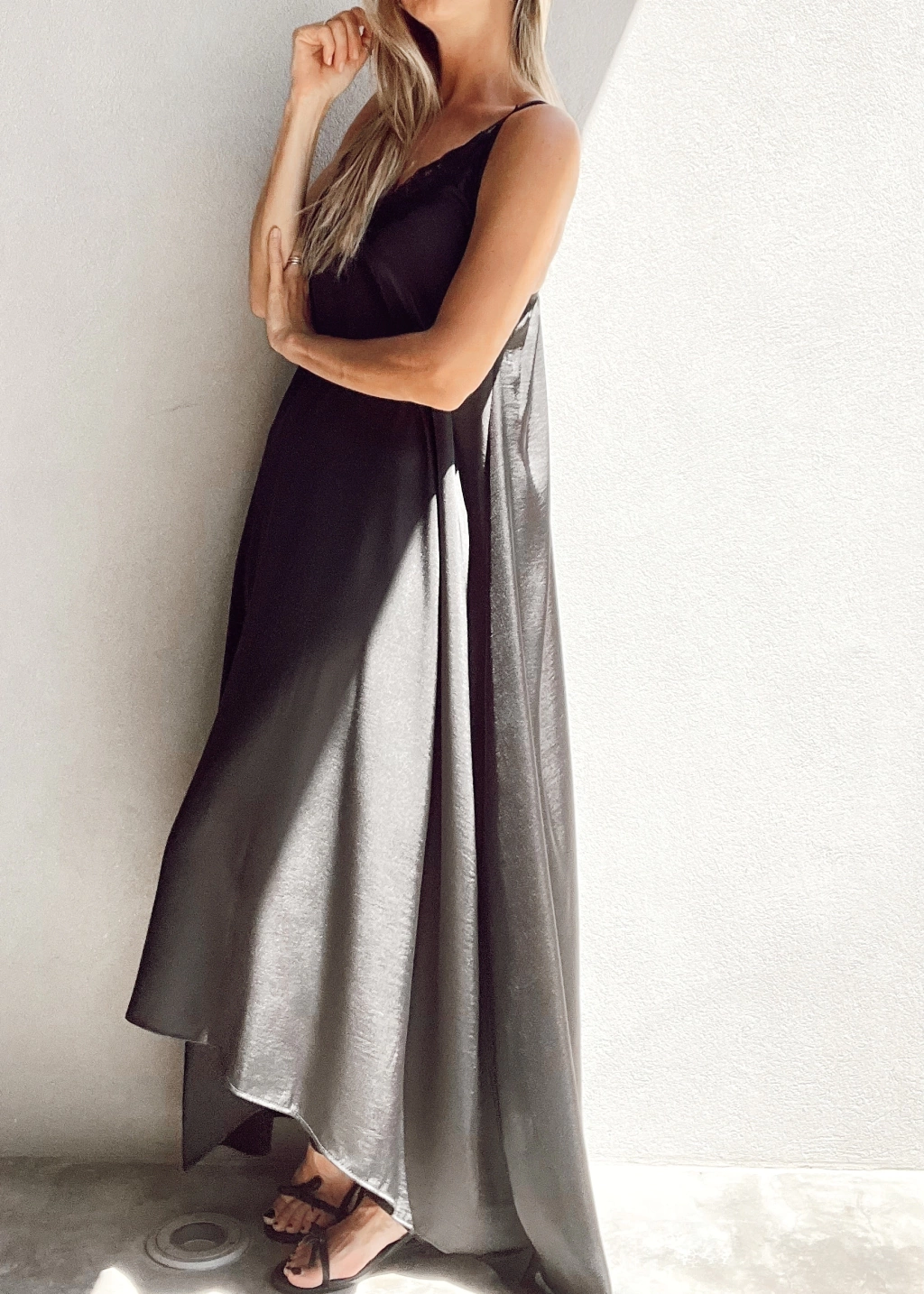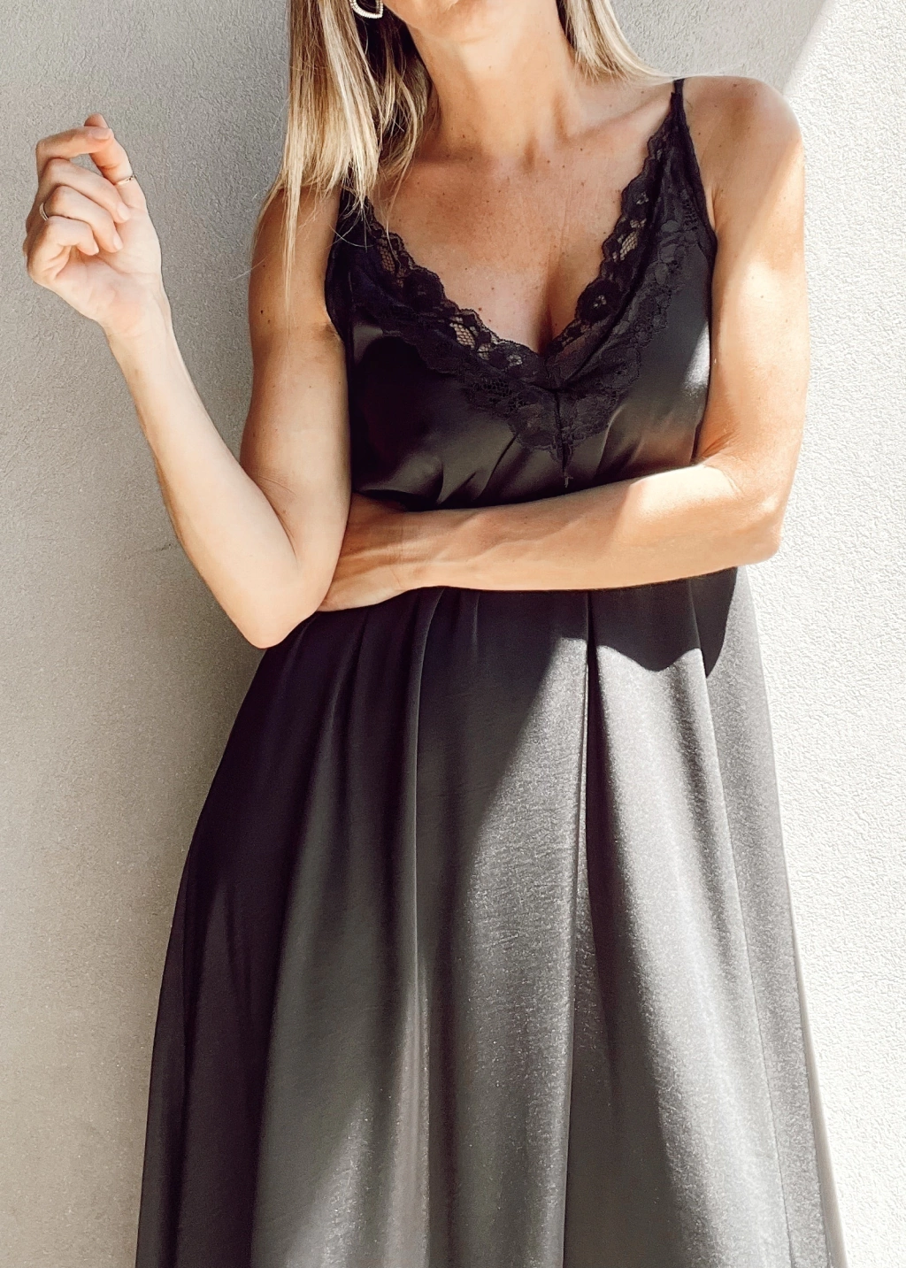Vestido lencero escote en v con encaje, breteles fijos, y espalda con elástico. Corte evase, más largo atrás que al frente.