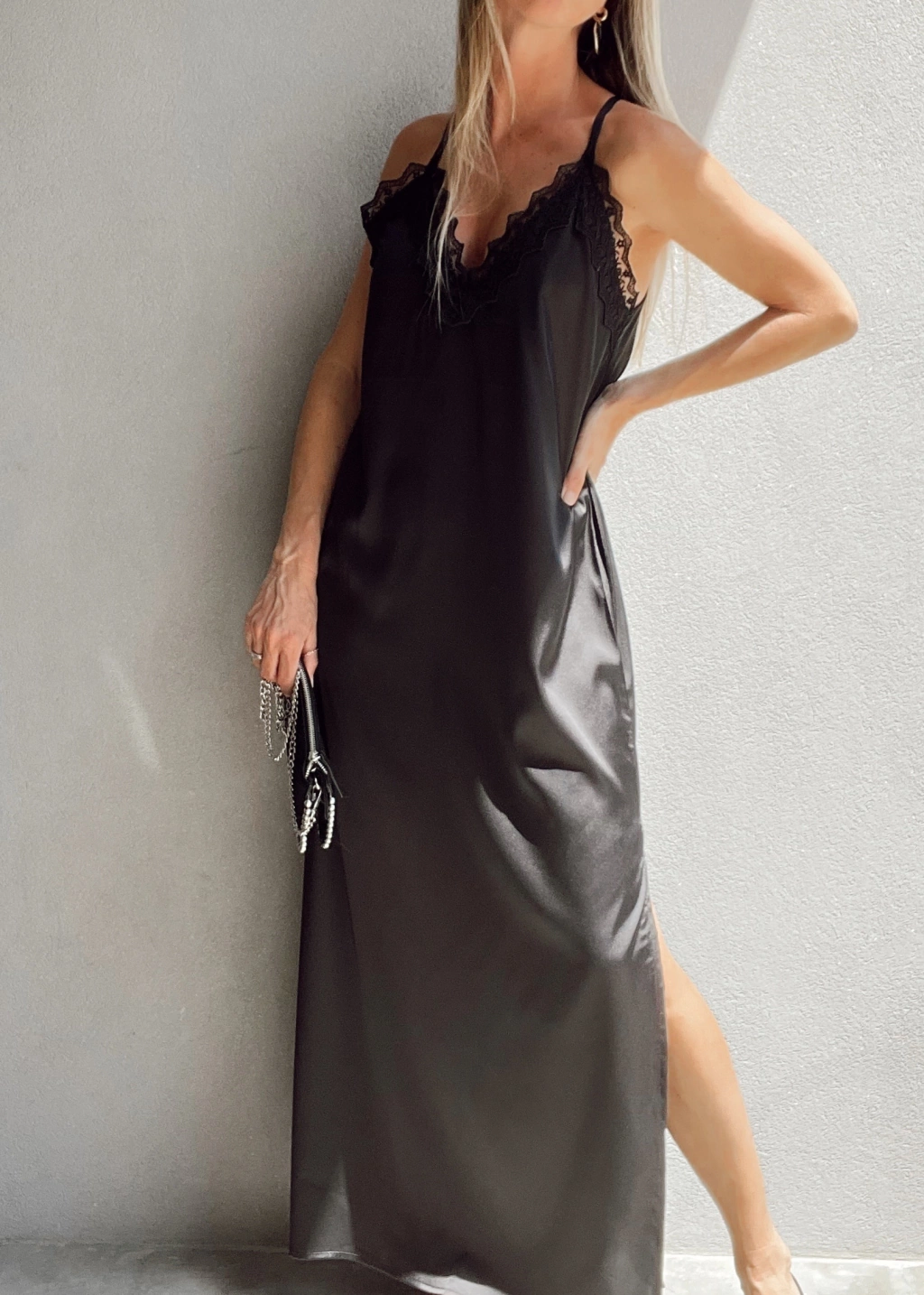 Vestido lencero con escote en v con encaje al frente, breteles fijos, espalda cerrada y posee tajo en el lado izquierdo.
